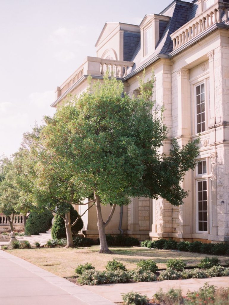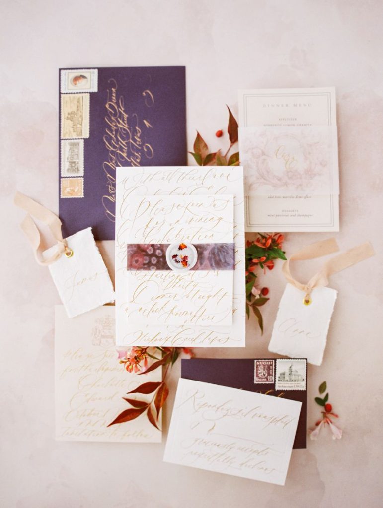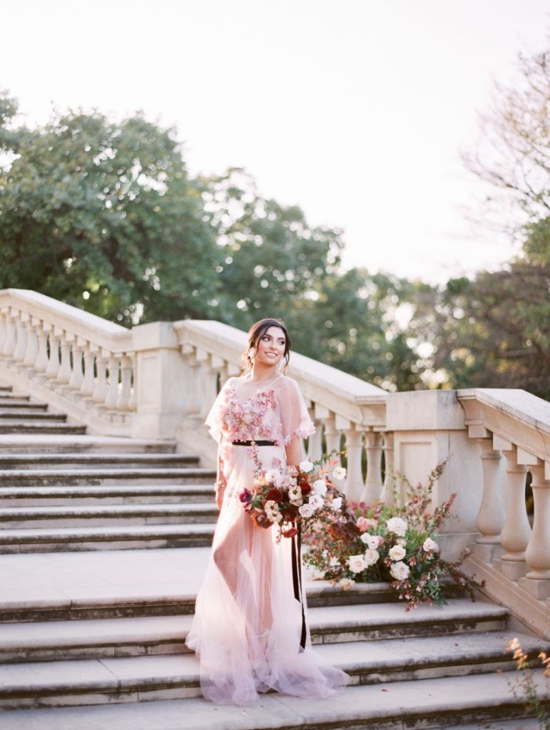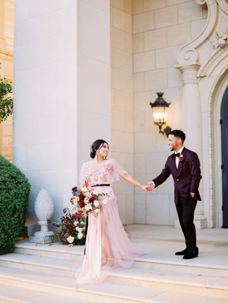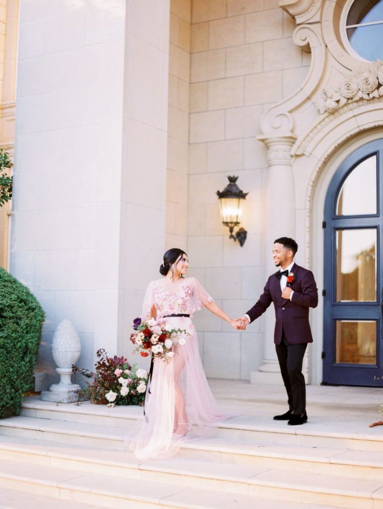 Even though this chic European romance wedding inspiration planned and designed by Lauren Field Design was set in North Texas, its gallery of photos from the talented Kristin La Voie Photography may convince you a venue as grand as The Olana is worth the drive! European-inspired and exquisite in every way, the sprawling property’s sculptural architecture and manicured lawn serve as a picture-perfect place for an indoor or outdoor affair. Tones of mauve, shades of plum, ochre and golden ivory create the most inviting autumnal-inspired palette while adding depth to whimsical yet sophisticated floral design. Modern and luxe in style, this bride and groom look so chic clad in haute wedding decor – with bride in a tulle bodysuit wedding gown covered in romantic 3D appliqué design and groom in a plum tux paired with black velvet loafers. Natural and feminine textures are layered alongside one another to create an elevated, European romance inspired wedding design that plays on both historic architectural elements as well as romantic, modern details. Read on for a note from planner Lauren Field Design about the vision behind this styled shoot’s upscale design and styling. Cheers!