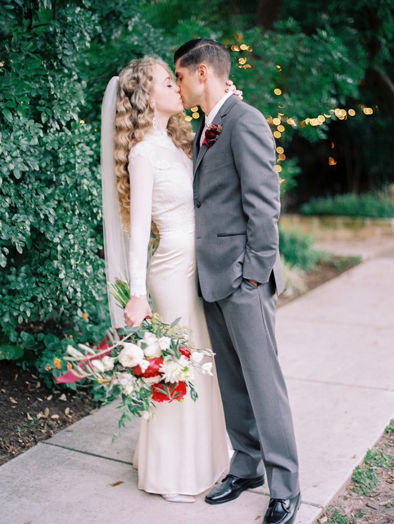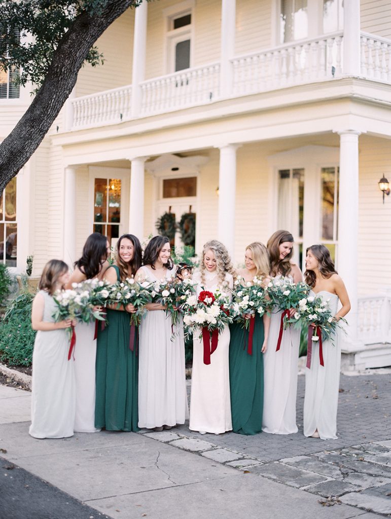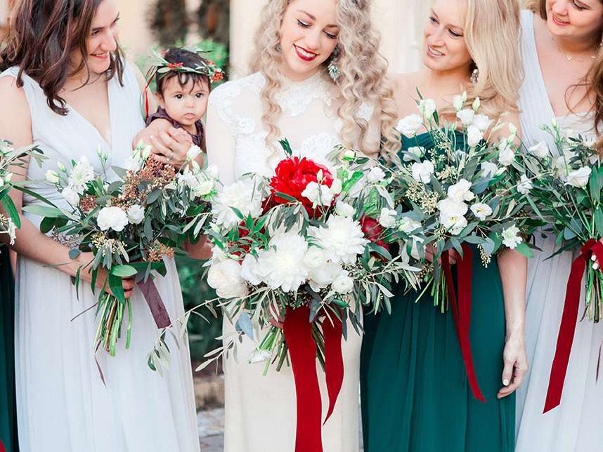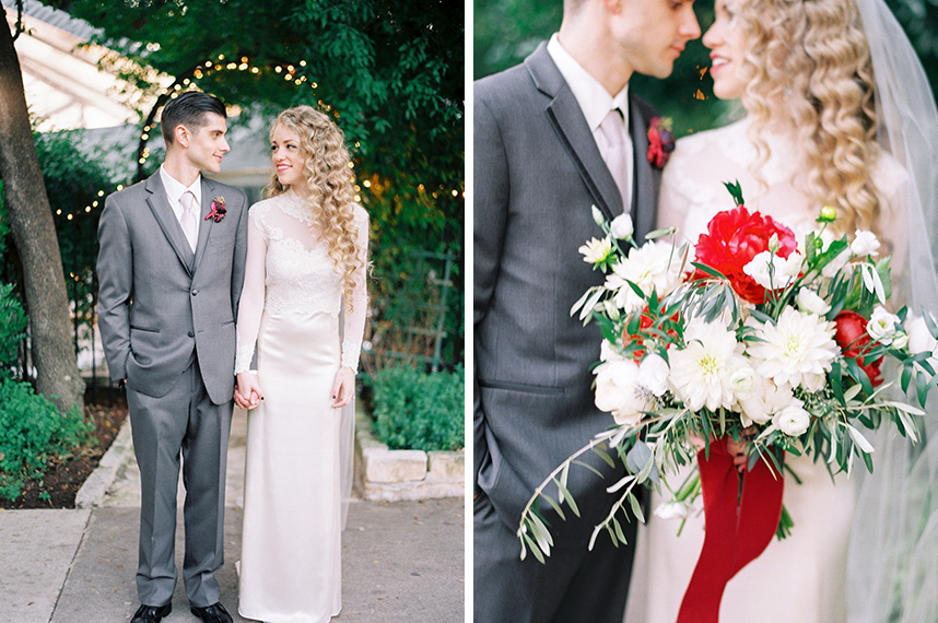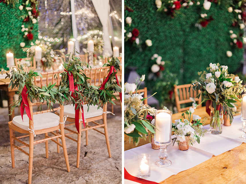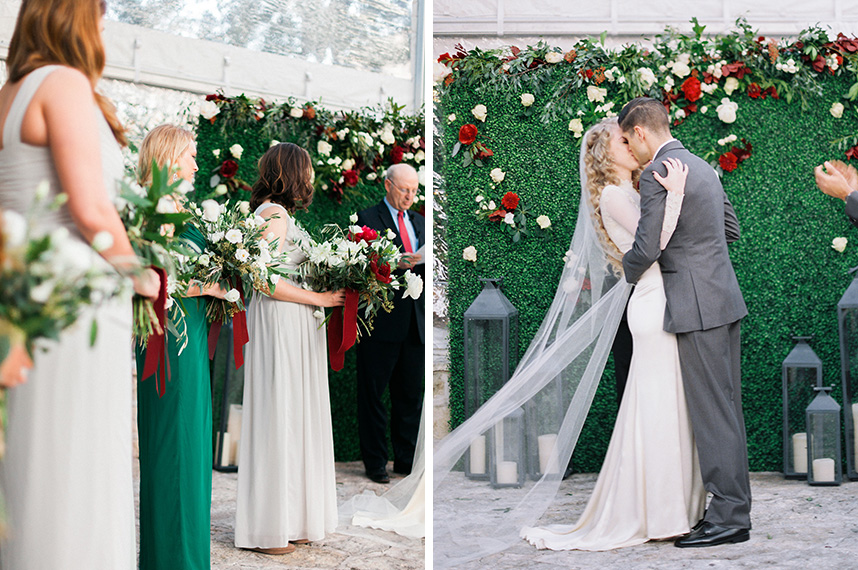 Austin couple Rachel and Gabe embraced the beauty of the season with their festive winter Austin wedding, and we just adore every gorgeous detail! Austin wedding florist Merveille Events created the most stunning floral arrangements with lush green ivy and colorful pops of red. The ornate altar is the perfect backdrop to say “I do,” and each and every floral detail from the bouquets to the chair treatments is a complete showstopper! Premiere Events provided the decor and rentals which add to the romantic holiday mood. What a perfect celebration for such a joyful time of year. Cheers to Rachel and Gabe!