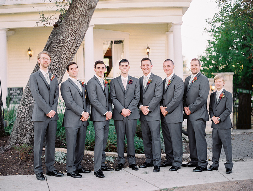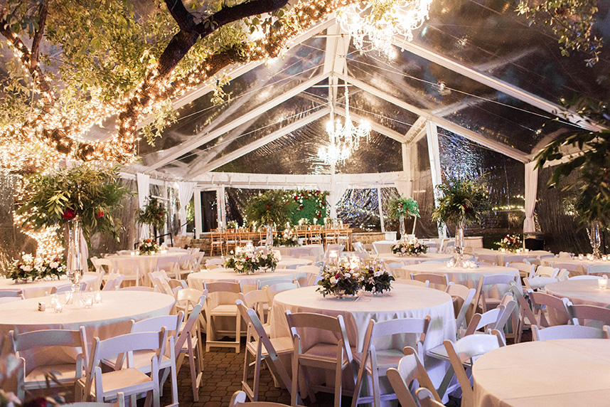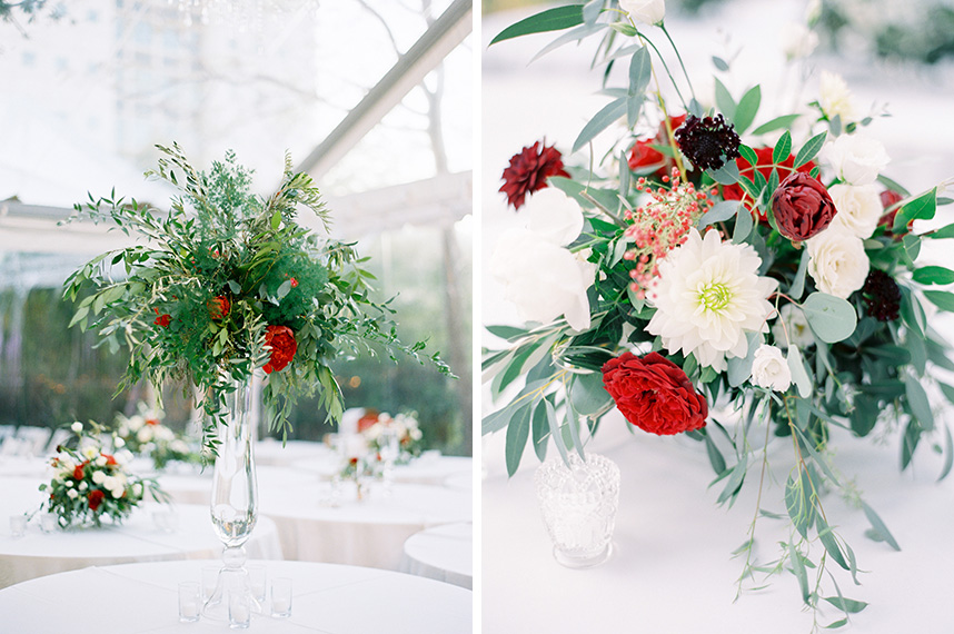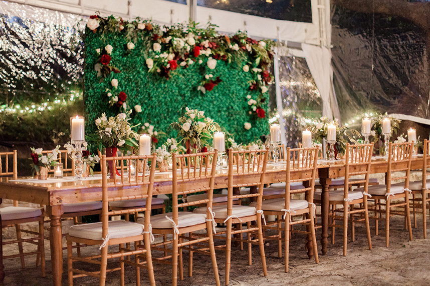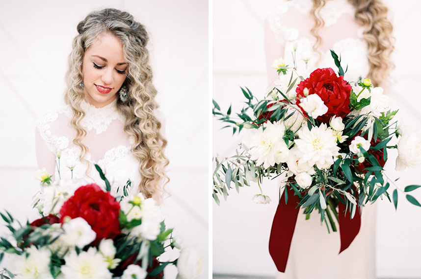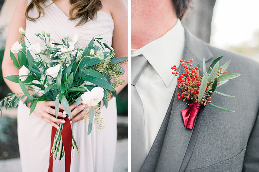 Austin couple Rachel and Gabe embraced the beauty of the season with their festive winter Austin wedding, and we just adore every gorgeous detail! Austin wedding florist Merveille Events created the most stunning floral arrangements with lush green ivy and colorful pops of red. The ornate altar is the perfect backdrop to say “I do,” and each and every floral detail from the bouquets to the chair treatments is a complete showstopper! Premiere Events provided the decor and rentals which add to the romantic holiday mood. What a perfect celebration for such a joyful time of year. Cheers to Rachel and Gabe!