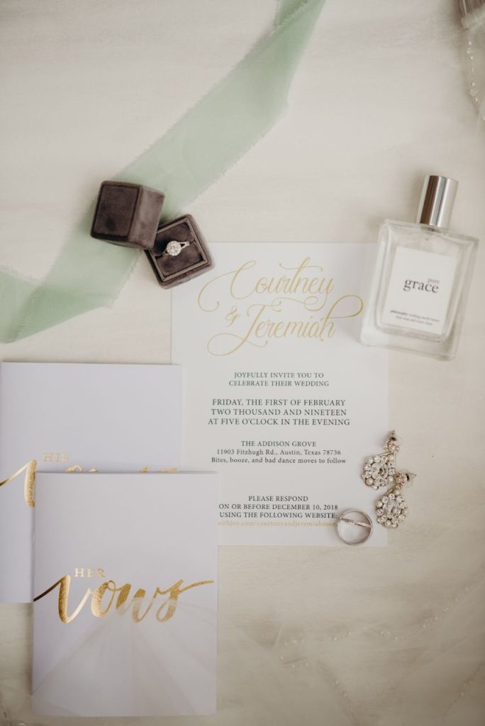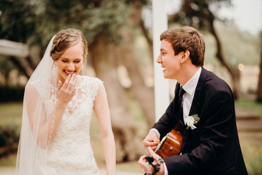 From the bride: “My favorite memory from the wedding is when Jeremiah sang me a song that he had written himself. It was so sweet and explained our story in the simplest of terms. Jeremiah said that his favorite memory was right before that when we did our first look. I came up behind him and was making jokes so he was already laughing, and then I turned him around so that he could see me in my wedding dress for the first time. He gave the sweetest reaction, and it reminded me why I love him so much!”
