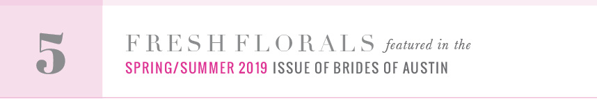 Starting today, we are counting down to the cover of the all-new issue of Brides of Austin! We’re kicking things off with five must-see floral arrangements gracing the pages of the Spring/Summer 2019 mag. You’ll find these beautiful blooms throughout the pages of the newest issue, along with plenty more floral inspiration from some of Austin’s top wedding florists! Be sure to keep checking back this week as we give little glimpses into some of our favorite details in the upcoming mag! Cheers!