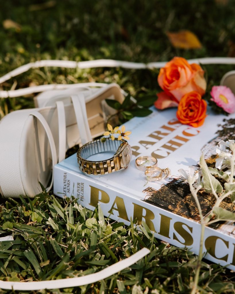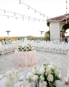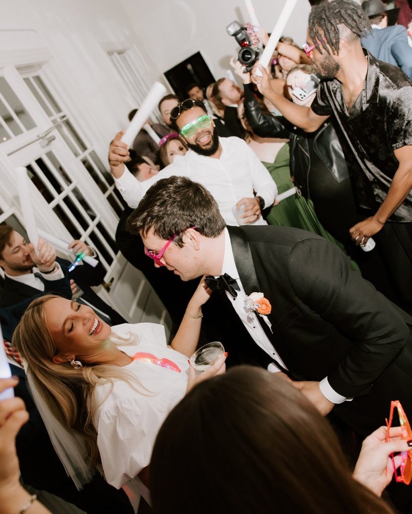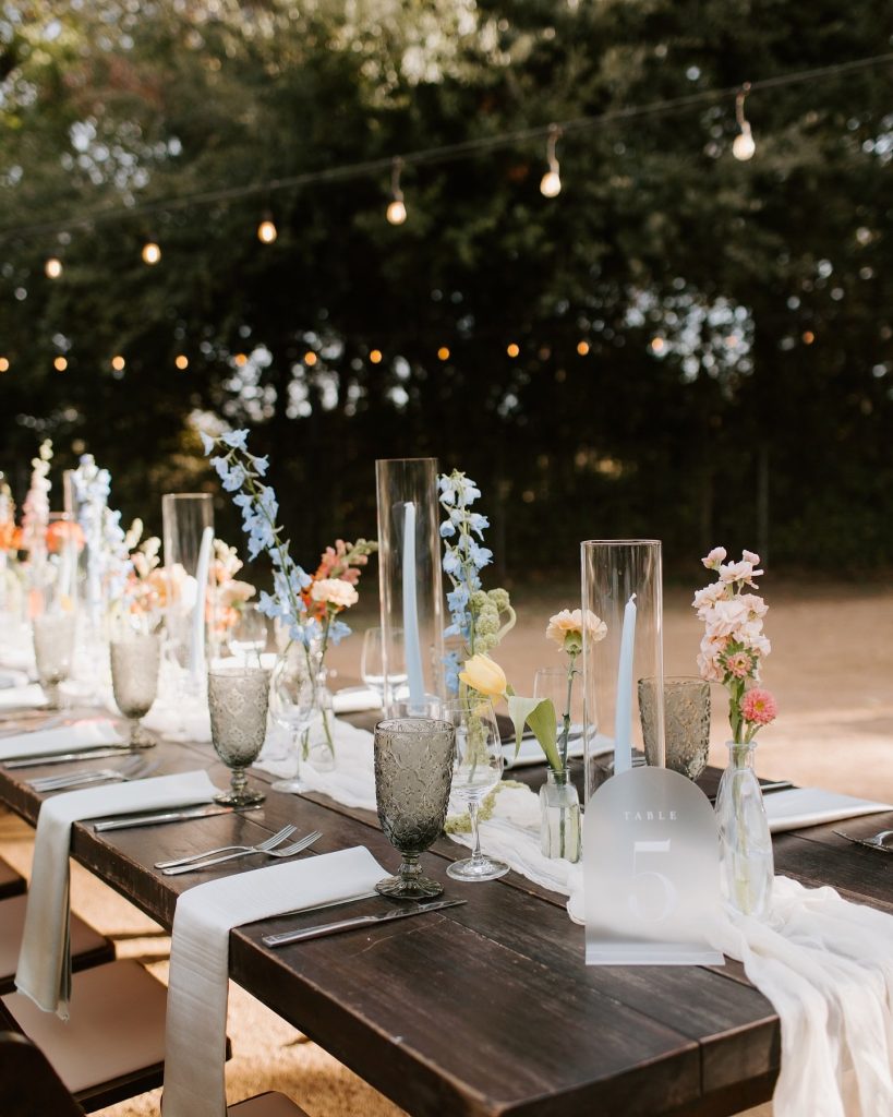 After the “I dos,” guests were invited outdoors for an open-air dinner under the star. Round tables filled the Springdale Station set with glowing candles, vibrant blooms, and thoughtful details that reflected the couple’s style. String lights twinkled overhead as friends and family toasted Frankie and Collin beneath a canopy of trees just starting to turn.