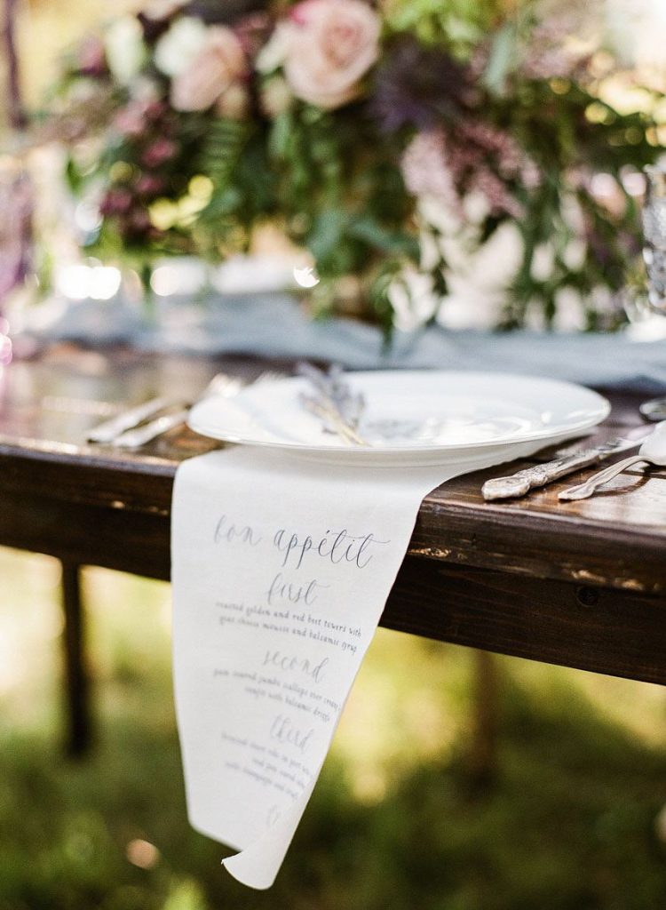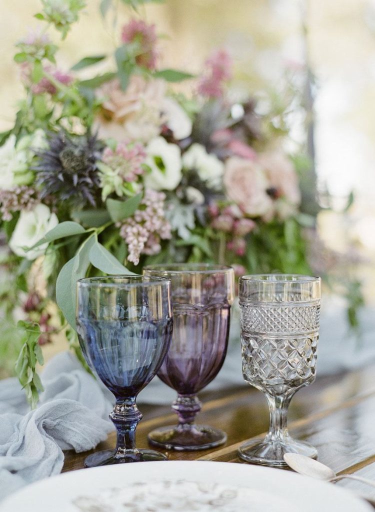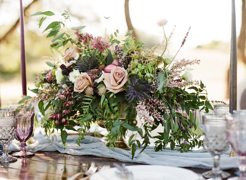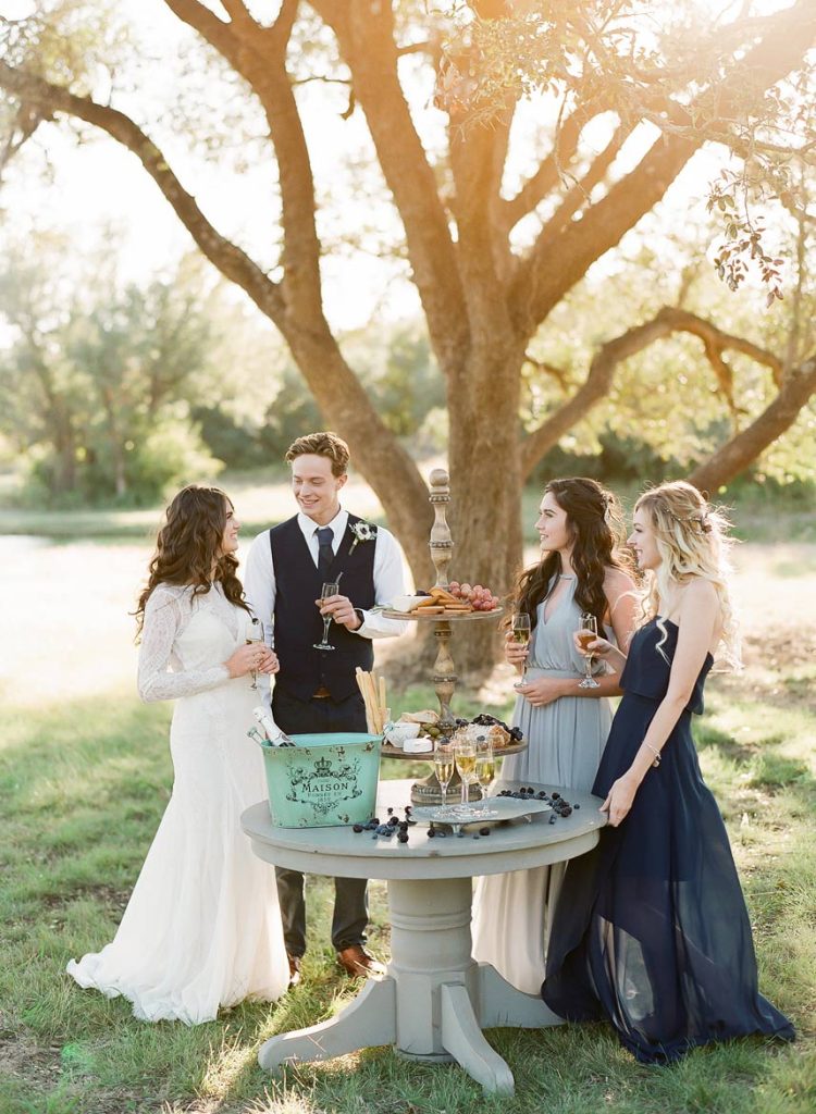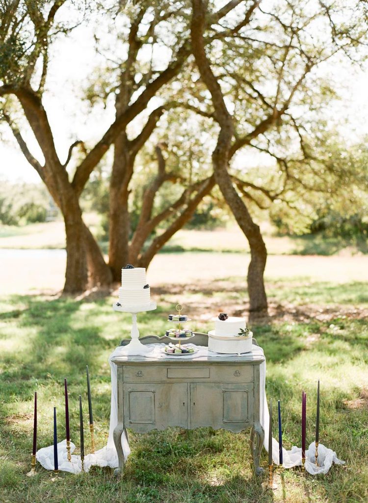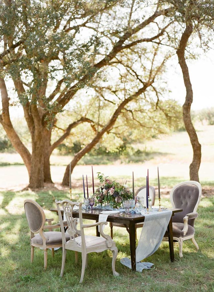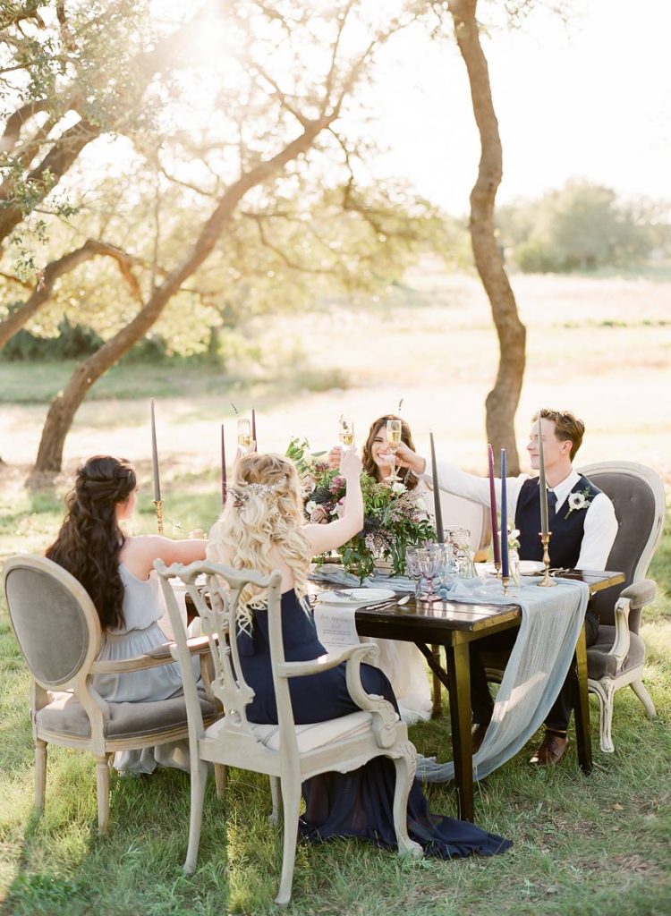 This dreamy French countryside wedding inspiration shoot at Ma Maison has us yearning for summer. From the lush floral, rich with blue and lavender tones, to the macarons and champagne, we can’t help but say “oui” to this style! A collaboration between local Austin vendors, this styled shoot from Mint Photography incorporates pieces from Loot Vintage Rentals — adding a touch of vintage sophistication to the golden outdoor setting. We love the hors d’oeuvre table, featuring a charcuterie spread and blueberry lavender drink garnishes — even the blueberry ice used for the champagne bucket. The small bridal party table provides an intimate dinner atmosphere and the dessert bar with treats from Simon Lee Bakery adds a sweet touch to the offerings. By mirroring the floral colors in the vintage glass drinkware, stemmed candles and paper suite by Peach Paper Design, the team brought the French countryside to life in the heart of Austin. We love every special small detail, right down to the engraving on the cheese knife! In lieu of a traditional veil, the team opted for a gorgeous floral crown, a perfect touch to accentuate the romance of the photo shoot and complement the bouquet, centerpieces and groom’s boutonniere. If you’re looking for an elegant yet bohemian style, we recommend taking notes from this French countryside wedding.