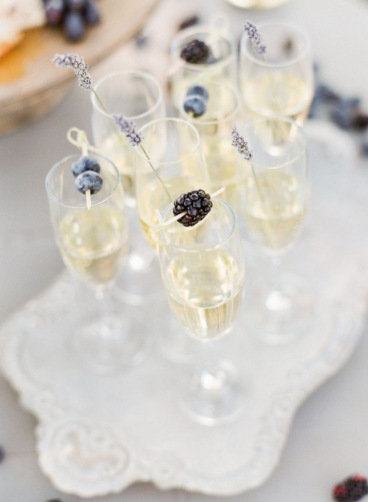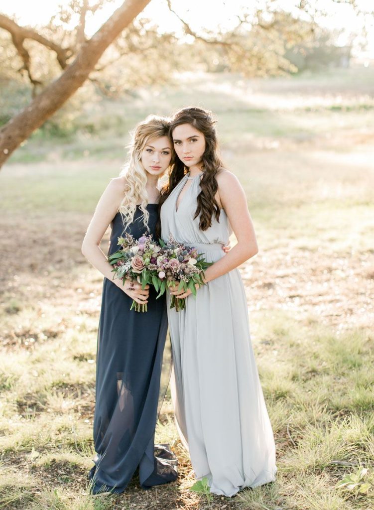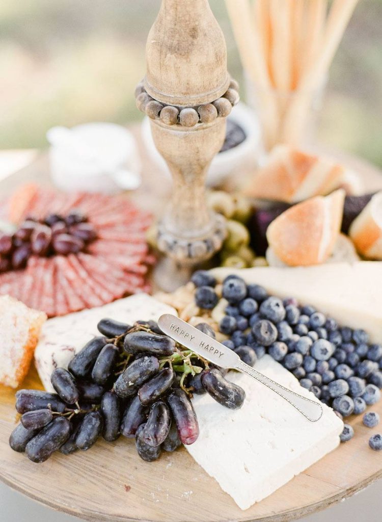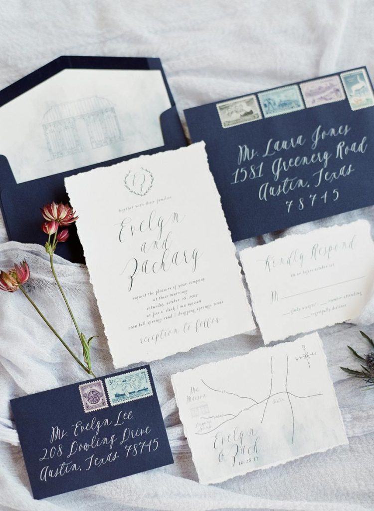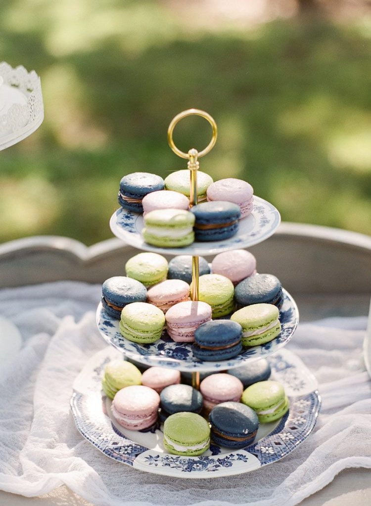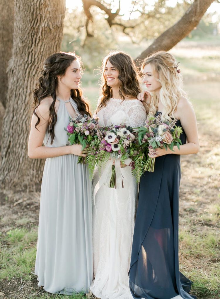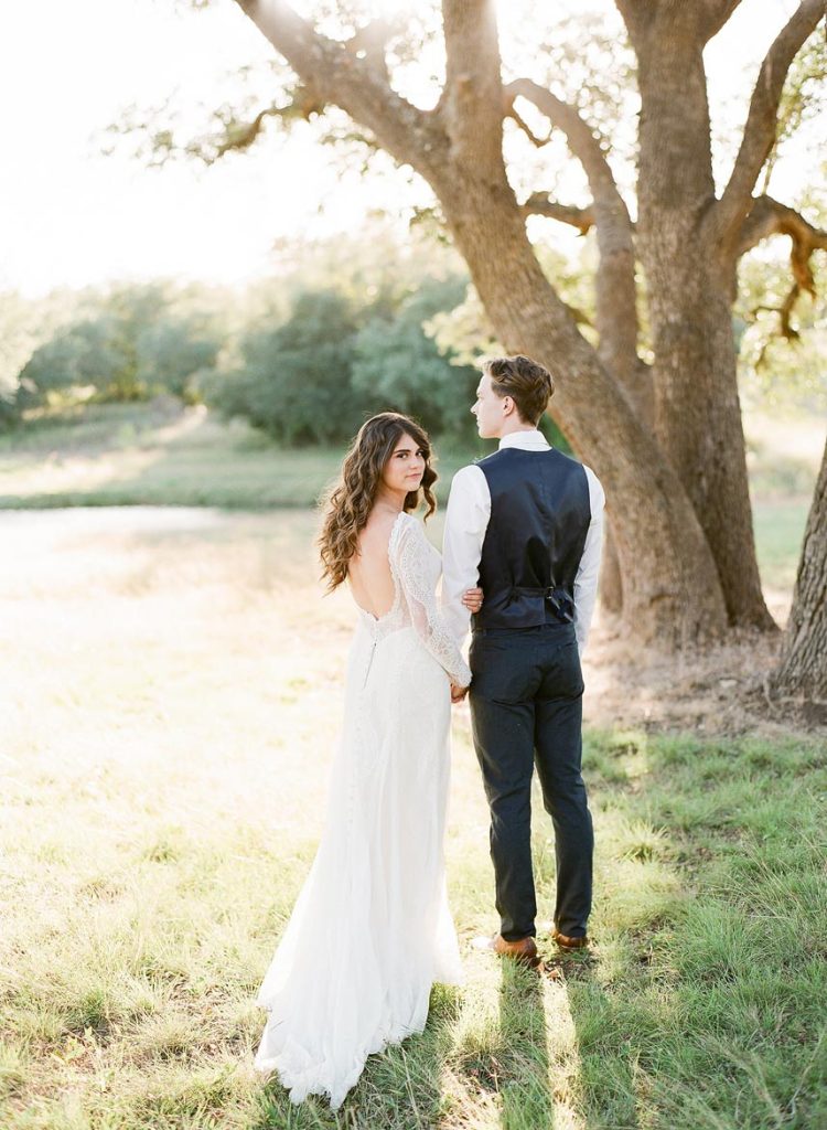 This dreamy French countryside wedding inspiration shoot at Ma Maison has us yearning for summer. From the lush floral, rich with blue and lavender tones, to the macarons and champagne, we can’t help but say “oui” to this style! A collaboration between local Austin vendors, this styled shoot from Mint Photography incorporates pieces from Loot Vintage Rentals — adding a touch of vintage sophistication to the golden outdoor setting. We love the hors d’oeuvre table, featuring a charcuterie spread and blueberry lavender drink garnishes — even the blueberry ice used for the champagne bucket. The small bridal party table provides an intimate dinner atmosphere and the dessert bar with treats from Simon Lee Bakery adds a sweet touch to the offerings. By mirroring the floral colors in the vintage glass drinkware, stemmed candles and paper suite by Peach Paper Design, the team brought the French countryside to life in the heart of Austin. We love every special small detail, right down to the engraving on the cheese knife! In lieu of a traditional veil, the team opted for a gorgeous floral crown, a perfect touch to accentuate the romance of the photo shoot and complement the bouquet, centerpieces and groom’s boutonniere. If you’re looking for an elegant yet bohemian style, we recommend taking notes from this French countryside wedding.