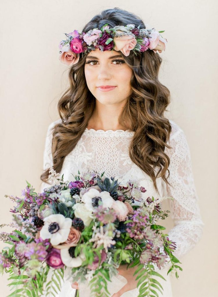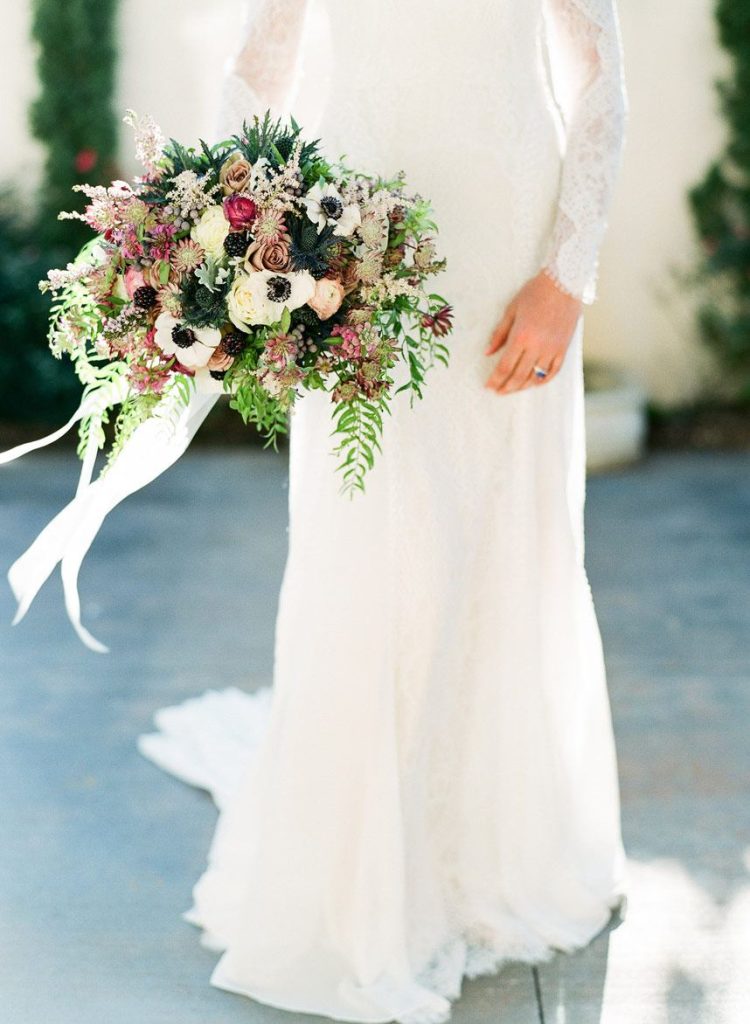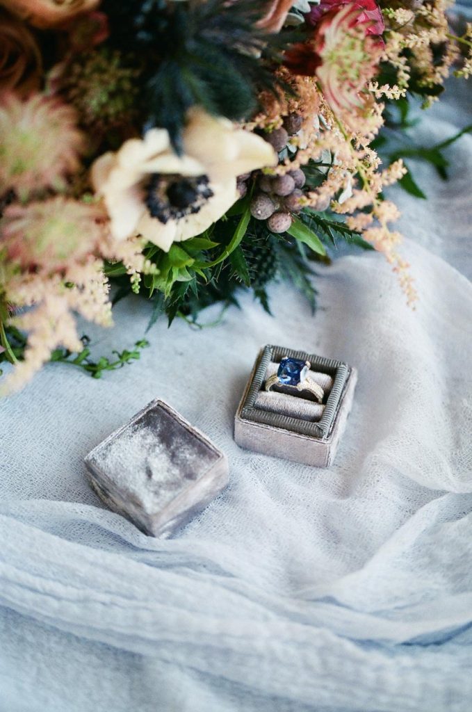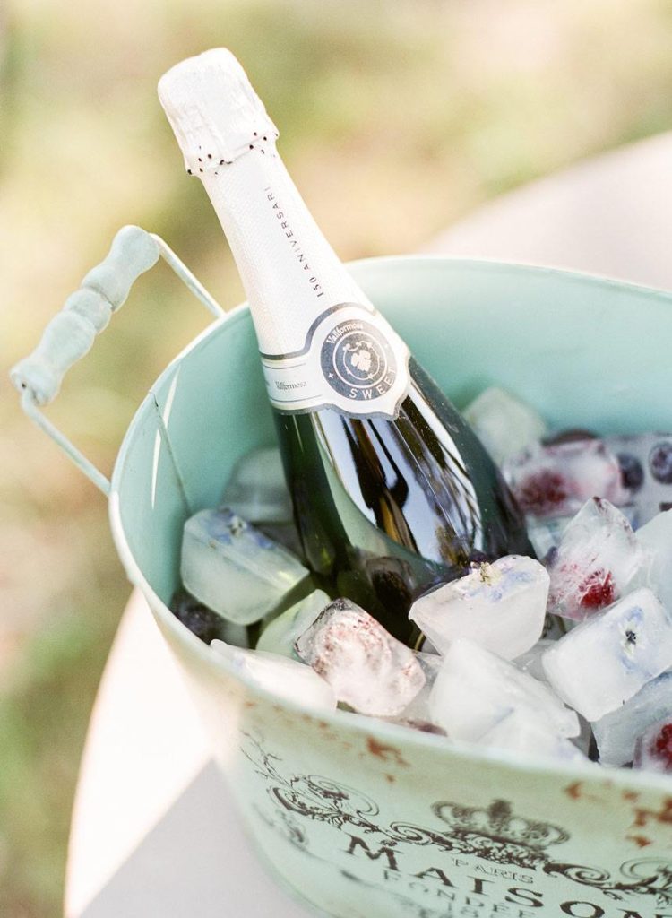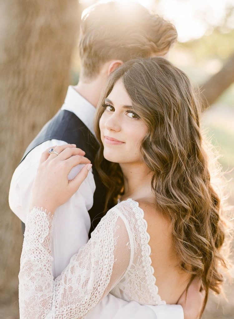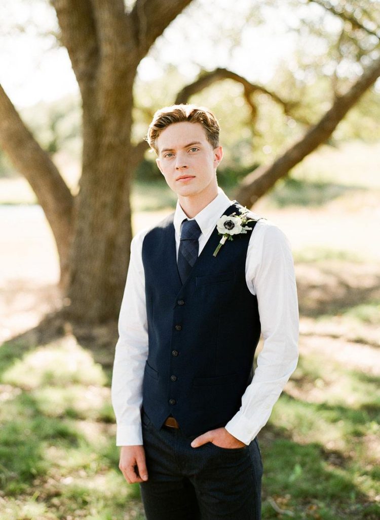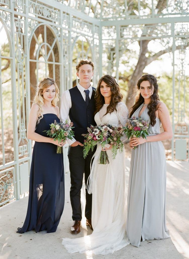 This dreamy French countryside wedding inspiration shoot at Ma Maison has us yearning for summer. From the lush floral, rich with blue and lavender tones, to the macarons and champagne, we can’t help but say “oui” to this style! A collaboration between local Austin vendors, this styled shoot from Mint Photography incorporates pieces from Loot Vintage Rentals — adding a touch of vintage sophistication to the golden outdoor setting. We love the hors d’oeuvre table, featuring a charcuterie spread and blueberry lavender drink garnishes — even the blueberry ice used for the champagne bucket. The small bridal party table provides an intimate dinner atmosphere and the dessert bar with treats from Simon Lee Bakery adds a sweet touch to the offerings. By mirroring the floral colors in the vintage glass drinkware, stemmed candles and paper suite by Peach Paper Design, the team brought the French countryside to life in the heart of Austin. We love every special small detail, right down to the engraving on the cheese knife! In lieu of a traditional veil, the team opted for a gorgeous floral crown, a perfect touch to accentuate the romance of the photo shoot and complement the bouquet, centerpieces and groom’s boutonniere. If you’re looking for an elegant yet bohemian style, we recommend taking notes from this French countryside wedding.