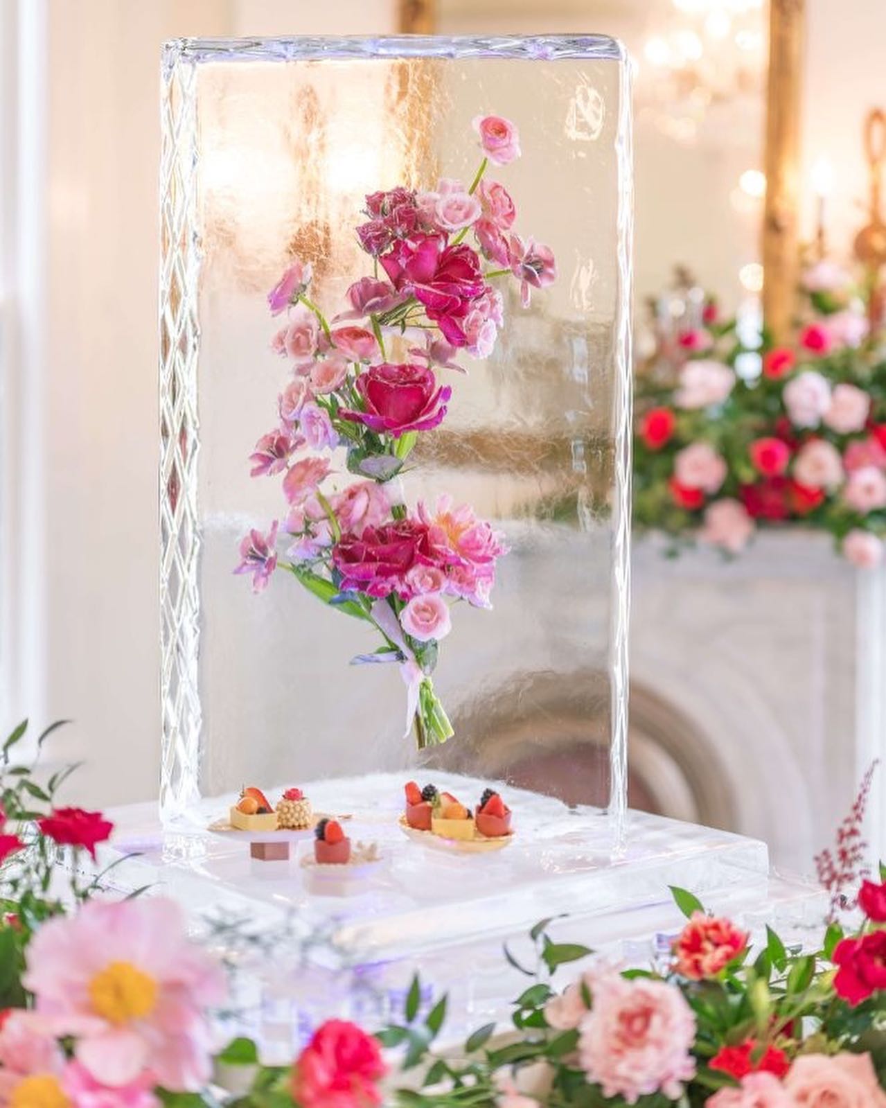 Perfect for weddings, Full Spectrum offers floral-infused ice sculptures to add a pop of color to your crystal-clear masterpiece. The company can freeze fresh blooms into your arrangement or add an entire bouquet into one of their sculptures. Either choice will add beautiful hues, creating a cohesive and elegant look.