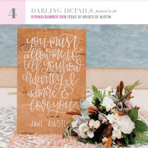 As our countdown to the new Brides of Austin Fall/Winter 2020 cover continues, we’re excited to preview four darling details we know you’ll love! We get heart eyes seeing the personal touches couples put into their big day, and these four wedding details stopped us right in our tracks! Enjoy these four darling details, and as you’re flipping through the pages of the new mag be sure to flag your favorites! Stay tuned to the blog as we continue to countdown to the cover over the next few days!