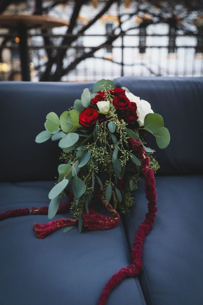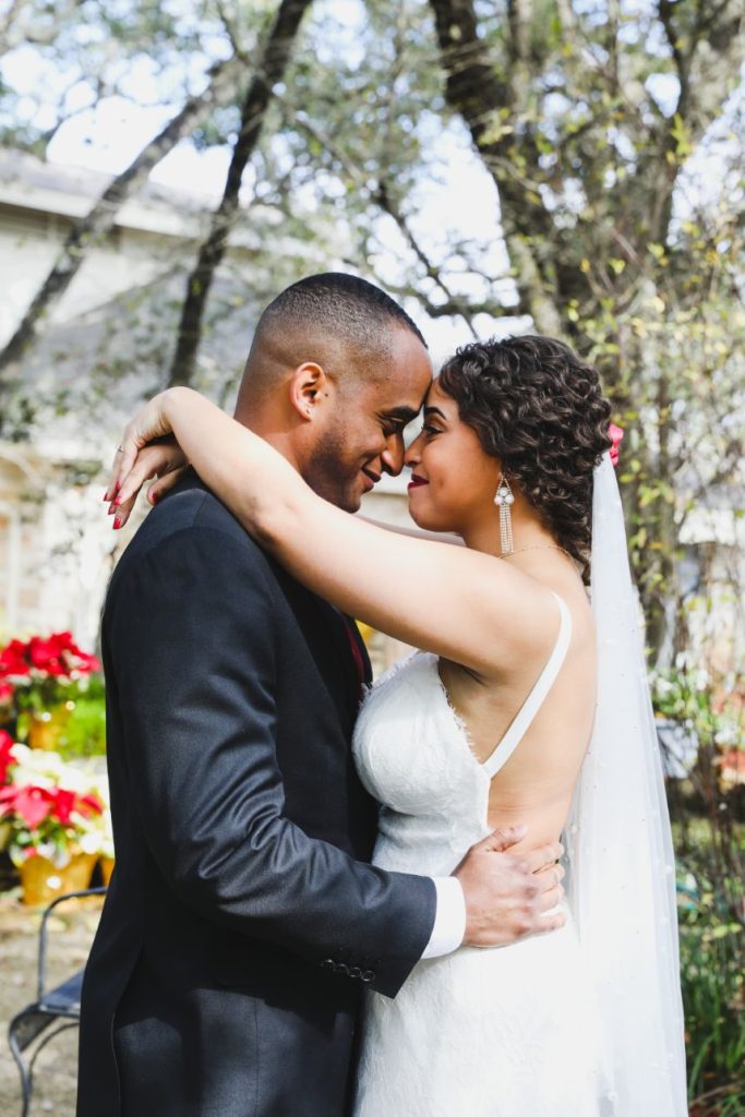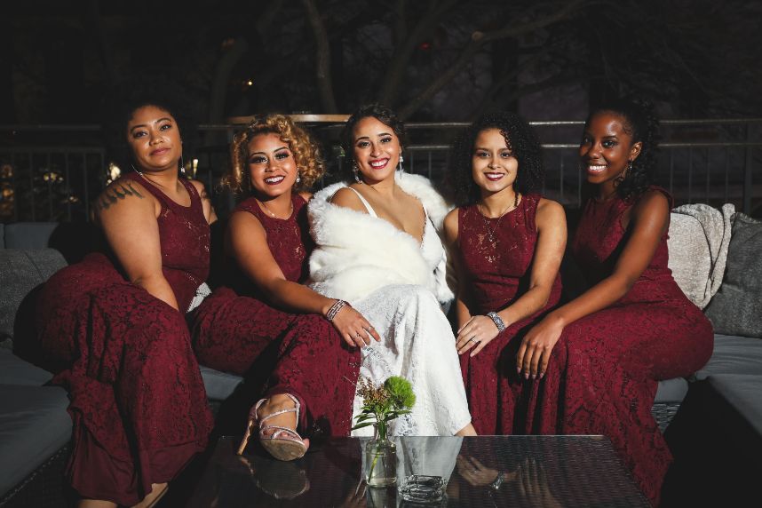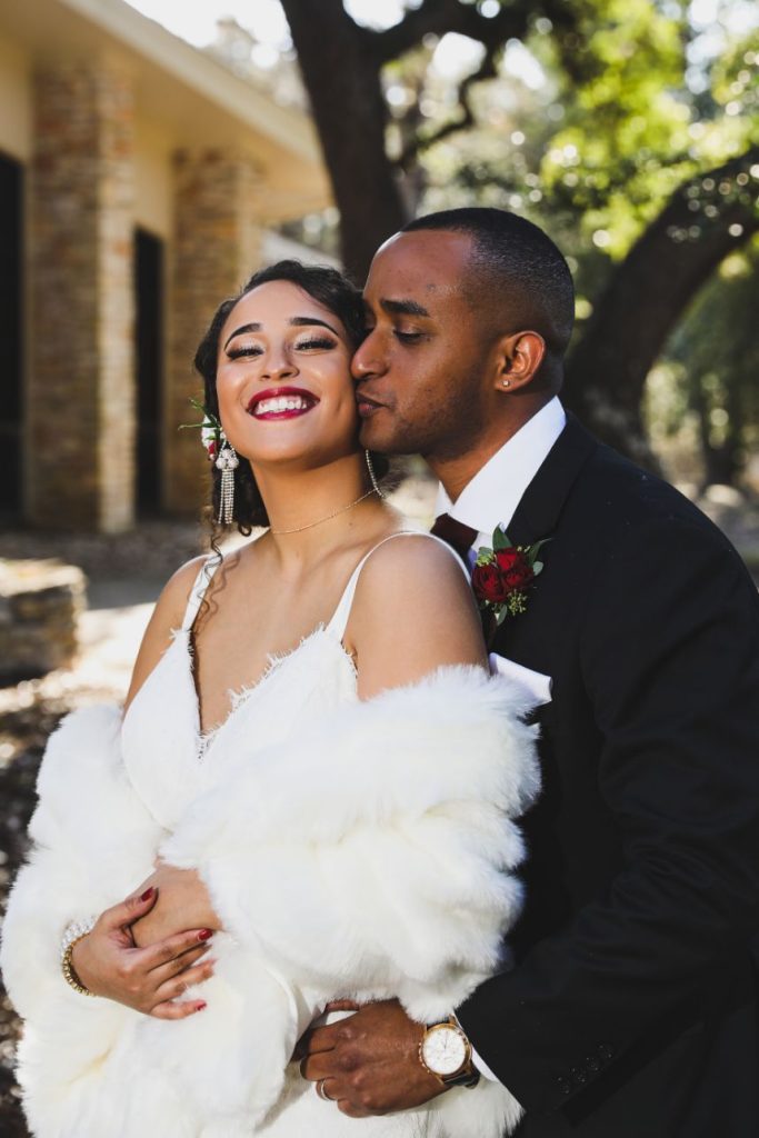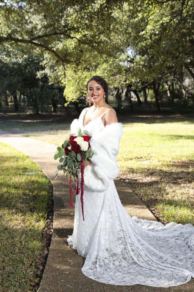 Neomary Soriano-Calderon and Anthony Lasso’s garden chic Austin wedding features a moody color palette of burgundy, green and gold – perfect for this seasonal soiree! This wintery wedding had beautiful floral elements, featuring vibrant red roses, soft eucalyptus and trailing amaranthus galore, as well as savvy-chic yet simple decor. Every winter bride should take a cue from Neomary’s furry winter stole – the quintessential cold weather bridal accessory – which paired beautifully with her bridesmaids’ burgundy and lace, floor-length dresses. CCPhotoFactory, a local Austin wedding photographer, was in attendance to capture every detail of the newlyweds’ oh-so-special day. Read on for a note from the bride about her favorite wedding memory, and be sure to send a virtual cheers to Neomary and Anthony!