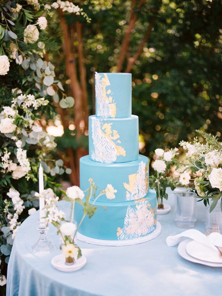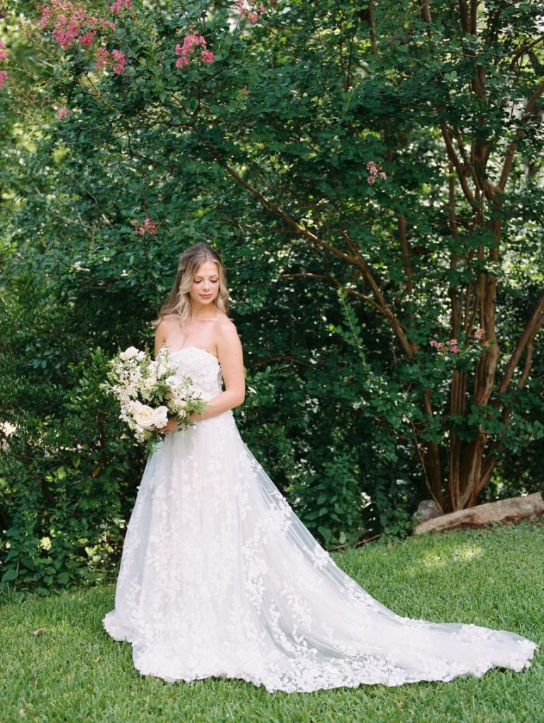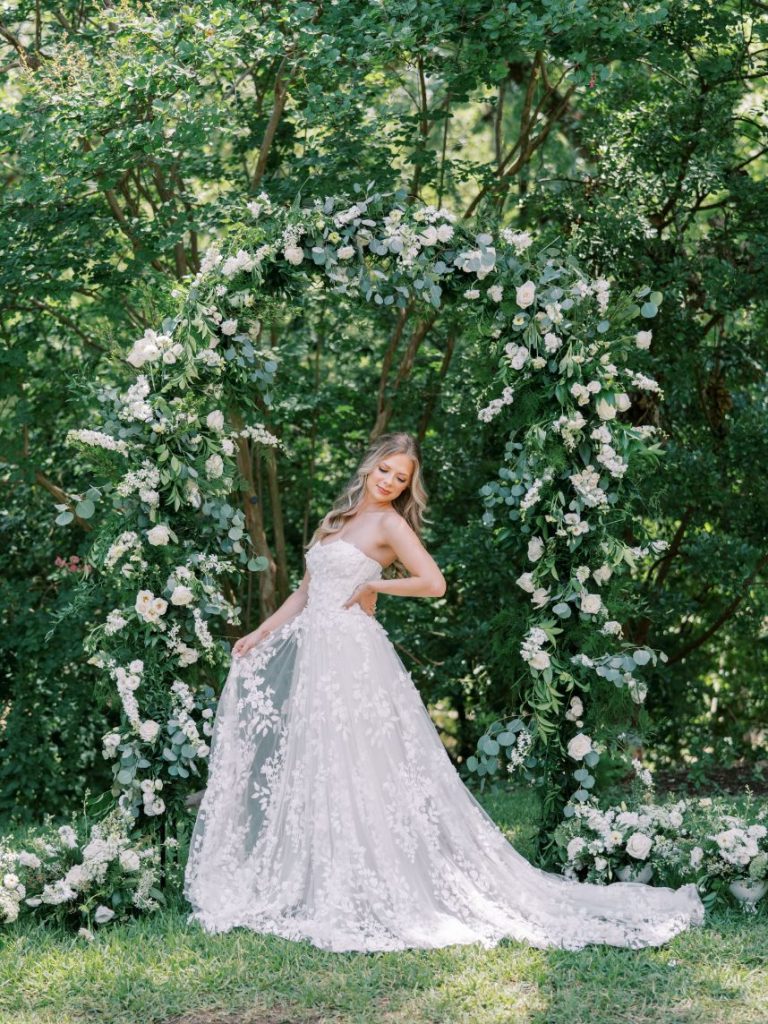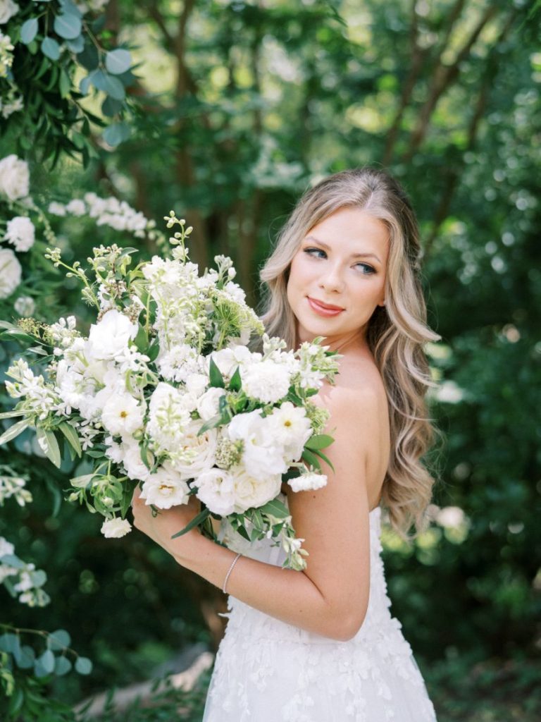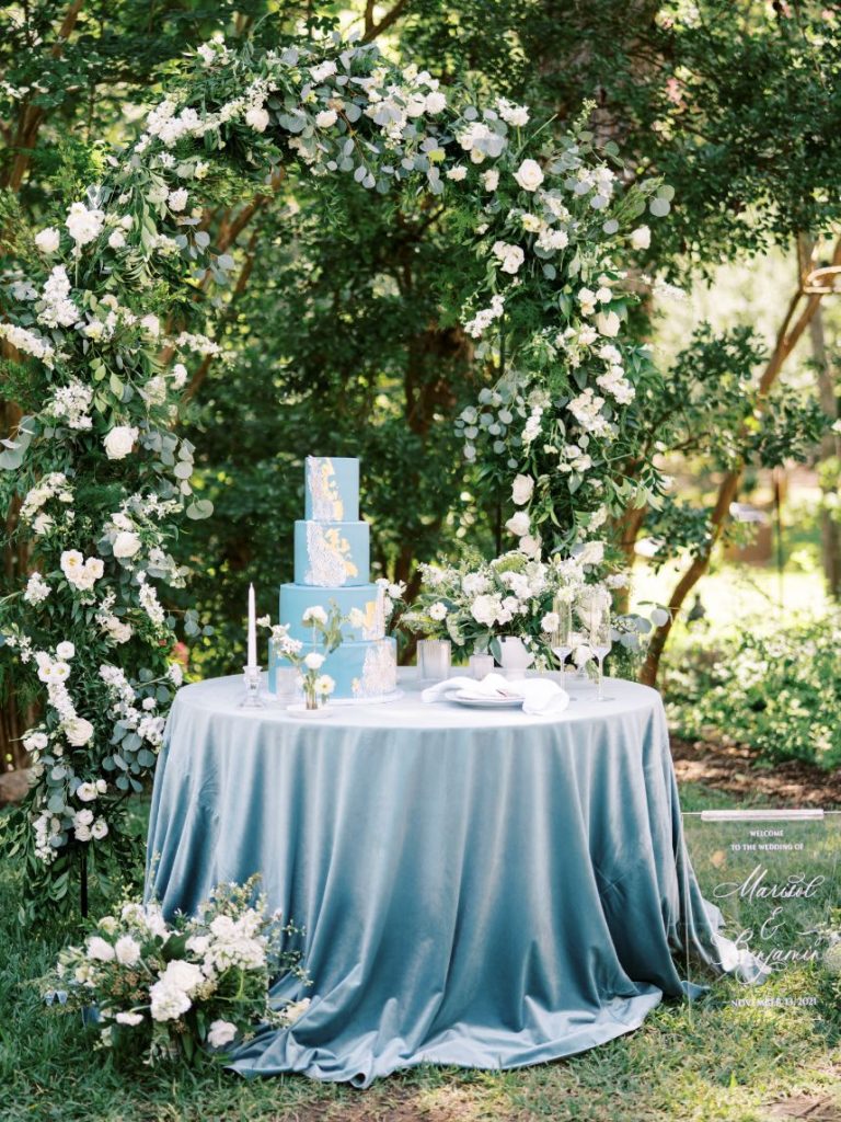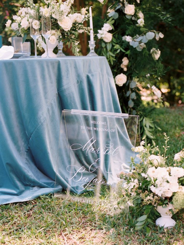 The garden sophisticate is a classy act to follow, with sights set on a more traditional wedding design that planner Middleton Events styled to be both luxe and effortless in mood! In the gallery below, Caitlin Rose Photography captured a secluded, secret garden vibe that will work with any number of guests, as long as the setting is as lush as UMLAUF Sculpture Garden + Museum where the serenity of nature and maturity of modern art meet. Enhance an intimate garden wedding with overgrown floral arrangements in varying white blooms from Reiley + Rose bringing even more romance into play. Exquisite was the bride’s strapless Unbridaled gown that she modeled among the greenery. A petal appliquéd piece of art, the gown’s open neckline encouraged Think Brink Beauty to style her with half-up hair and natural, rosy glam bridal makeup. Finally, a few dainty gems and fine jewelry from Nicole Mera complete the whole gorgeous look. Acrylic always adds a modern touch and this signage by Owl & Envelope is simply divine, its translucence making it not at all out-of-place with the natural scenery. An elegant seating chart led guests to an outdoor reception where crisp white linens pop on a baby blue tablescape that held décor, place settings and more from Whim Hospitality, plus seated with romantic, natural bentwood chairs. A few potted herbs added a continued garden feel to the mix and for something sweet at the end of the celebration, Sweet Treets Bakery created a blue, four-tiered wedding cake dream complete with gold leaf and agrarian details that tie in all the whimsical and organic aspects of the editorial. Read on for a note from planner Middleton Events who envisioned the design and styling of this garden sophisticate wedding inspiration. Cheers!
