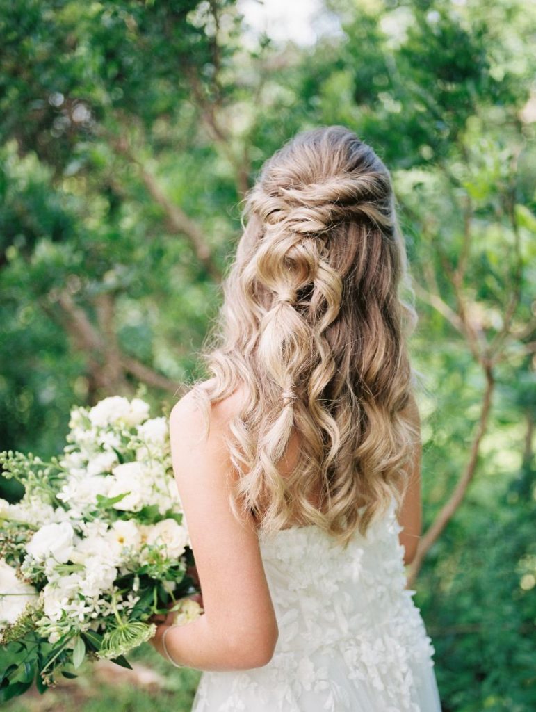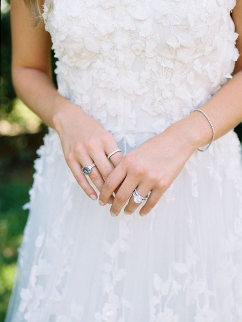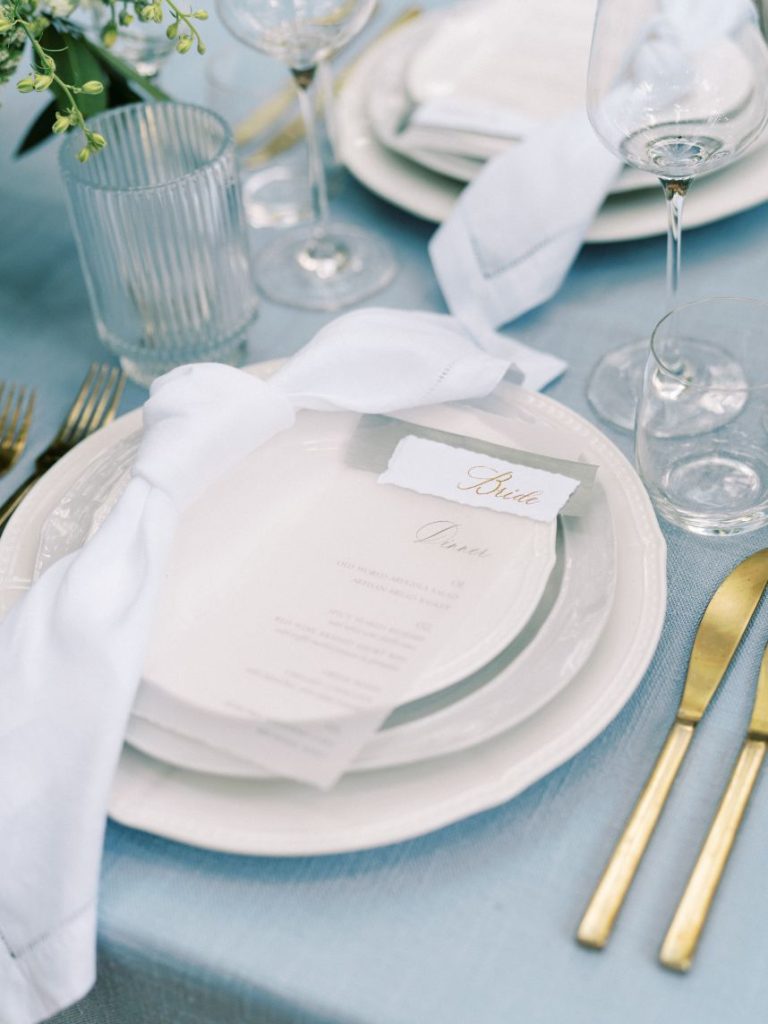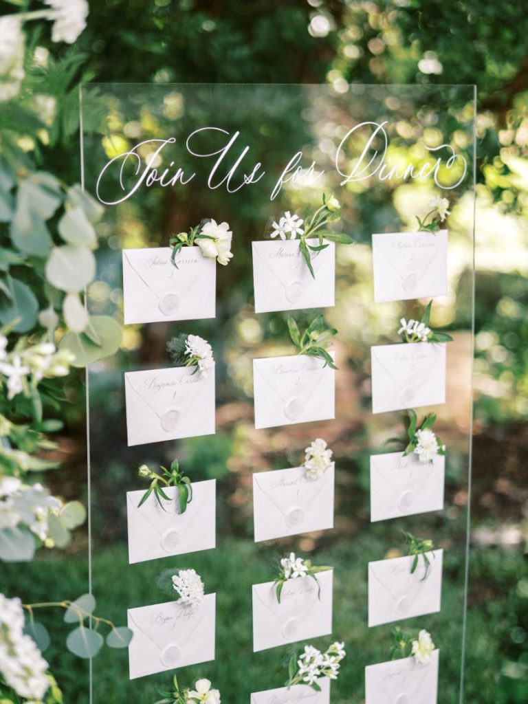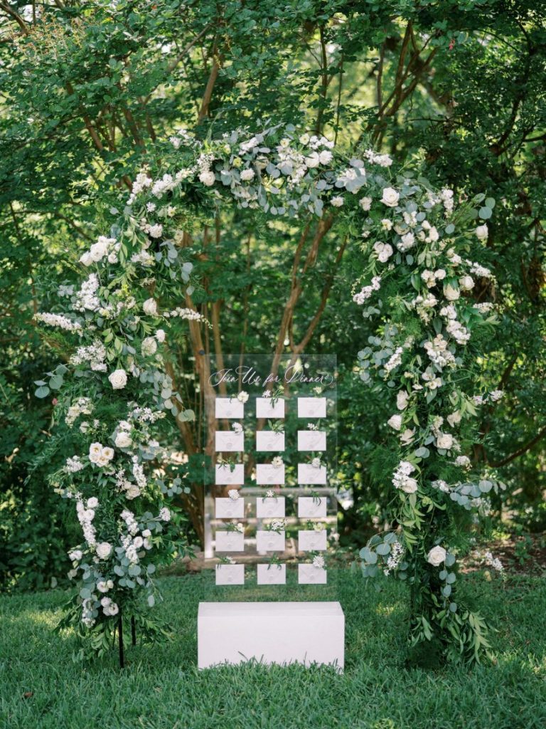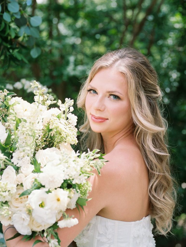 The garden sophisticate is a classy act to follow, with sights set on a more traditional wedding design that planner Middleton Events styled to be both luxe and effortless in mood! In the gallery below, Caitlin Rose Photography captured a secluded, secret garden vibe that will work with any number of guests, as long as the setting is as lush as UMLAUF Sculpture Garden + Museum where the serenity of nature and maturity of modern art meet. Enhance an intimate garden wedding with overgrown floral arrangements in varying white blooms from Reiley + Rose bringing even more romance into play. Exquisite was the bride’s strapless Unbridaled gown that she modeled among the greenery. A petal appliquéd piece of art, the gown’s open neckline encouraged Think Brink Beauty to style her with half-up hair and natural, rosy glam bridal makeup. Finally, a few dainty gems and fine jewelry from Nicole Mera complete the whole gorgeous look. Acrylic always adds a modern touch and this signage by Owl & Envelope is simply divine, its translucence making it not at all out-of-place with the natural scenery. An elegant seating chart led guests to an outdoor reception where crisp white linens pop on a baby blue tablescape that held décor, place settings and more from Whim Hospitality, plus seated with romantic, natural bentwood chairs. A few potted herbs added a continued garden feel to the mix and for something sweet at the end of the celebration, Sweet Treets Bakery created a blue, four-tiered wedding cake dream complete with gold leaf and agrarian details that tie in all the whimsical and organic aspects of the editorial. Read on for a note from planner Middleton Events who envisioned the design and styling of this garden sophisticate wedding inspiration. Cheers!