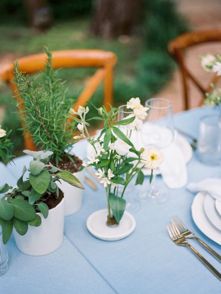 From the planner, Stephanie with Middleton Events: “My inspiration for the shoot was a secret garden. I wanted the tablescape design to incorporate garden elements like potted herbs, plants and neutral blooms to create a timeless and romantic scene. The UMLAUF Sculpture Garden + Museum was the perfect backdrop to have my vision come to life!”