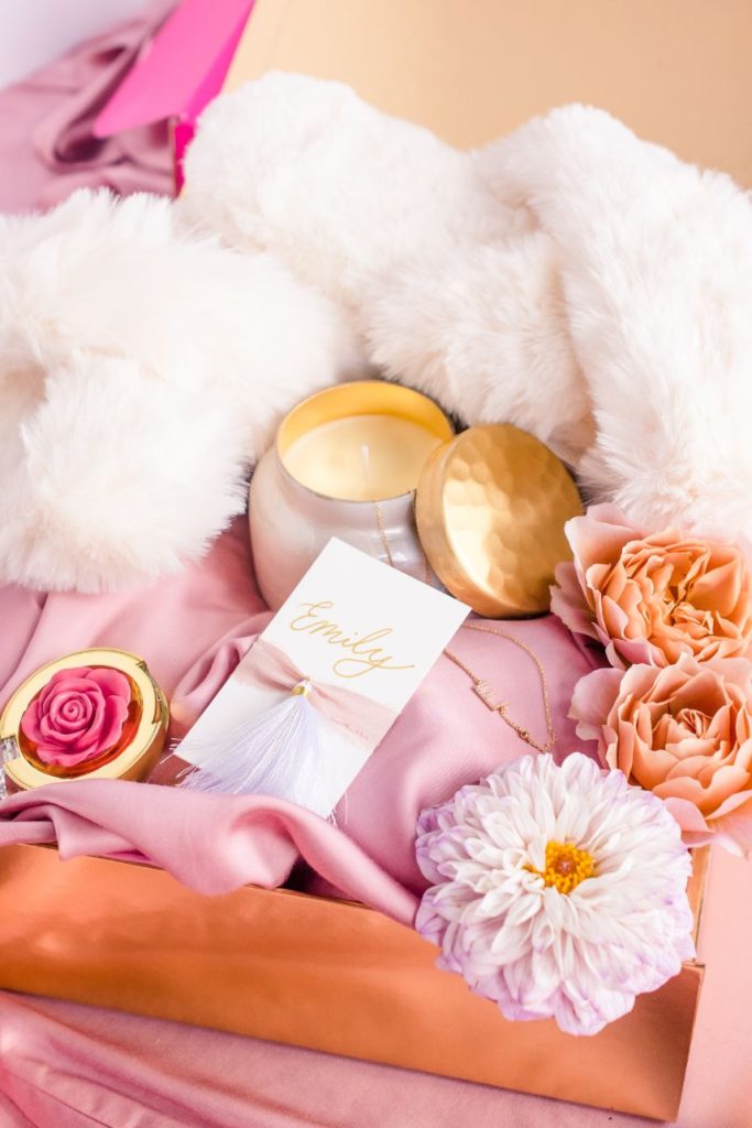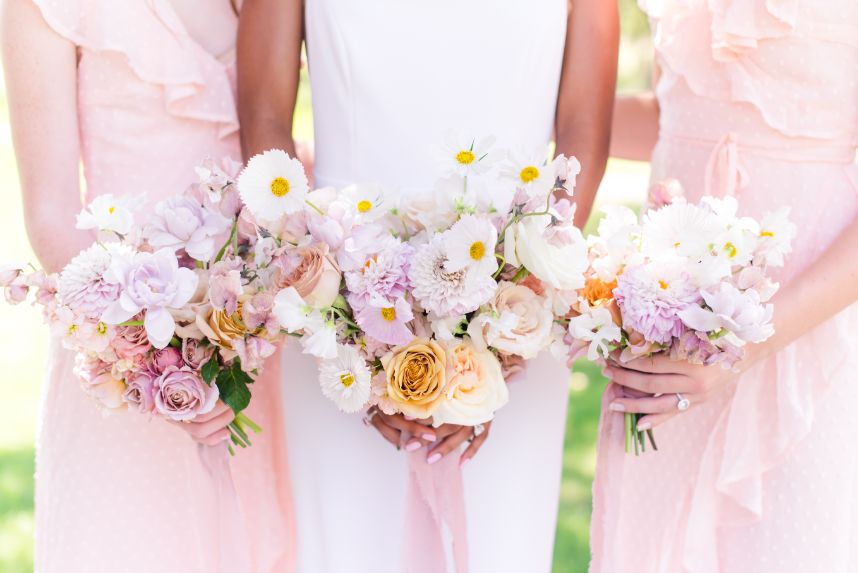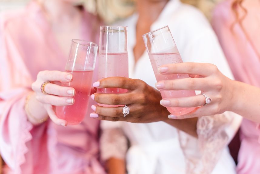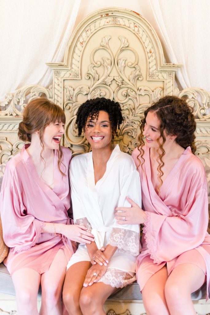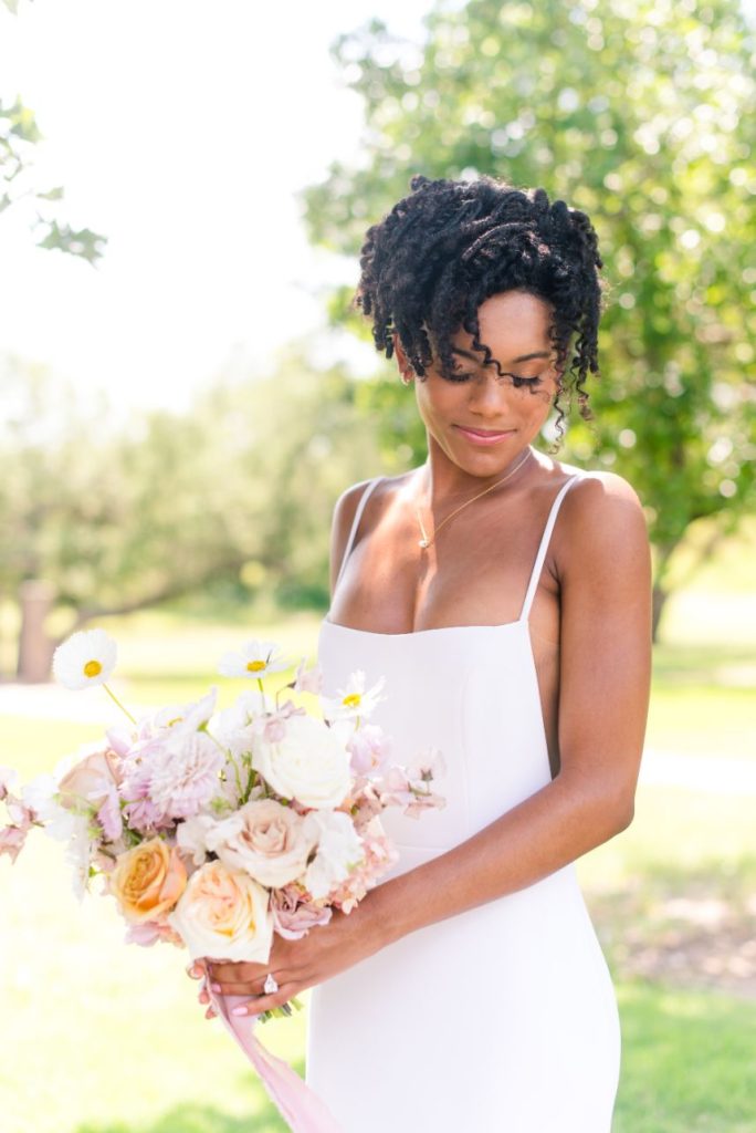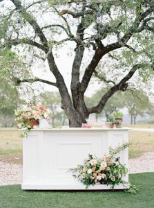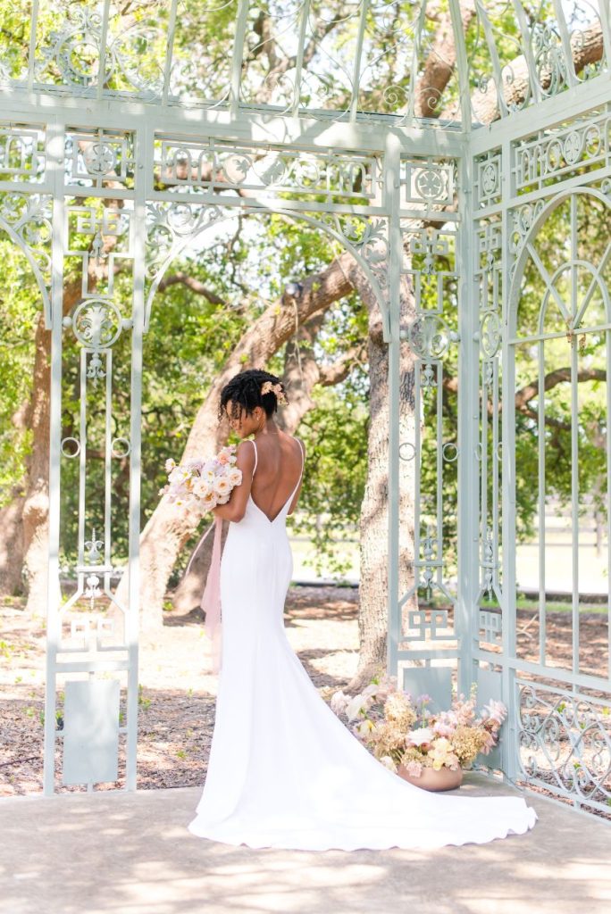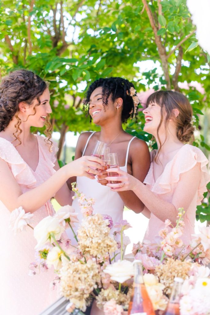 Your wedding day will blow right by if you aren’t careful, so stop to smell the flowers as you make your way through your day and de-stress the getting ready process with a few fun additions your bridal party will love! Getting ready with your bridesmaids should be as relaxing as this looks captured in serene shots by T Walker Photography, so unwind with the help of a few local vendors that set out to put your mind at ease like a little deep tissue action from Live Love Relax. Have the best pre wedding morning with your gals, complete with massages, sweets and champs! With a little help from Champagne Supply Co., the morning will definitely be poppin’. Whimsical bride and bridemaids bouquets by Remi + Gold keep things light and fun in tone with their modern variety of Nicole Mera fine jewelry in a rainbow of gem varieties. This bride wore a simplistic style from a&bé bridal shop Austin of clean lines and stunning open back detail, plus pink-toned wedding glam paired with an elegant, naturally curly updo styled by the hair and makeup artists at Level 12 Salon.