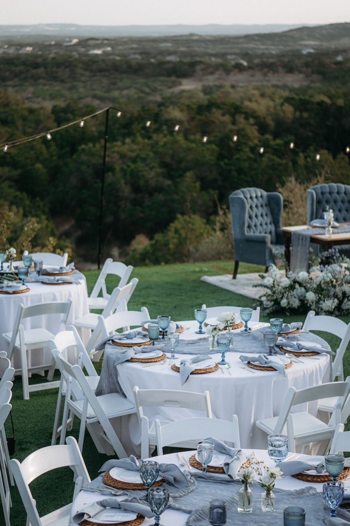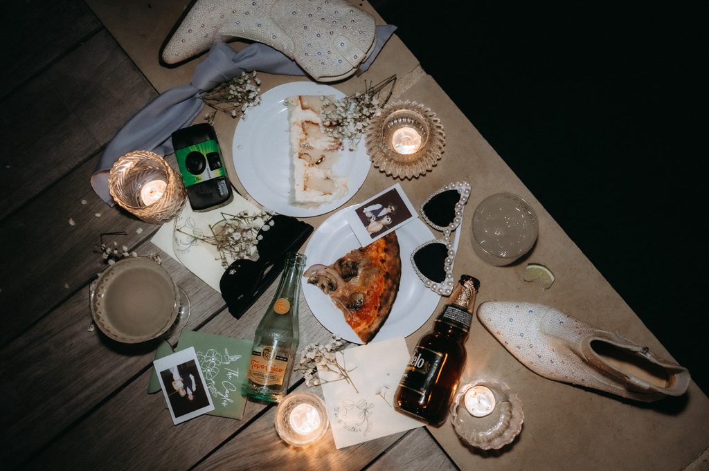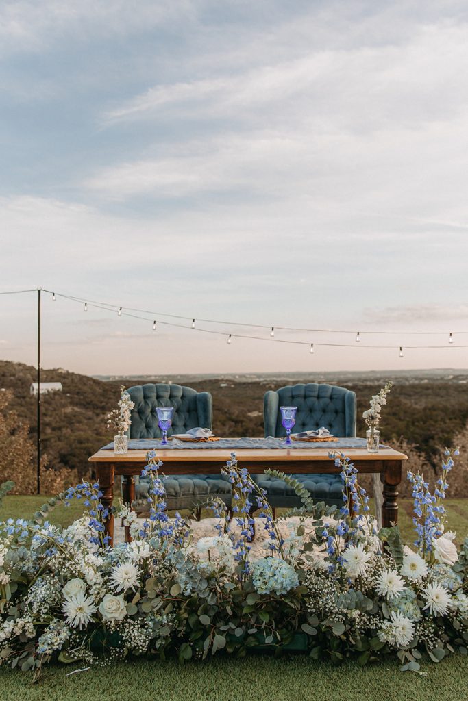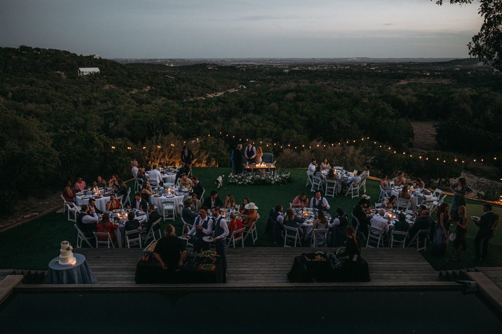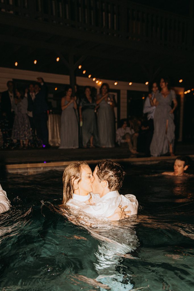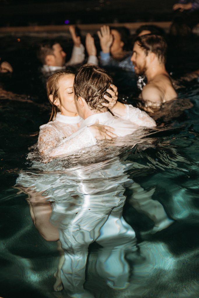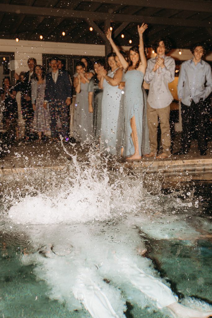 “As Tye walked down the aisle alongside their friends and family and towards the sunlight, she reflected on all of the memories from her and Walker’s time together and the adventure that awaited. As the sun set the sky above turned a dusty blue matching the tablescape designed by Cat Haus Collective and set the tone for the night and the party was ready to begin. The music was pumping and the drinks were flowing throughout the night as the party culminated with Tye Walker jumping off into the pool with their wedding party and jumping into their new lives together.”