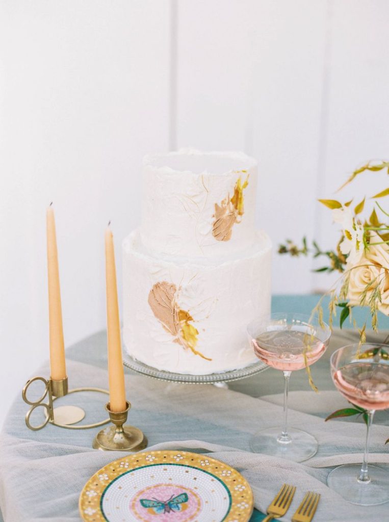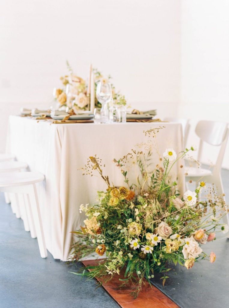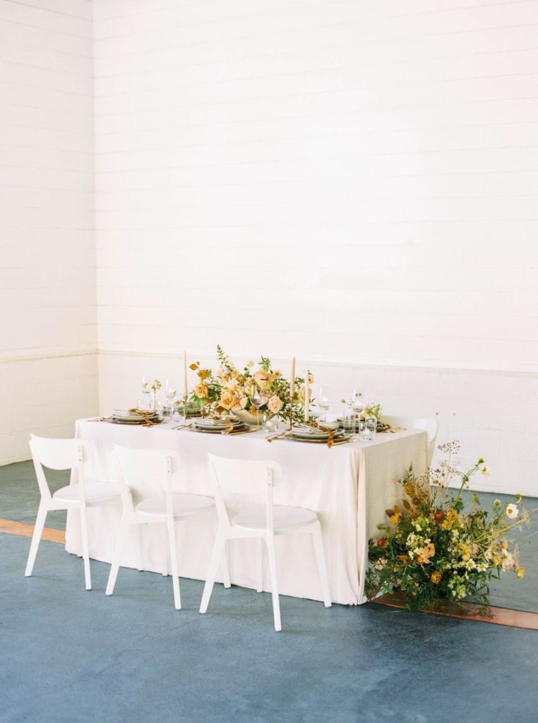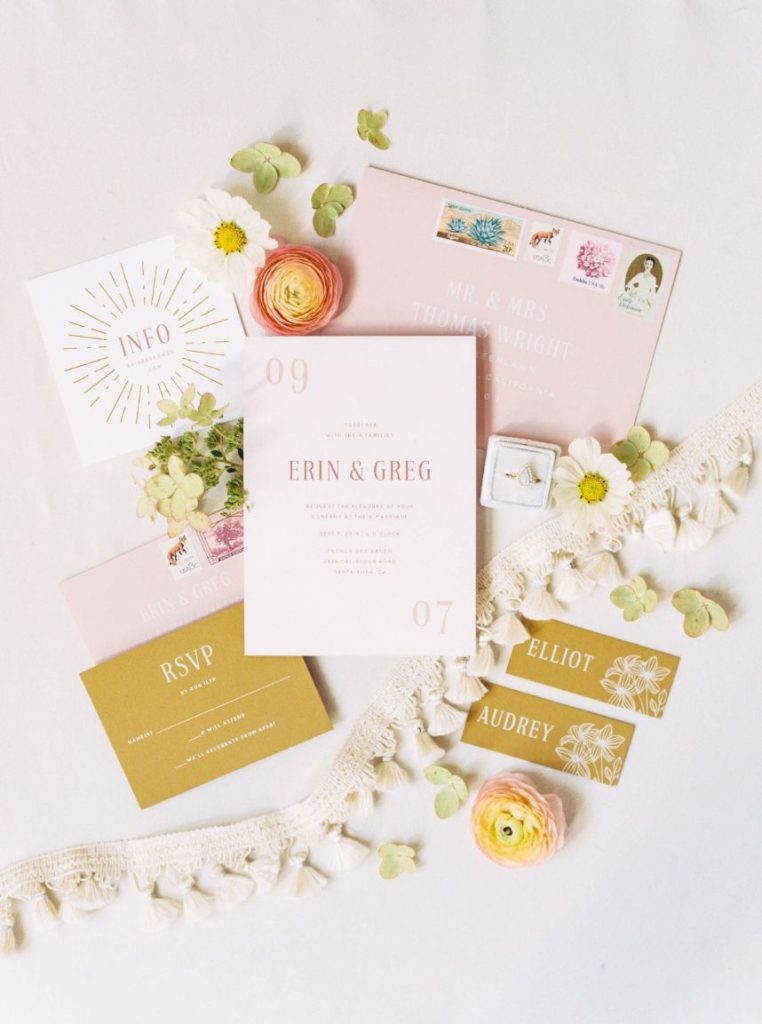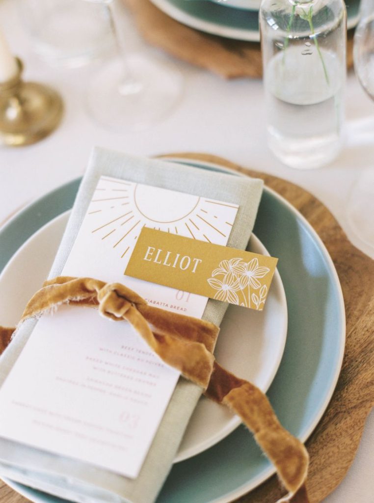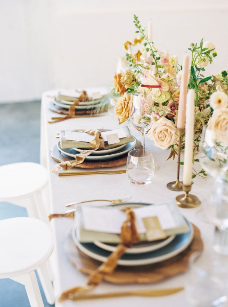 From the planner, Andria Volpicelli of Andria Leigh Events: “Driven by the two places that inspire us — California and Texas — we wanted this styled shoot to have golden, sunny tones in a modern ranch setting that brides could find in either Austin’s Hill Country or Napa Valley. With textured paper details from Peach Paper Design, romantic taper candles and ceramic stoneware dishes, guests can discover playful, warm, art-driven details from every angle.”