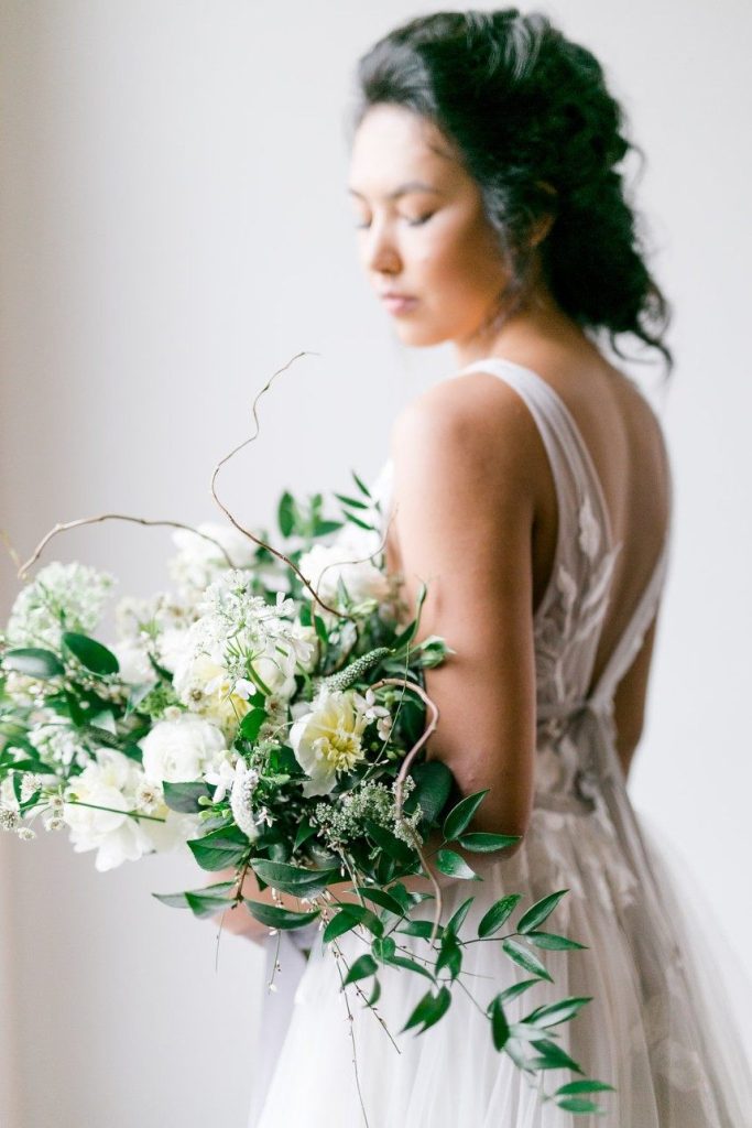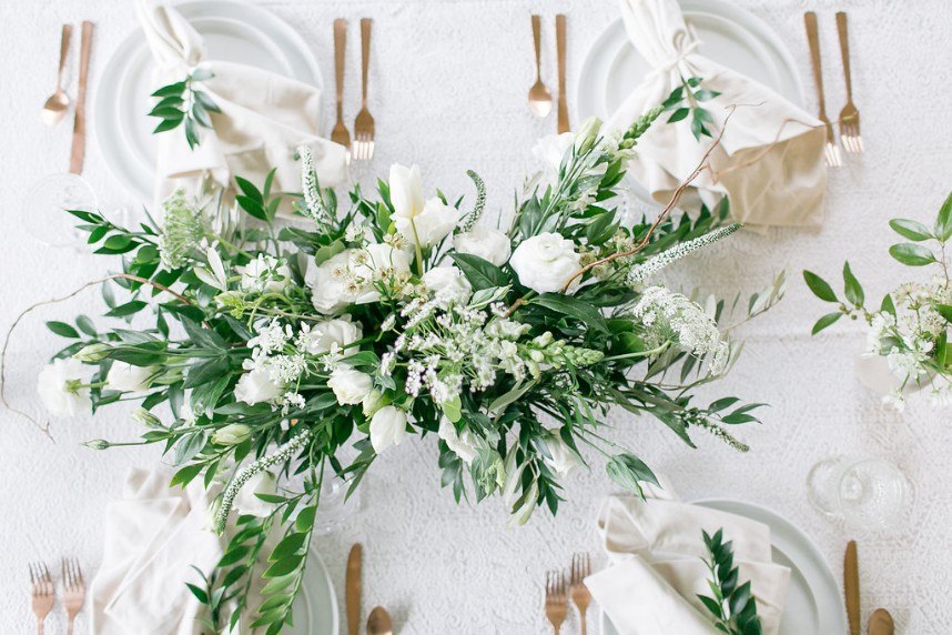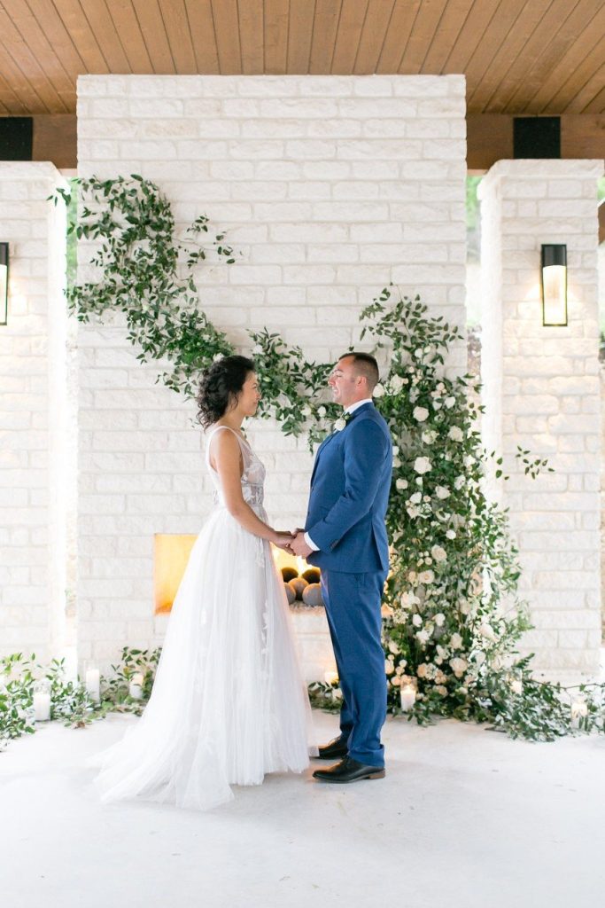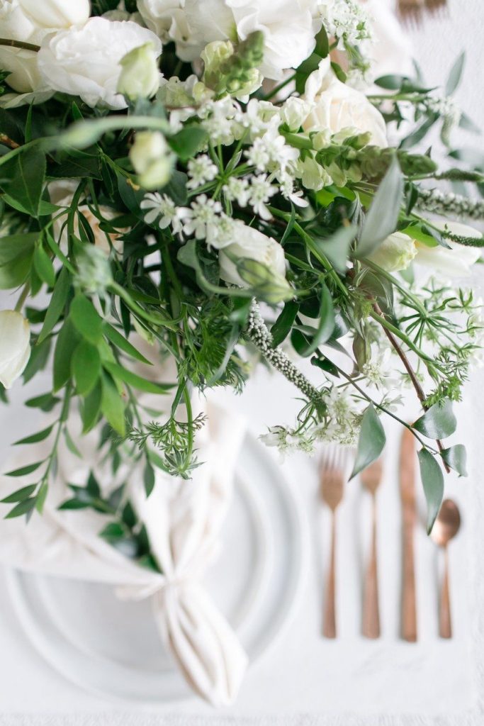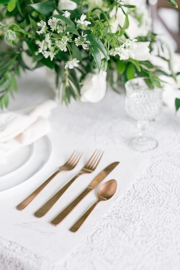Greenery and gold details pop against a stunning natural backdrop in this lush styled shoot from Sweet Laurel Events and Smith House Weddings! The beautiful venue, Hidden Falls, with limestone walls and clean, modern lines offers a contemporary space perfect for cooler weather weddings centered around the statement-making fireplace. Climbing greenery also makes a statement, along with the overflowing abundance of gorgeous greenery throughout the entire ceremony and reception! Pops of blue in the groom’s suit and the stationery add a touch of classic elegance. We love the thoughtful detail of the attendee’s name calligraphed beneath their place setting provided by Birch & Brass – such a sweet personal touch! Accents of white in the florals, linens and of course the bride’s stunning gown bring a light and airy essence, keeping the scene fresh and life-filled. We’re loving all the green, the timeless images and the way everything comes together so cohesively! Major swoon!