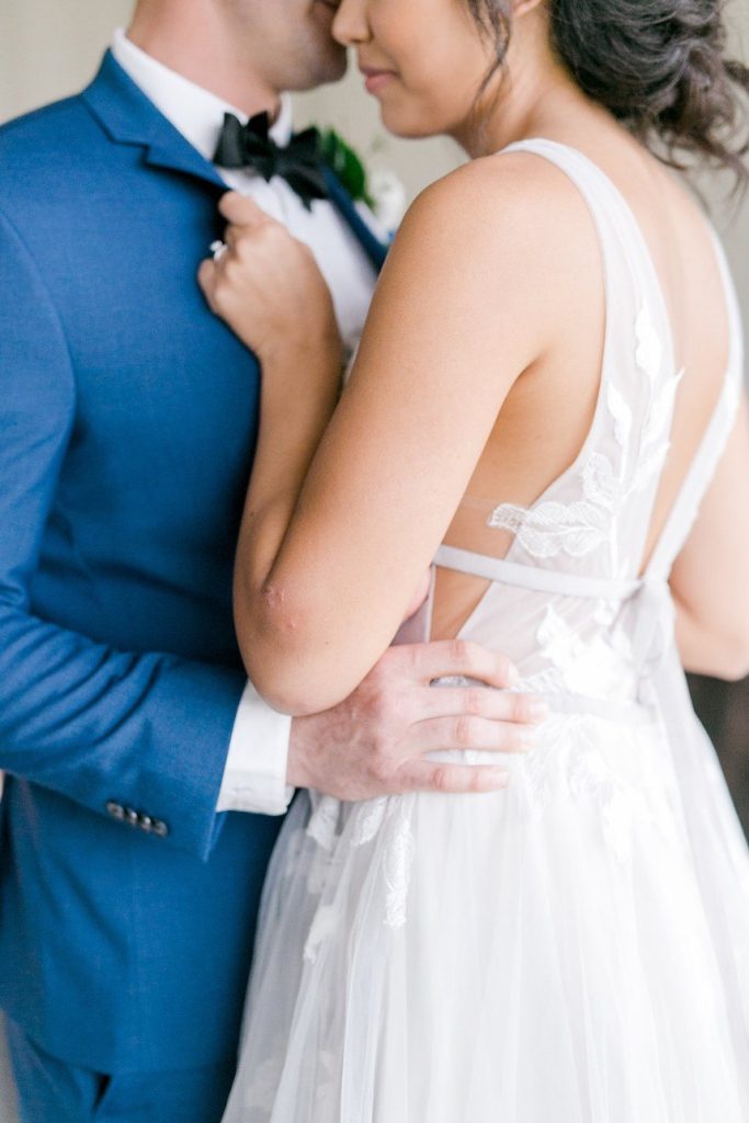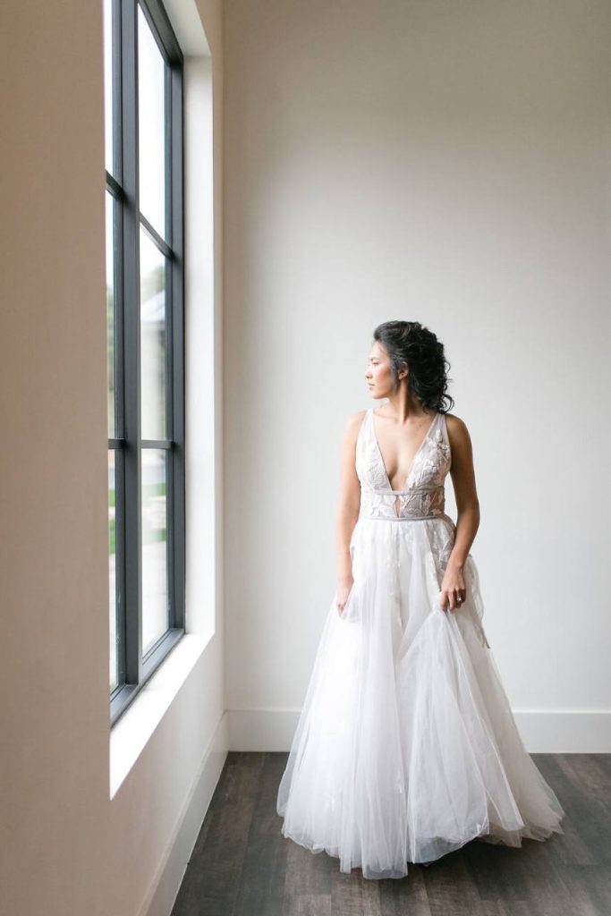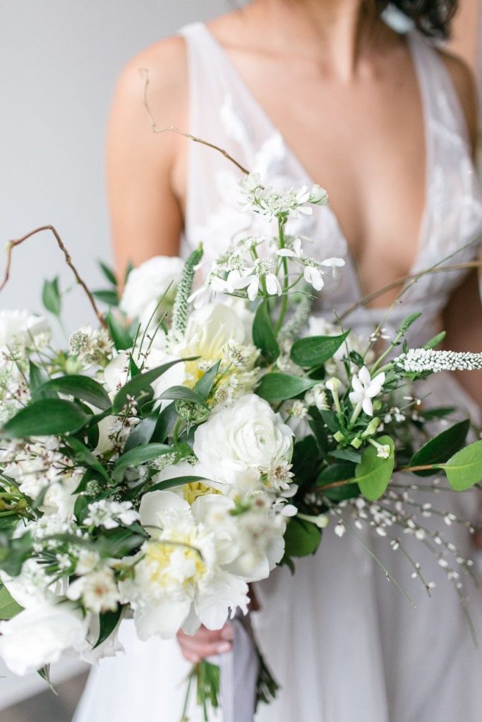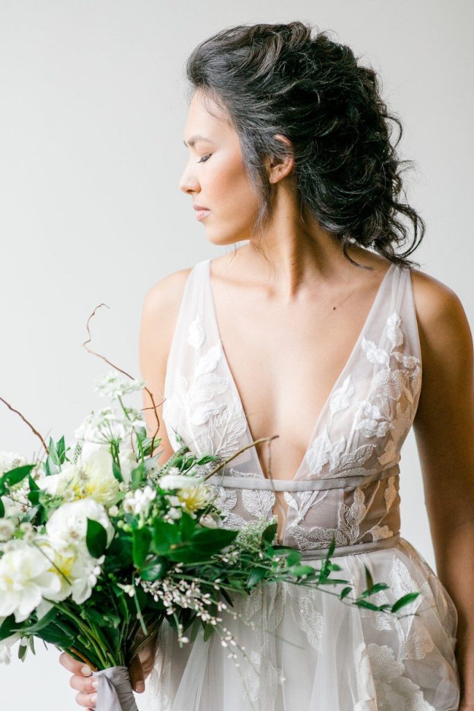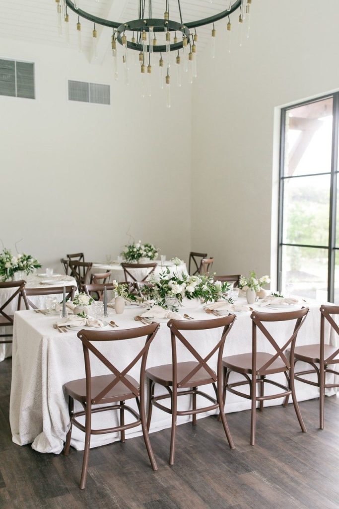 Greenery and gold details pop against a stunning natural backdrop in this lush styled shoot from Sweet Laurel Events and Smith House Weddings! The beautiful venue, Hidden Falls, with limestone walls and clean, modern lines offers a contemporary space perfect for cooler weather weddings centered around the statement-making fireplace. Climbing greenery also makes a statement, along with the overflowing abundance of gorgeous greenery throughout the entire ceremony and reception! Pops of blue in the groom’s suit and the stationery add a touch of classic elegance. We love the thoughtful detail of the attendee’s name calligraphed beneath their place setting provided by Birch & Brass – such a sweet personal touch! Accents of white in the florals, linens and of course the bride’s stunning gown bring a light and airy essence, keeping the scene fresh and life-filled. We’re loving all the green, the timeless images and the way everything comes together so cohesively! Major swoon!