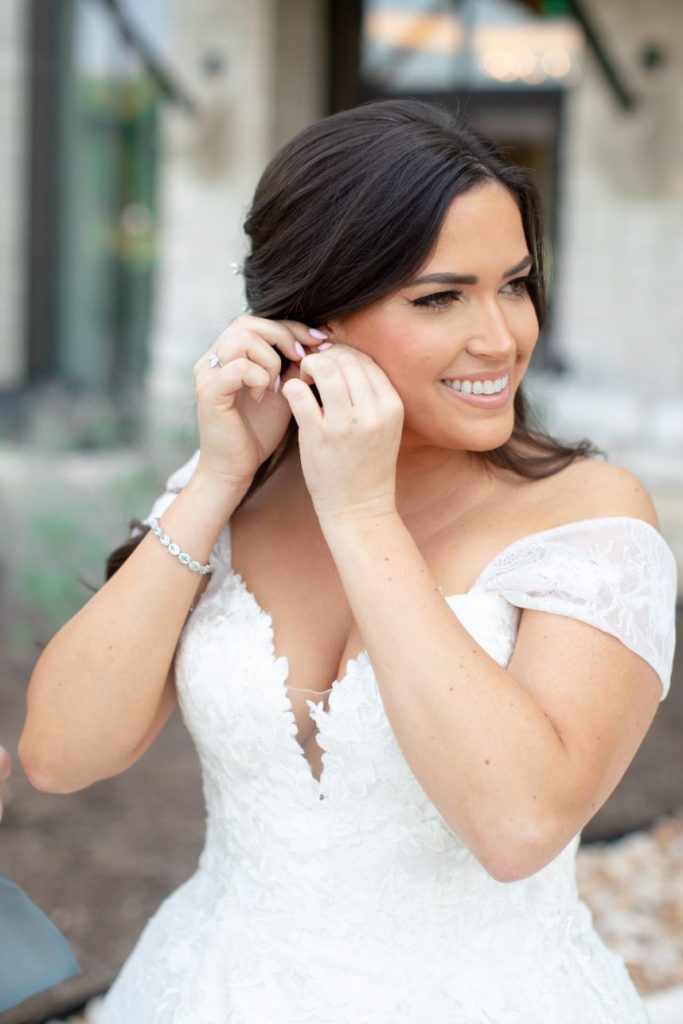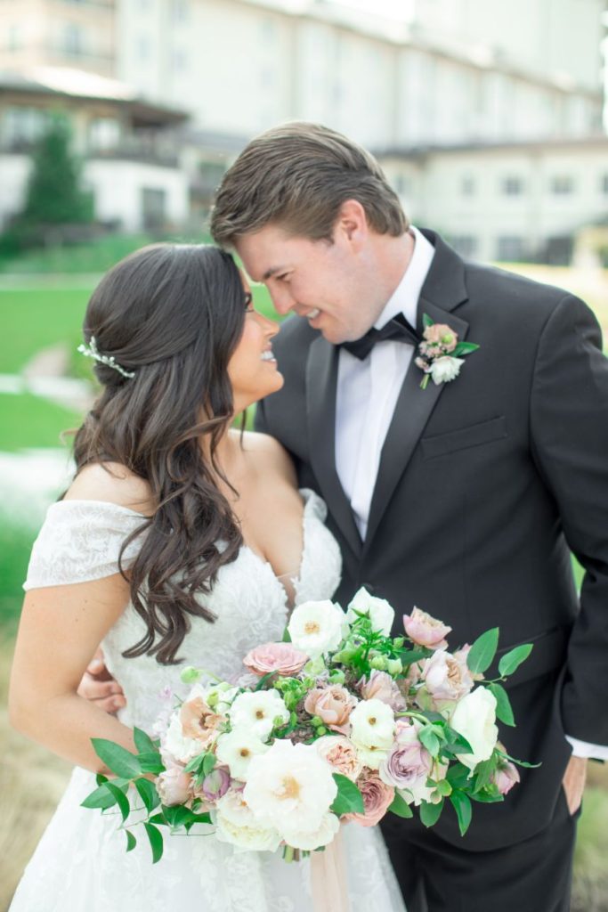After Haley and Sterling rescheduled their wedding two times and found a new venue, they finally said “I do” on a September evening. Andria Leigh Events helped the couple through the entire process and flawlessly implemented the couple’s vision. The wedding day began with a special moment as Haley put on her mother’s veil. We love how Haley added a sentimental detail with her gown from Patsy’s, A Bridal Boutique, to create the most beautiful bridal look. Haley and Sterling shared a first look before their outdoor ceremony. Haley said, “having that time together before the ceremony and wedding started was invaluable, and we could relax a little before everything started.