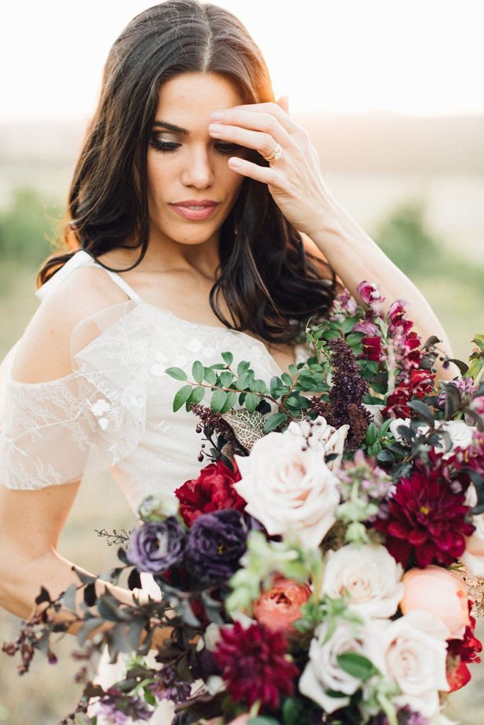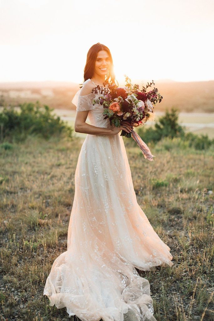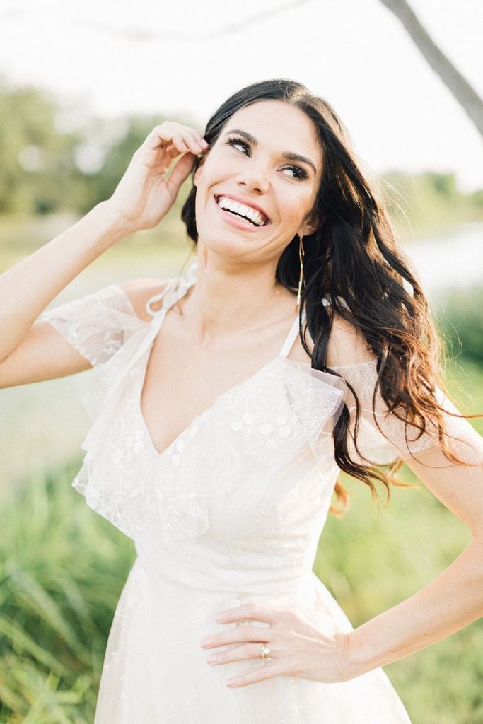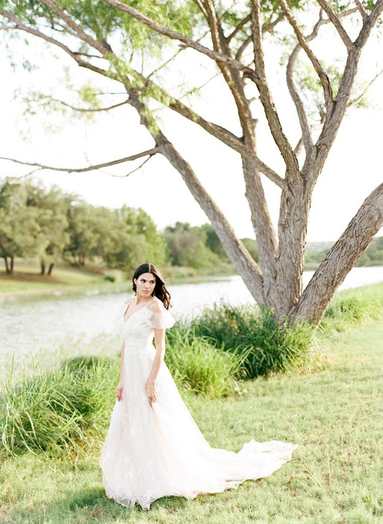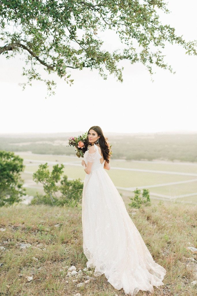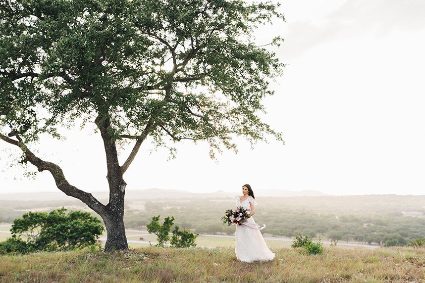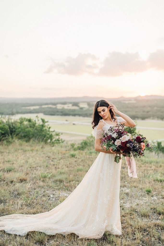 Nestled within the breathtaking landscape of the Texas Hill Country sits Mustang Waters Ranch. Offering an incomparable sunset view and an abundance of lush scenery, it’s no wonder this one-of-a-kind venue was chosen to serve as the backdrop for our Hill Country Charm Color Collab editorial feature. Captured by Feather & Twine Photography, this shoot is gorgeously traditional with a splash of contemporary character. Our model bride fashioned a lovely lace gown courtesy of Serendipity Bridal, featuring a flattering empire waist and intricate floral detail. FlAir Style Lounge finished off her look with soft curls and a dramatic smokey eye. Flora Fetish supplied eye-popping arrangements, while Premiere Events designed a beautiful tablescape that complemented the vision behind this dreamy day oh-so perfectly. Geometric jewelry from Eliza Page along with an elegant invitation suite and menu card from Fine Day Press added a modern touch. Last, but most certainly not least, we can hardly keep our eyes off of the cutest mini blackberry pies from 2tarts Bakery!