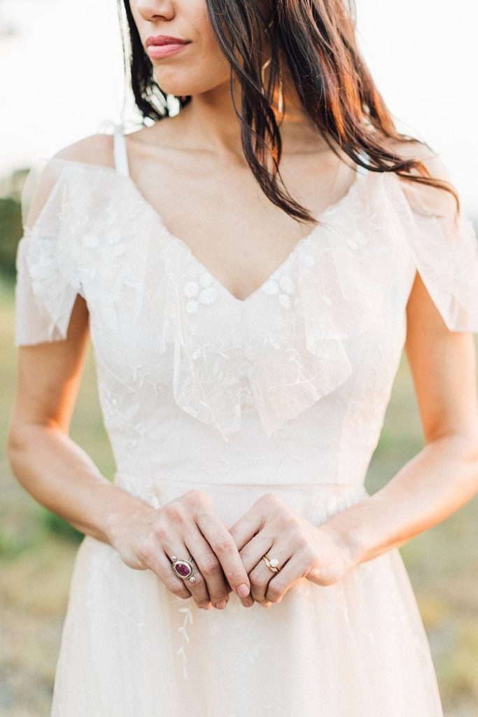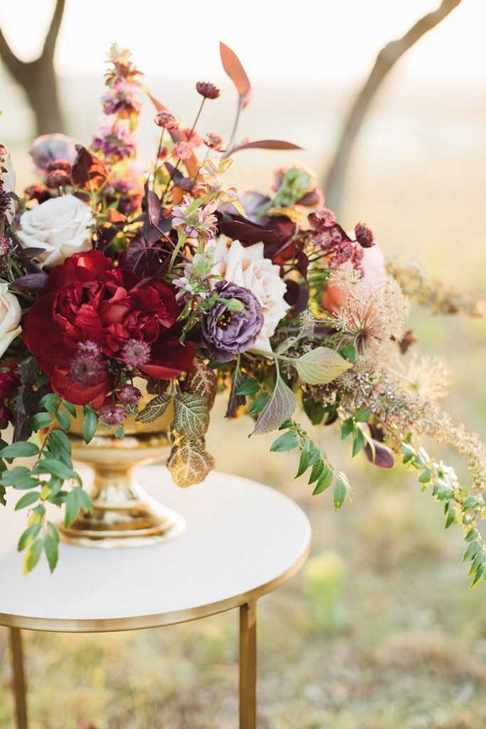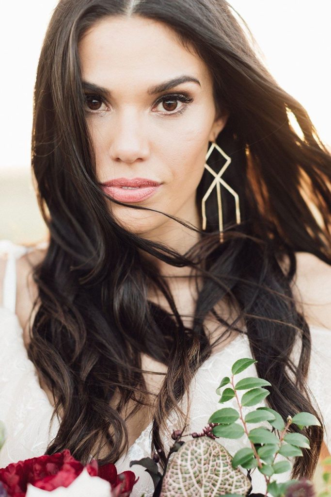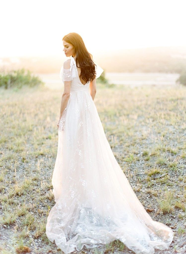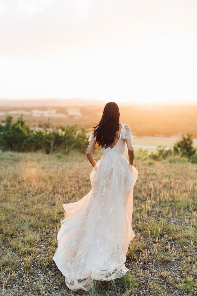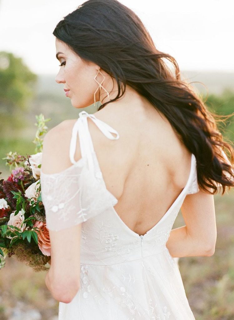Nestled within the breathtaking landscape of the Texas Hill Country sits Mustang Waters Ranch. Offering an incomparable sunset view and an abundance of lush scenery, it’s no wonder this one-of-a-kind venue was chosen to serve as the backdrop for our Hill Country Charm Color Collab editorial feature. Captured by Feather & Twine Photography, this shoot is gorgeously traditional with a splash of contemporary character. Our model bride fashioned a lovely lace gown courtesy of Serendipity Bridal, featuring a flattering empire waist and intricate floral detail. FlAir Style Lounge finished off her look with soft curls and a dramatic smokey eye. Flora Fetish supplied eye-popping arrangements, while Premiere Events designed a beautiful tablescape that complemented the vision behind this dreamy day oh-so perfectly. Geometric jewelry from Eliza Page along with an elegant invitation suite and menu card from Fine Day Press added a modern touch. Last, but most certainly not least, we can hardly keep our eyes off of the cutest mini blackberry pies from 2tarts Bakery!