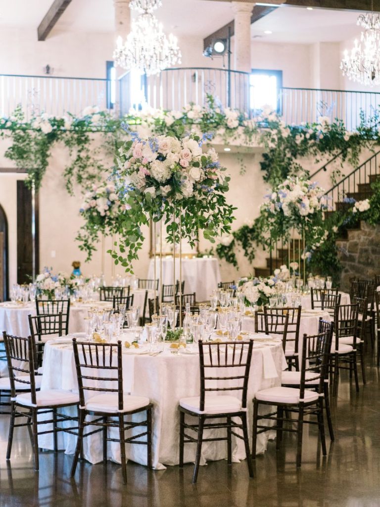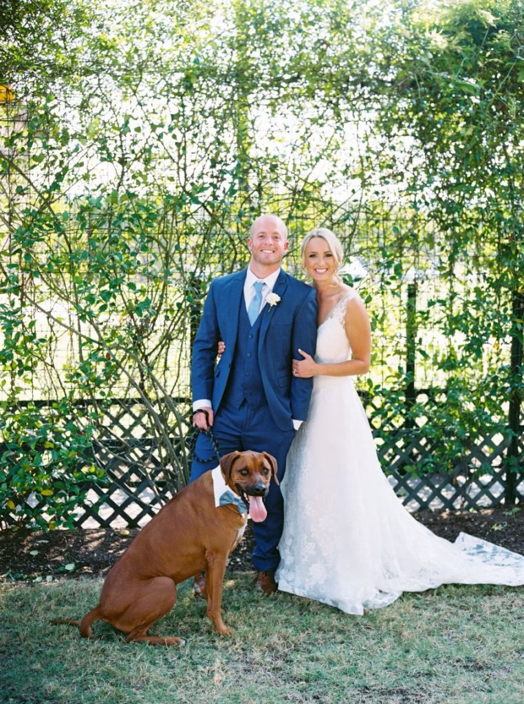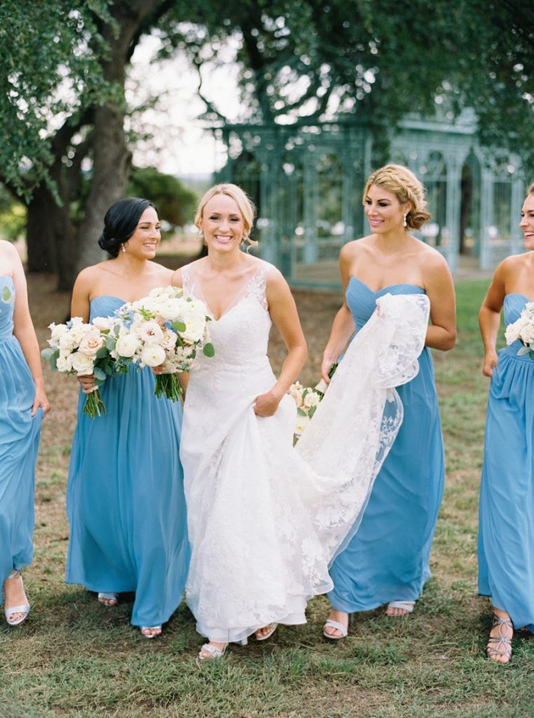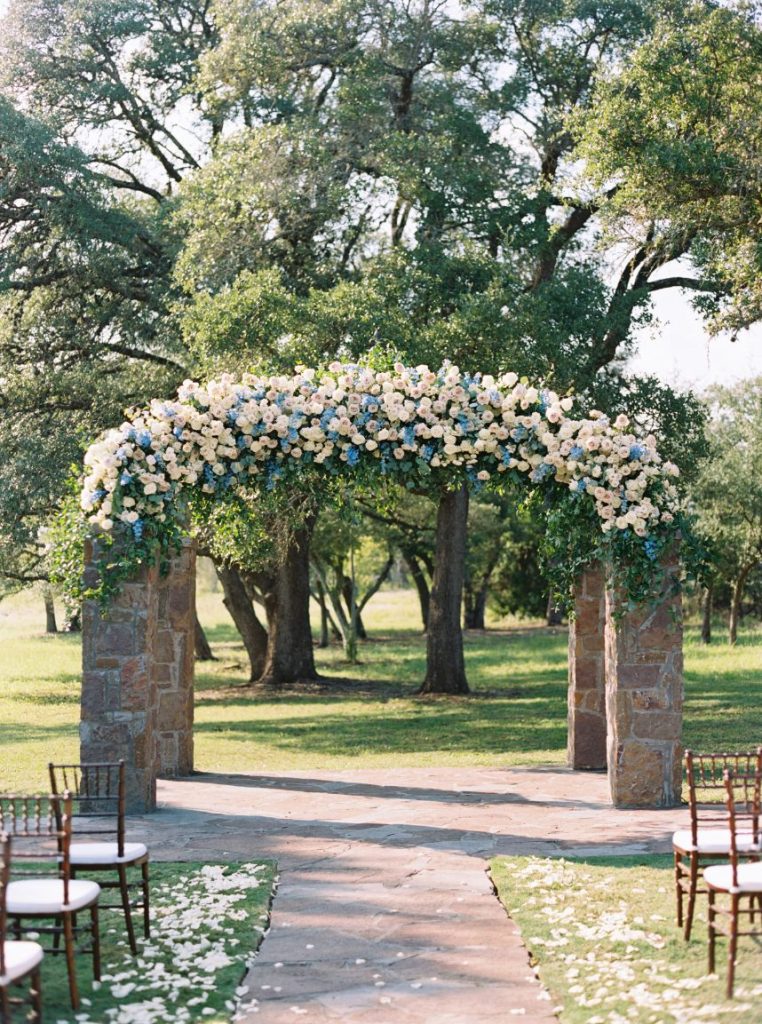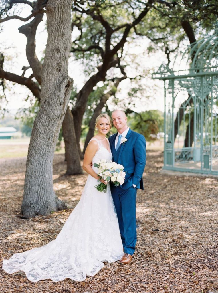 There was so much romance in this Hill Country wedding that peeked out in delicate accents of soft blue all around the gorgeous property at Ma Maison. Like many couples today, Haley and Thomas were a Tinder success story who hit it off immediately! Their fabulous fête planned by the professionals at Eclipse Event Co. was visually impeccable, but its sentimentality made it mean so much more. The couple incorporated some of their favorite people into the day, like the bride having a special first look with her dad and their dog Rhody who played a part in their proposal – so having him walk down the aisle and stand with the wedding party was only fitting! She wore a stunning V-neck ballgown silhouette from Stanley Korshak Bridal Salon while he was clad in a smart blue suit from Generation Tux. Haley and Thomas incorporated their own personal vows into the ceremony that shared their true, raw emotions for each other just before being pronounced husband and wife while standing under the most gorgeous floral arch by Stems Floral Design + Event styling in soft blue and ivory shades.
