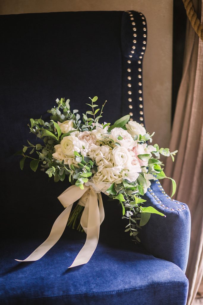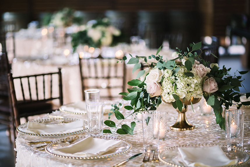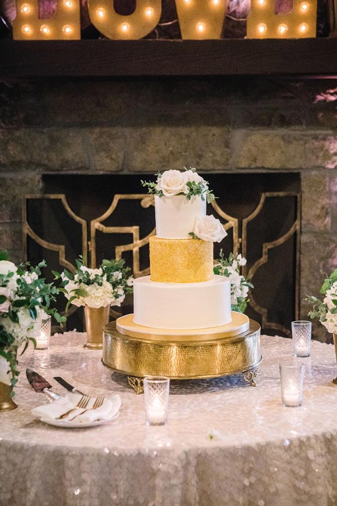 THE CAKE: Simon Lee Bakery created a decadent three-layer cake: two layers of salted caramel vanilla and one layer of red velvet. The cake was simple but classy – decorated in white frosting, sprinkled lightly with gold flecks and topped with three blush roses.