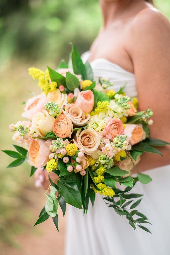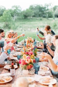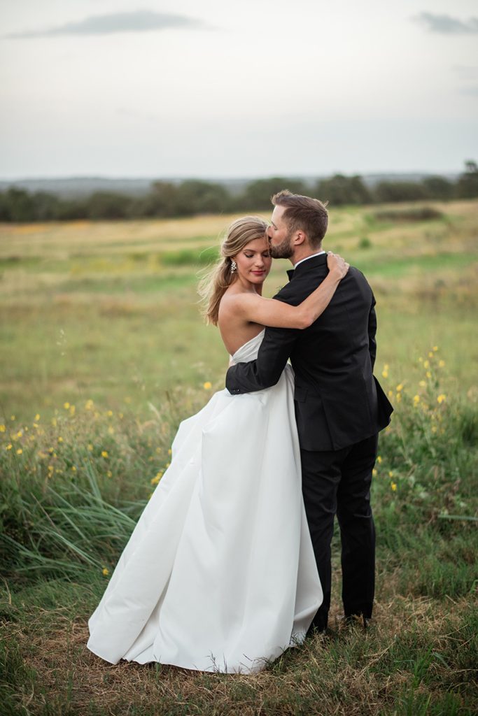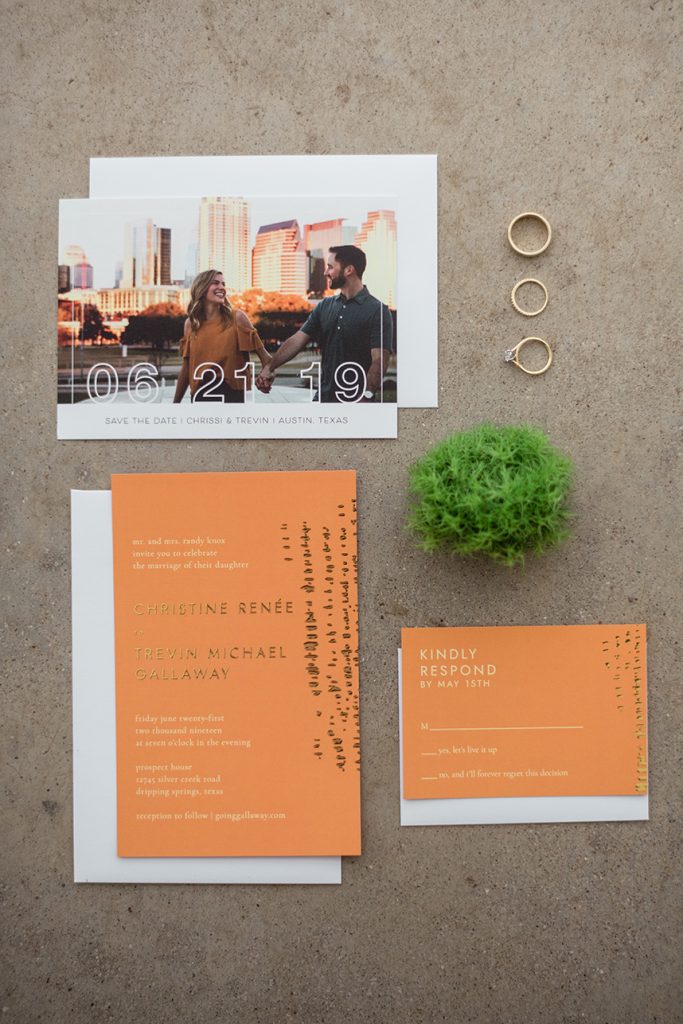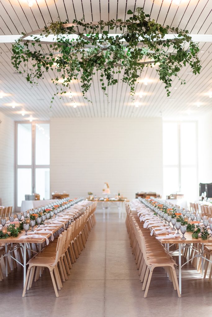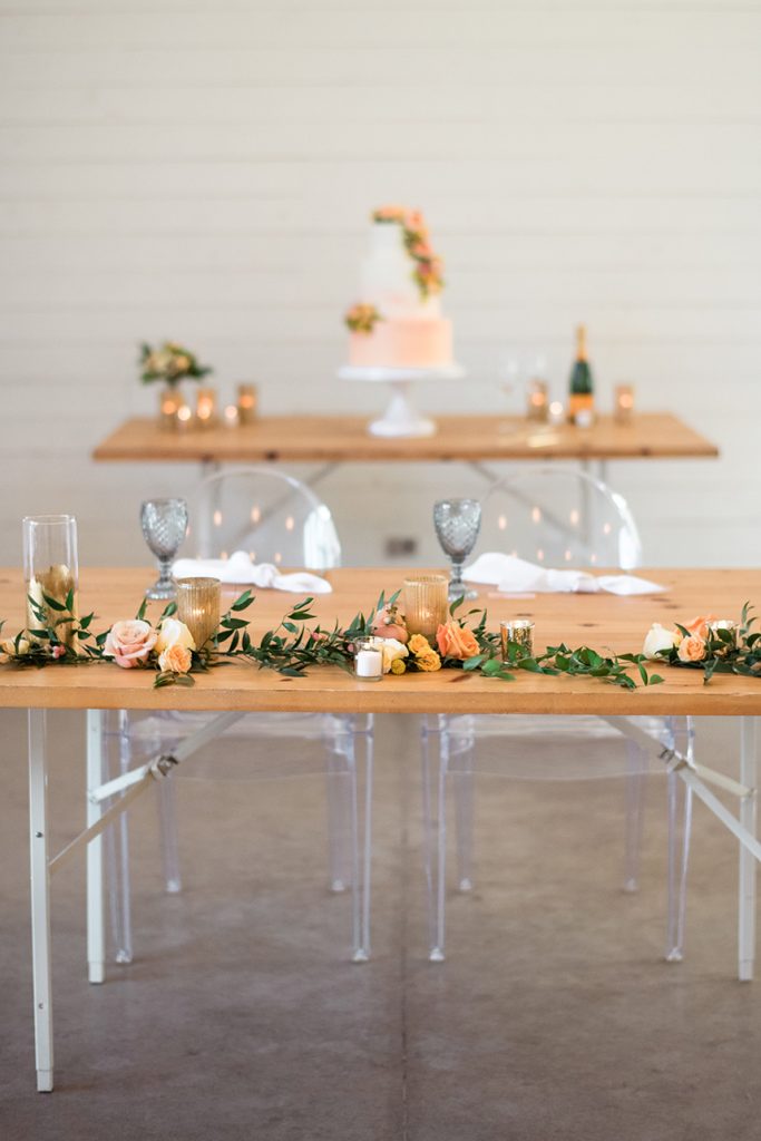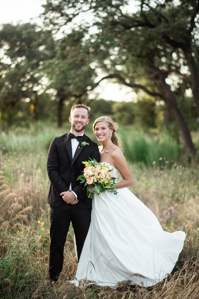 This intimate peach wedding was the bride’s vision-turned-reality, and we’re still in awe about how dreamy it was! You can’t have a wedding in Austin without throwing in a little bit of orange (hook ’em, horns!), and Chrissi and Trevin’s big day did that so well by incorporating lots of greenery and gold accents with the decor by Premiere Events. We seriously cannot stop staring at all of the florals from The Flower Girl. From the simple but oh-so striking floral wall, to the bride’s bouquet, to the centerpieces, each arrangement was flawless. All of the couple’s closest family and friends danced the night away, all while enjoying delicious food and drinks from Salt Lick BBQ. With the accommodations by The Fairmont Austin, this wedding weekend was complete! Scroll through to see the gorgeous photos by April Mae Creative and to see why peach is our new favorite color. Cheers to Chrissi and Trevin!