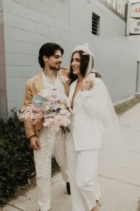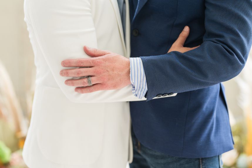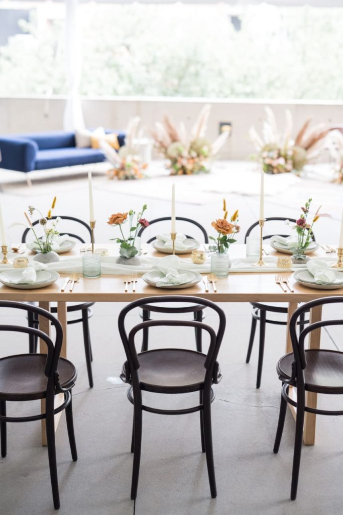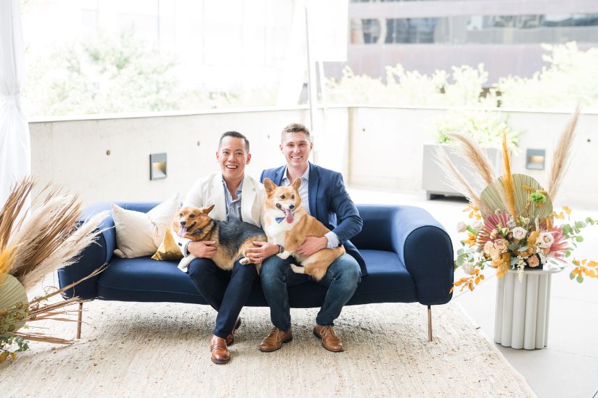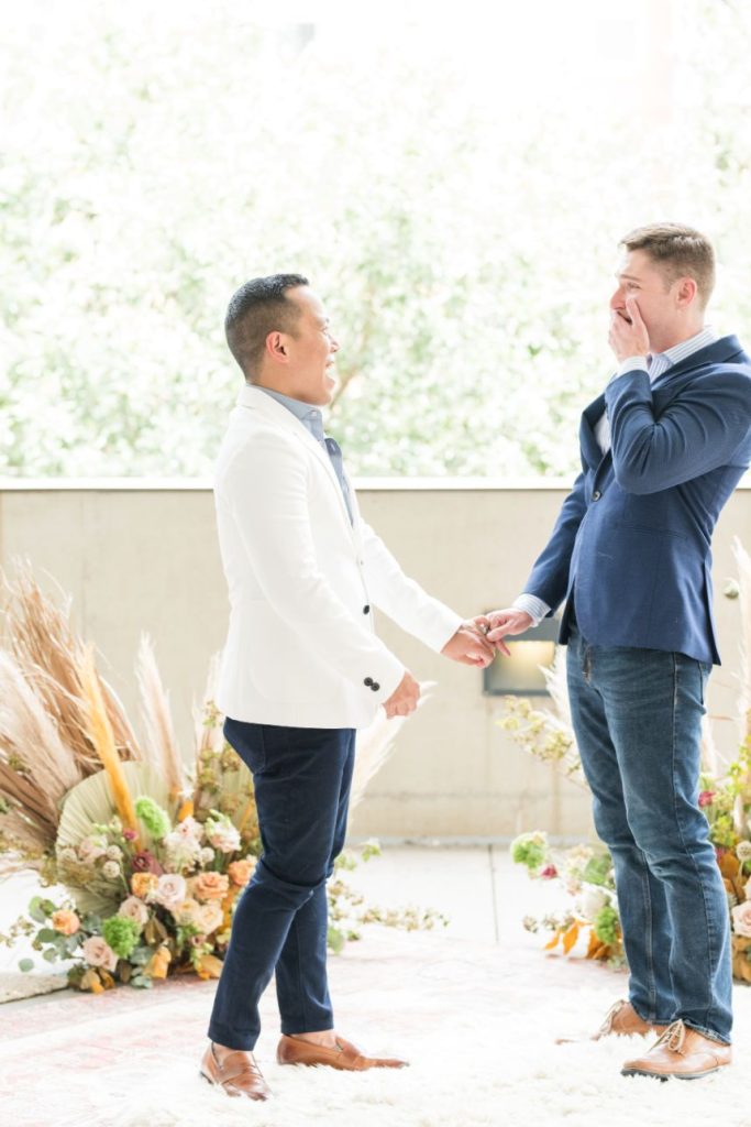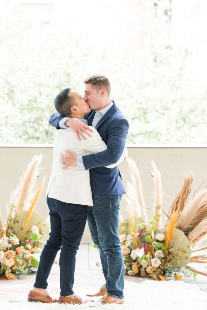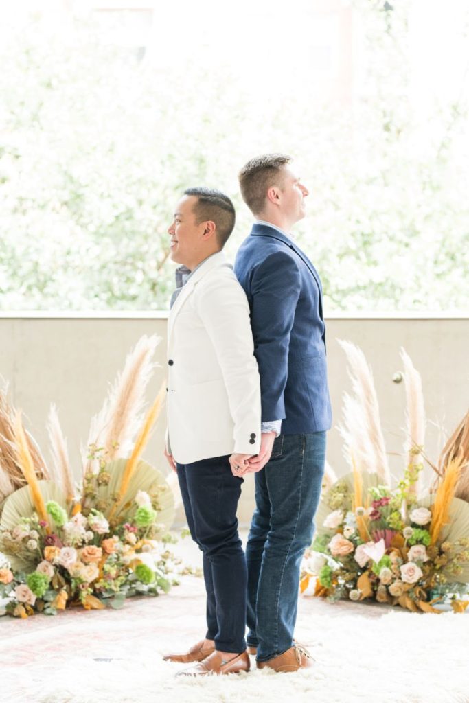 We can feel all the love in this intimate wedding inspiration captured by Mylah Renae Photography around the stately hotel setting of W Austin where a covered outdoor scene with a view of downtown Austin was brought to life by so many stylish elements! These two lovebirds look simply smitten, saying “I do” in front of their adorable corgis at an altar distinguished by Moroccan rugs from Party at the Moontower Event Rentals and blooming boho florals from Bella by Sara. We’re guided through this wedding inspiration to soak it all in, with areas as impeccably designed as the lounge fit for guests to enjoy cocktail hour. In another styled editorial setting, clean, artisanal tablescapes decorated with luxe brass candlestick holders, masculine flatware and feminine florals in earthy vases make for the most inviting reception dining. These two grooms make their toasts to the start of forever and clink glasses in front of a wooden bar and festive neon sign that totally sets the mood. We can’t get enough of this intimate wedding inspiration or the handsome grooms that are wed within it! See it all down below. Cheers!
