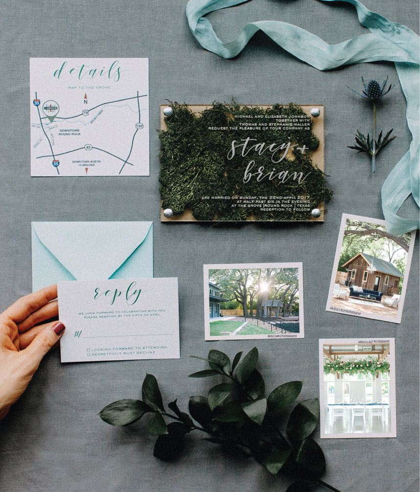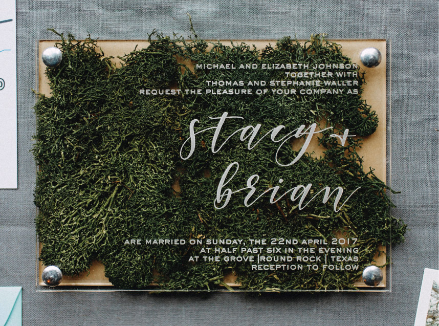The Grove, named for the majestic oak trees thought the property, inspired a mix between this modern acrylic and organic moss invitation from Scripted Ever After.