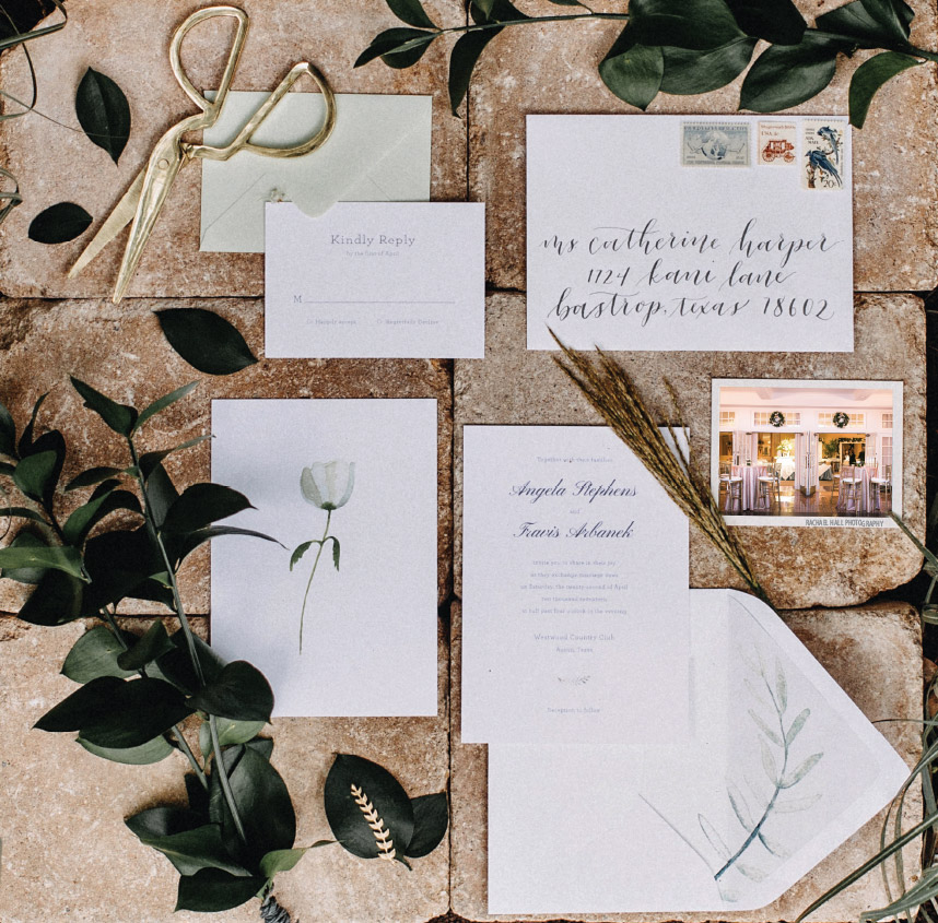 The Westwood Country Club’s scenic views of Lake Austin inspired this relaxed yet elegant invitation from Archer & Olive.