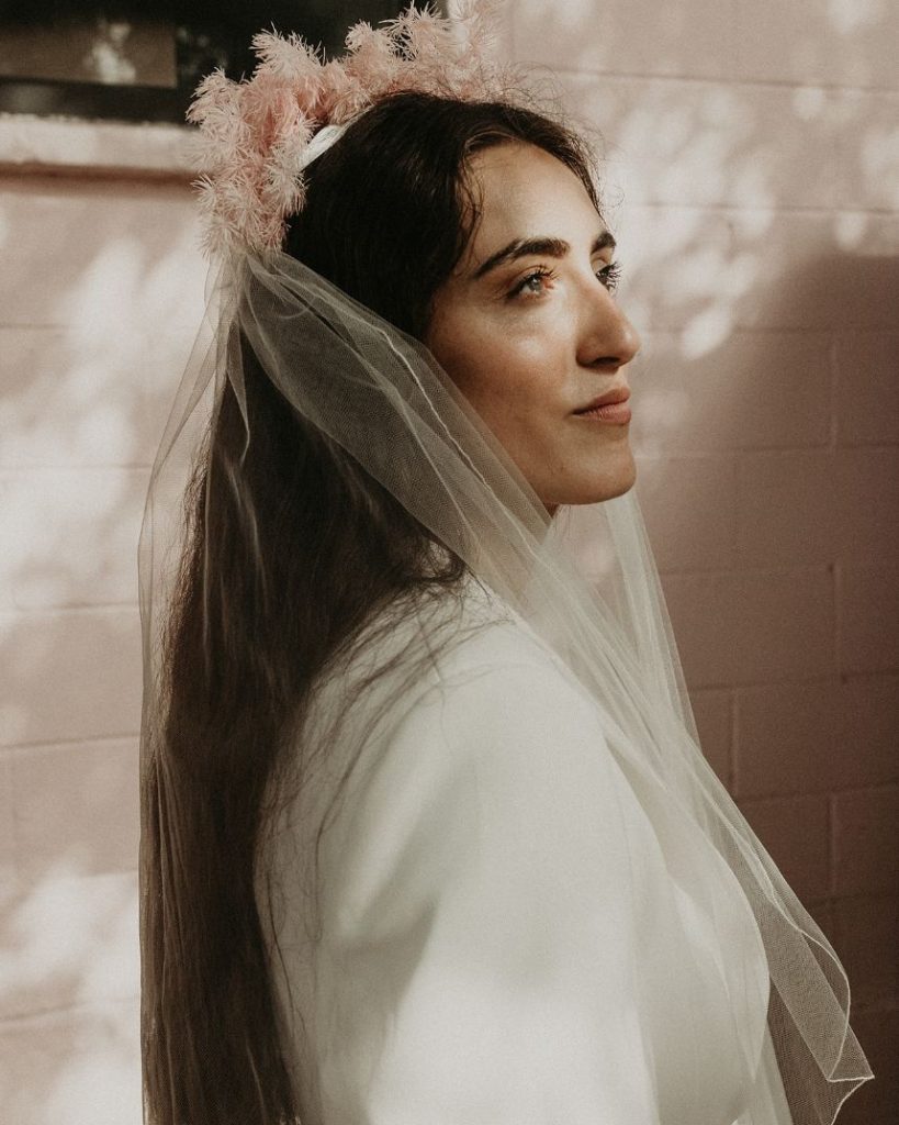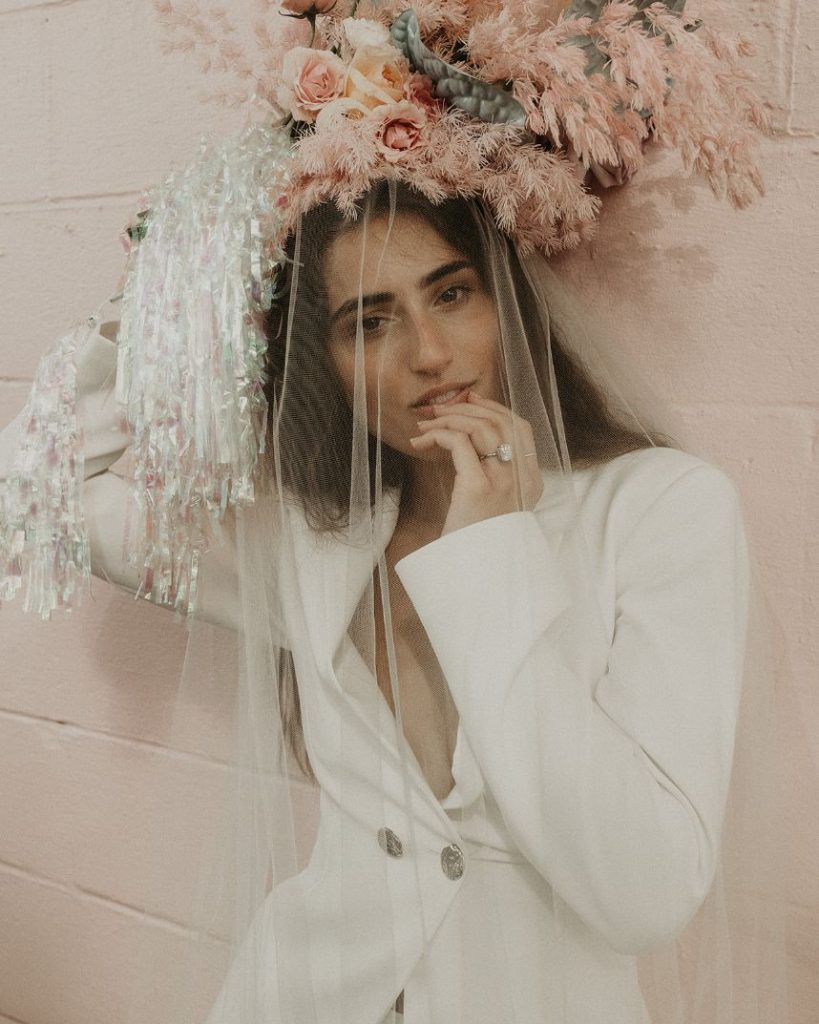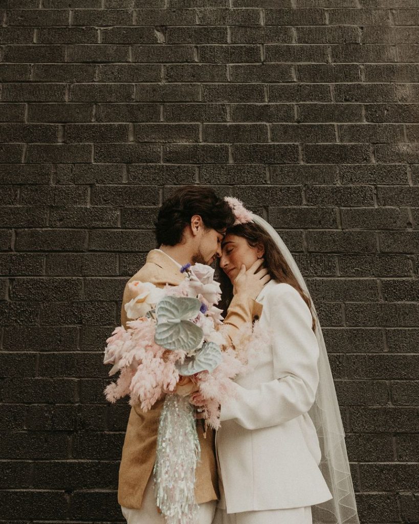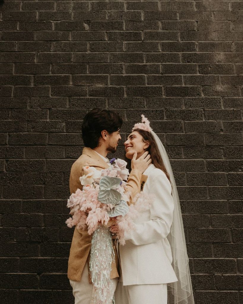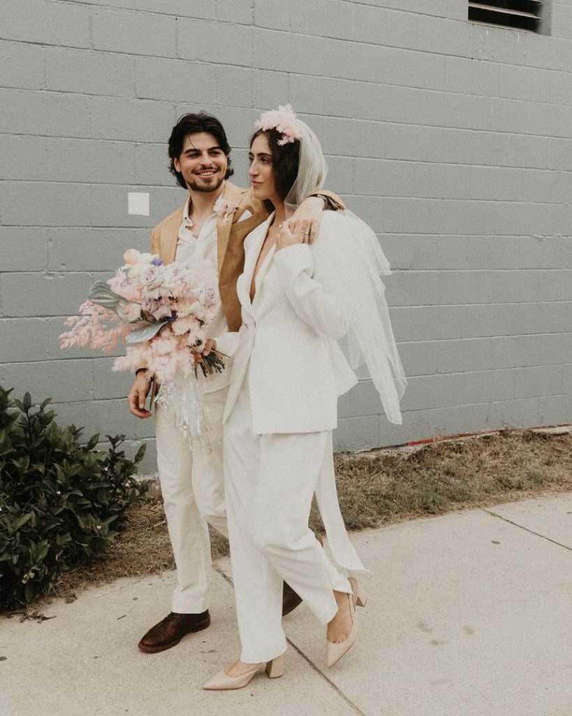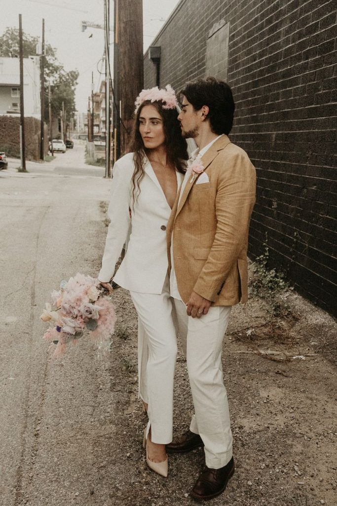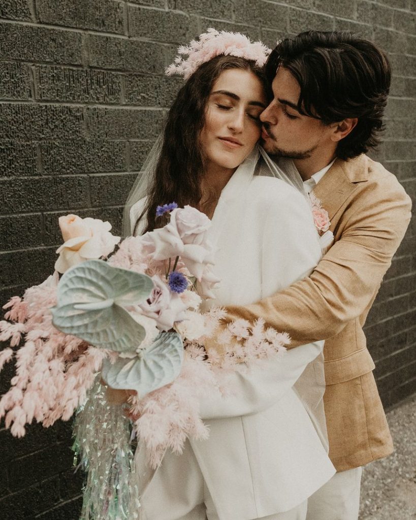From the photographer, Nikk Nguyen Photo: “For this styled shoot, we wanted to create a modern elopement that felt ethereal and fun. The downtown Austin environment meant we got to play with colors and textures in a really inspiring way, with wedding attire that felt casual but intentional. Our vision was a modern elopement for a couple who value creativity over tradition – people who know exactly who they are and what they want – and our models, Matt and Sarah, really killed it here! The bride’s dramatic white suit with a plunging neckline and cream heels was bold and beautiful. The sharpness of the suit paired with the flower crown and veil created a really intriguing vision of femininity. It meant that both the leafy background and the city streets offered incredible contrasts that really let the bride shine. The bouquet was another really special part of the day. This unique bouquet stole the show with an iridescent palette, including painted anthuriums and iridescent mylar streamers.”