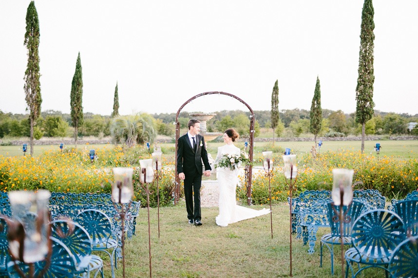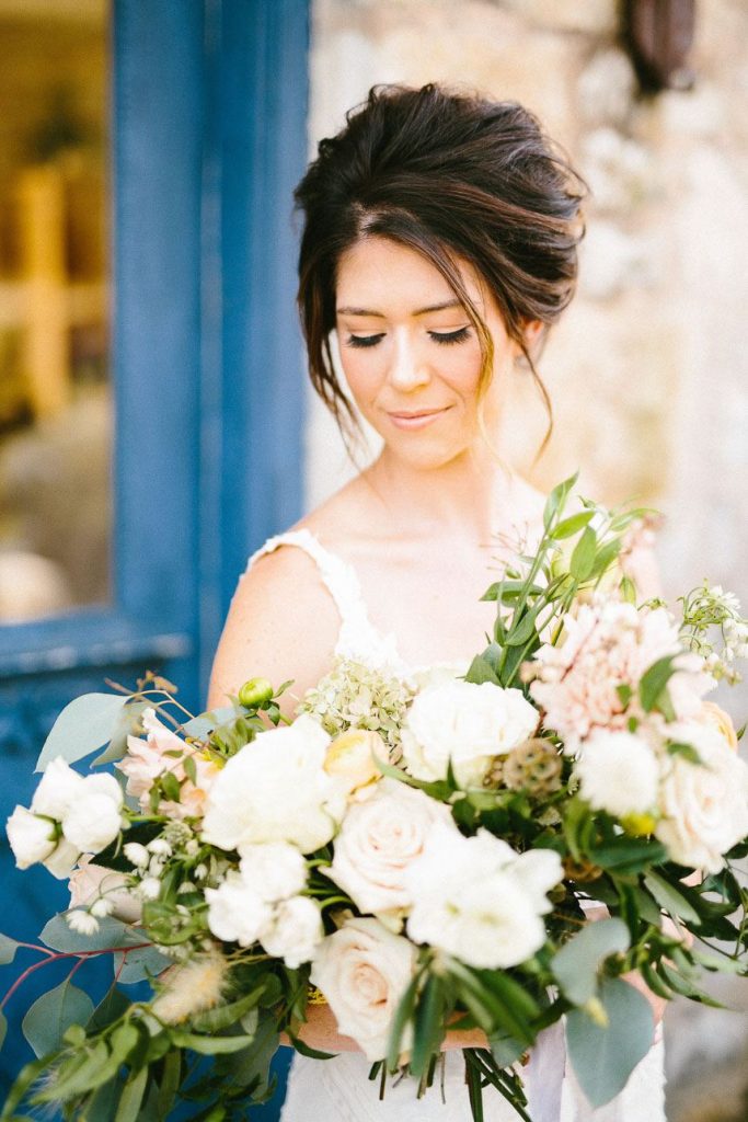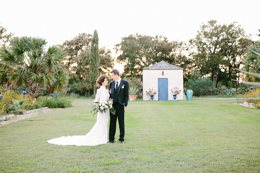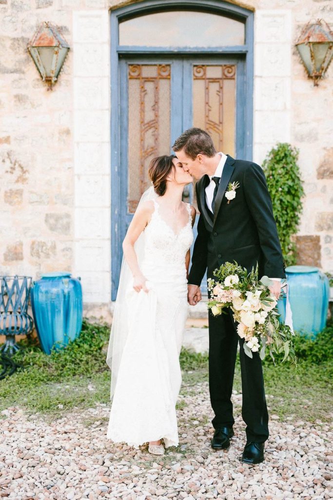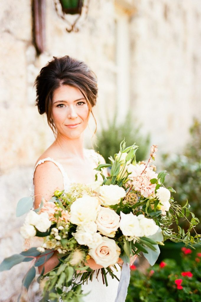 This Italian villa wedding inspiration transports us to a dreamy European estate, right here in the Texas Hill Country! Photographed by Smith House Weddings at Le San Michele south of Austin, this saturated styled shoot evokes the quaint, romantic feelings of an intimate destination wedding in Europe and inspires us with oh-so-lovely details! Floral design by The Bloom Bar adds incredible accents throughout the villa, from the bridal bouquet to the tablescape flowers and perfectly picked boutonnieres. A rustic, dark wood table with vineyard-style chairs from Birch & Brass Vintage Rentals adds more Italian flair to the scene, offering an intimate spot for the couple’s closest loved ones to celebrate after their al fresco sunset ceremony. Cheers to love – or should we say, amore!