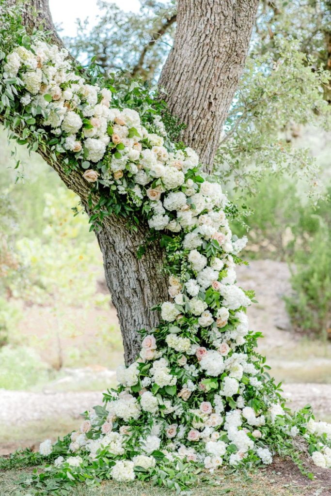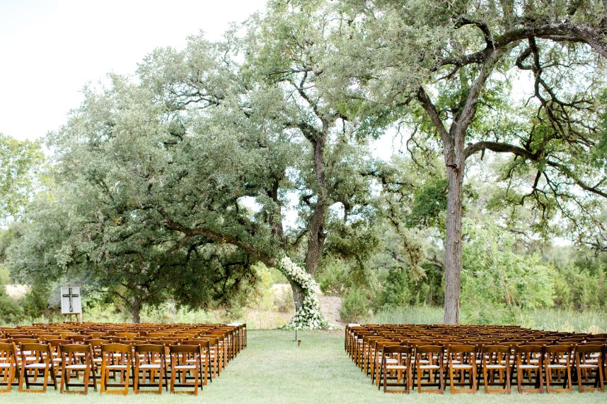 We are in absolute heaven after seeing Jennifer and Dustin’s elegant ivory wedding at Pecan Springs Ranch. It is simple and timeless with a touch of enchantment! The ranch even has a burro ready to entertain your guests… the cutest surprise! White flowers with a hint of blush and greenery embellish the tables from Premiere Events. But hold tight, it gets better. The most extravagant and timeless decor waits for the bride at the end of the aisle — a magnificent pecan tree adorned with ivory roses, hydrangeas, subtle hints of blush and more from Reiley and Rose. This floral arrangement creates the perfect spot for the couple to say “I do” under. The cake has the cutest hand-made, paper topper, too! It has the bride and groom, her horses and a Hereford cow on it (side note: the couple met on a Hereford Cattle Ranch, how sweet is that?). Sometimes the most beautiful weddings have the simplest details that set it apart. Take a little peek and prepare to be captivated by all these precious things. Cheers to Jennifer and Dustin!