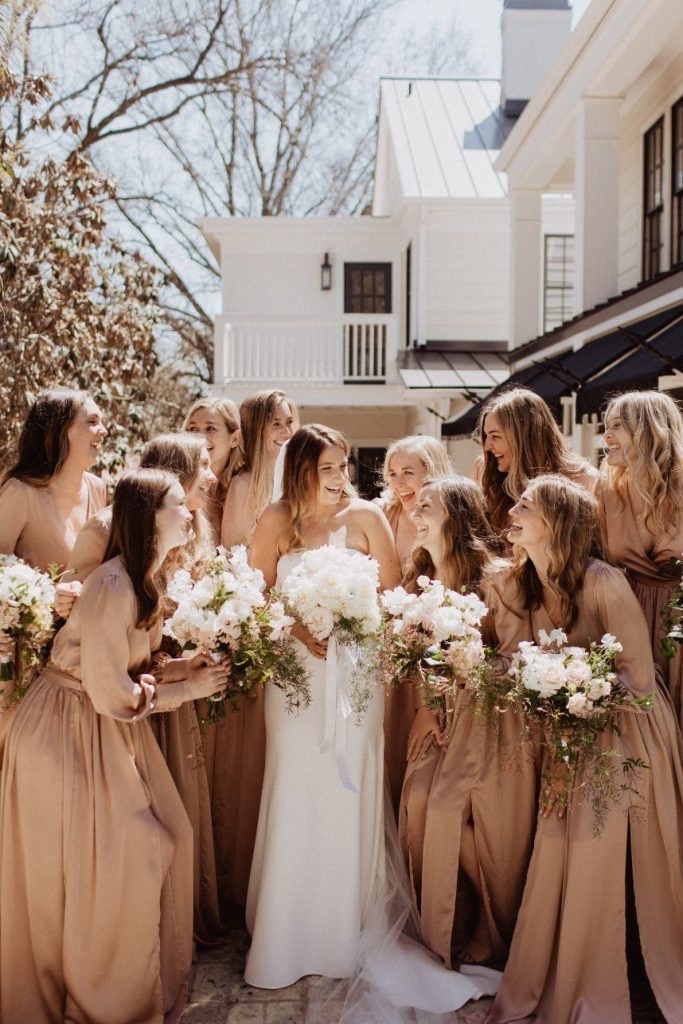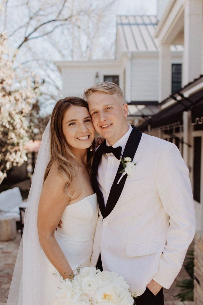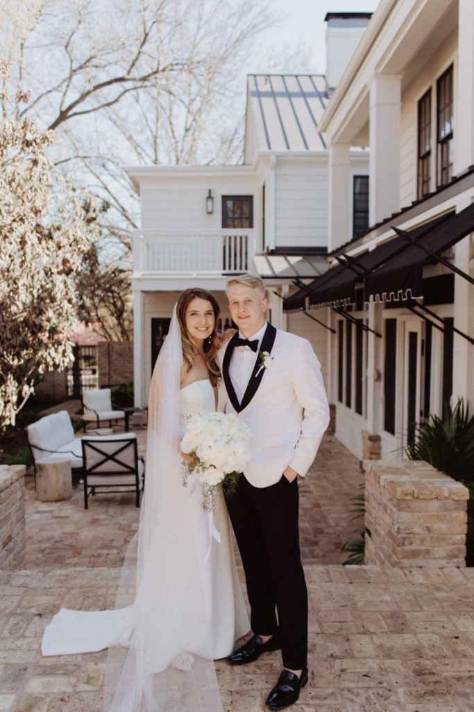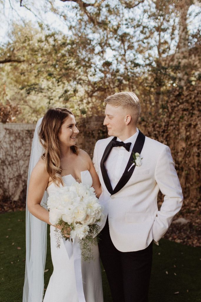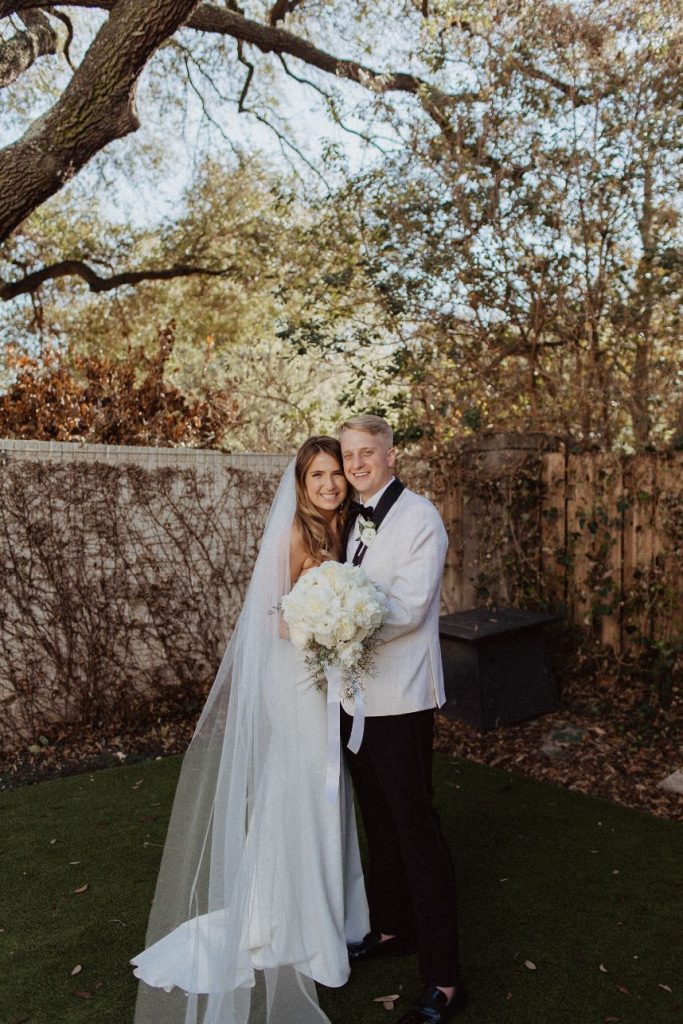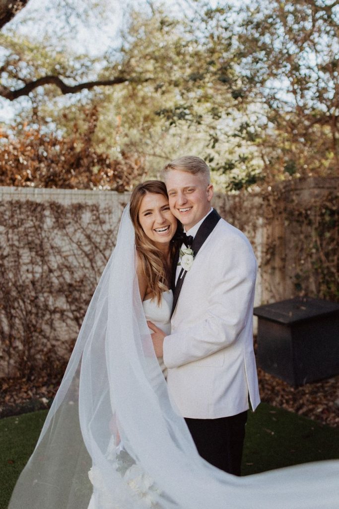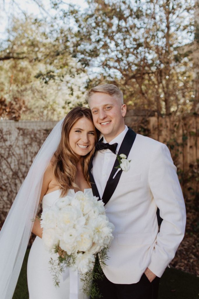 Jennie and Samuel’s intimate wedding is full of beautiful earth tones. The two said their “I dos” in a friend’s backyard due to Covid with their close family and friends. Jennie walked down the aisle as her best friend sang on a perfect sunny spring day. In addition, Samuel’s dad officiated the wedding as guests who couldn’t attend watched on a live stream. The couple had a small reception in the house’s side yard with a mariachi band, cake, champagne, charcuterie, and margaritas. After the couple took pictures with the talented Franny Pullin Photography, they moved their wedding party to Elberly. At the restaurant, guests enjoyed a five-course meal and custom cocktails and finished it off with dancing to a live three-piece jazz band. Finally, after a day filled with so much love, the couple made their way to the LINE Austin Hotel. Keep scrolling to see more! Cheers!