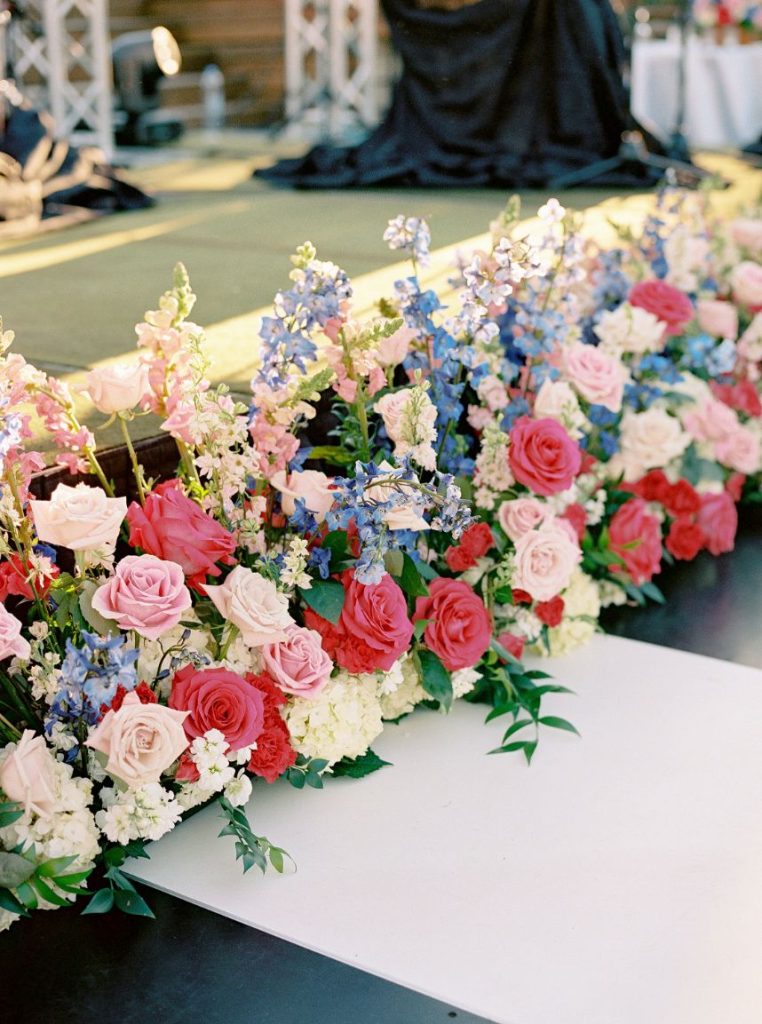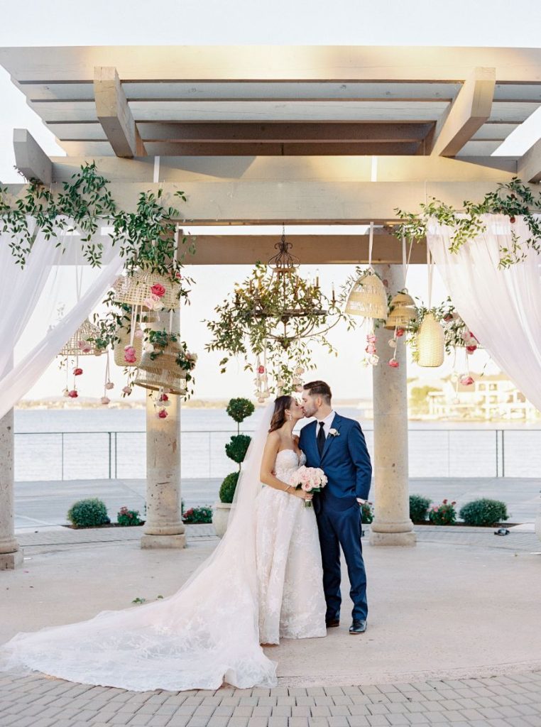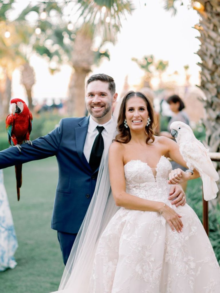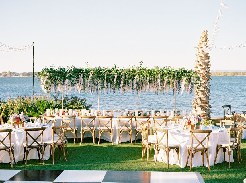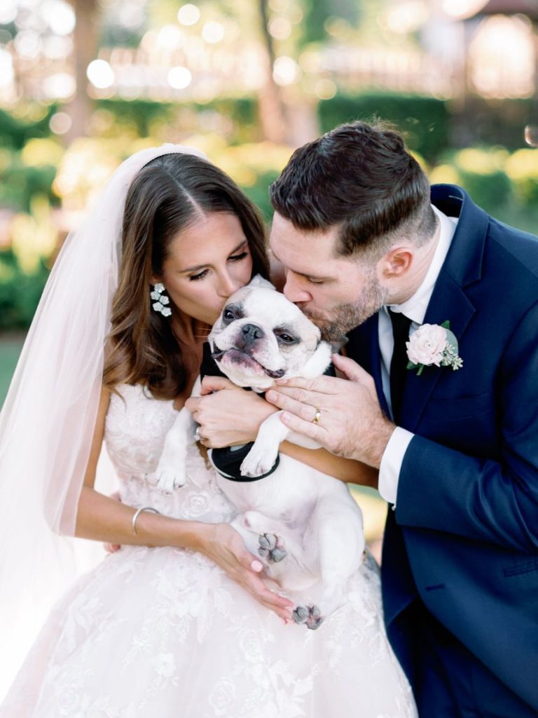 Jordan walked down an aisle lined with gorgeous vibrant blooms from Bouquets of Austin to meet her groom at the altar. Although Taylor said he just had the sun in his eyes, Jordan swears she saw a few tears fall from her man. How could you not shed a few tears when you have a bride as beautiful as Jordan meeting you at the altar. After Jordan and Taylor sealed their love with a kiss, they walked out hand and hand as the new Mr. and Mrs. Wroblewski with their French bulldog Theo. So adorable! Finally, the couple celebrated their love with friends and family with an outdoor reception with decor and rentals from Premiere Events overlooking the lake. Jordan and Taylor danced the night away with their electric band before leaving their reception on a boat as fireworks lit up the sky overhead. Absolutely magical! Cheers to the newlyweds! Keep scrolling to see all the images Tailor James Photography captured.