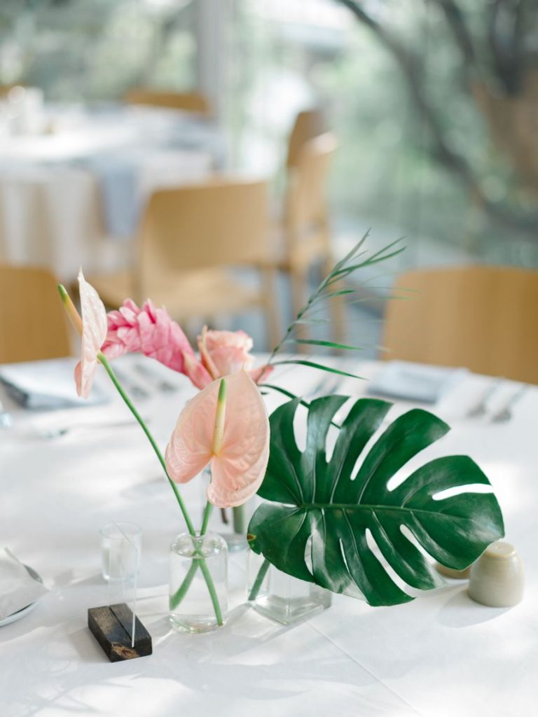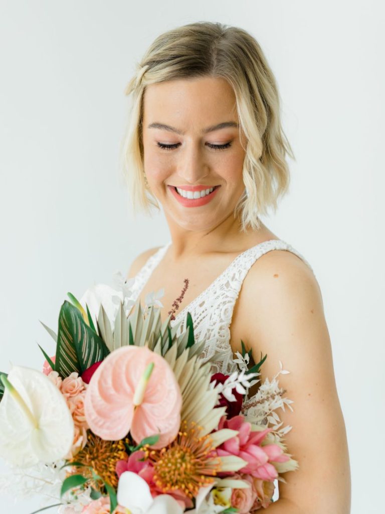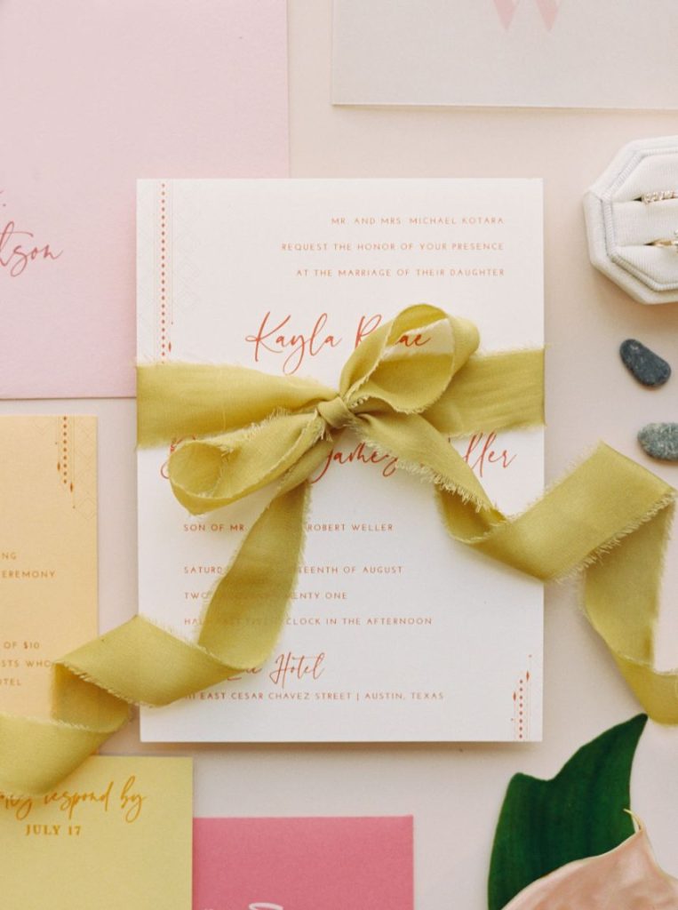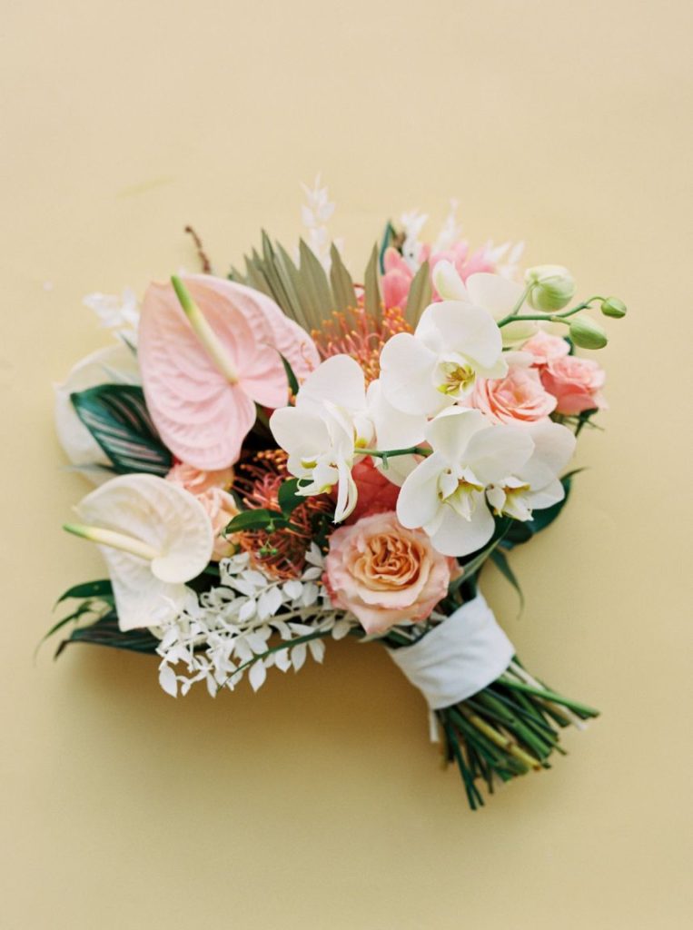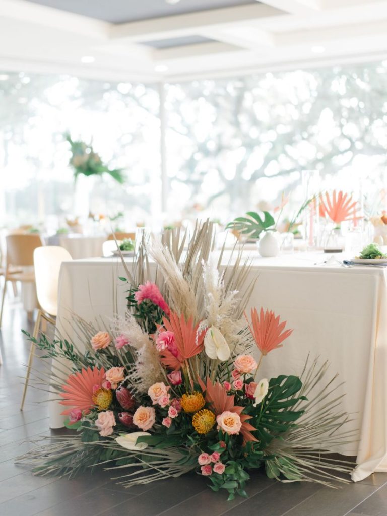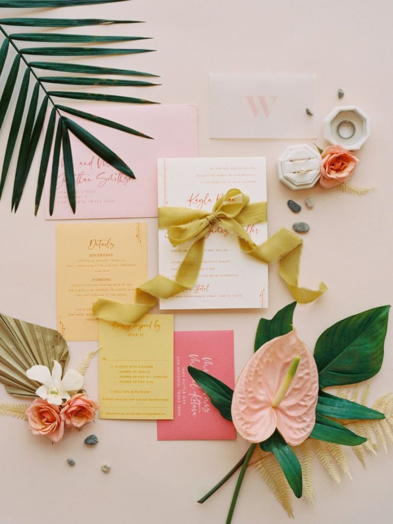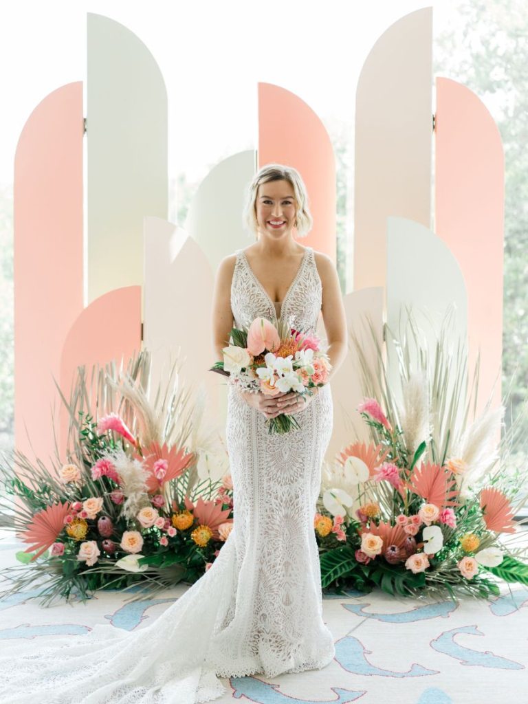 In Kayla and Douglas’ tropical retro wedding, the Palm Springs desert meets Austin, Texas. Kayla and Douglas brought us all the bright and playful colors giving us total Palm Spring vibes. The couple who initially met back in 2016 wanted  a venue with an abundance of natural light. Therefore, when Kayla entered the LINE Austin Hotel, she knew she had found her wedding venue. The space allowed plenty of natural light, and even Douglas said, “this place looks like you.” In addition to the venue fitting the couple’s vibe, it also provided all the amenities and convenience factors Kayla and Douglas were looking for in a venue. After Kayla and Douglas found their perfect venue, Kayla entrusted the creative minds at The Bloom Bar to bring her ideas to life. Kayla wanted florals she’d never seen before, and The Bloom Bar delivered just that. The Bloom Bar matched Kayla’s bright and tropical vibe with a unique combination of florals. Kayla said, “I actually teared up when I saw them setting up the ceremony space. The room turned out better than I could have ever imagined. I am so glad that I picked a vendor I liked and trusted their creativity because it worked well!”