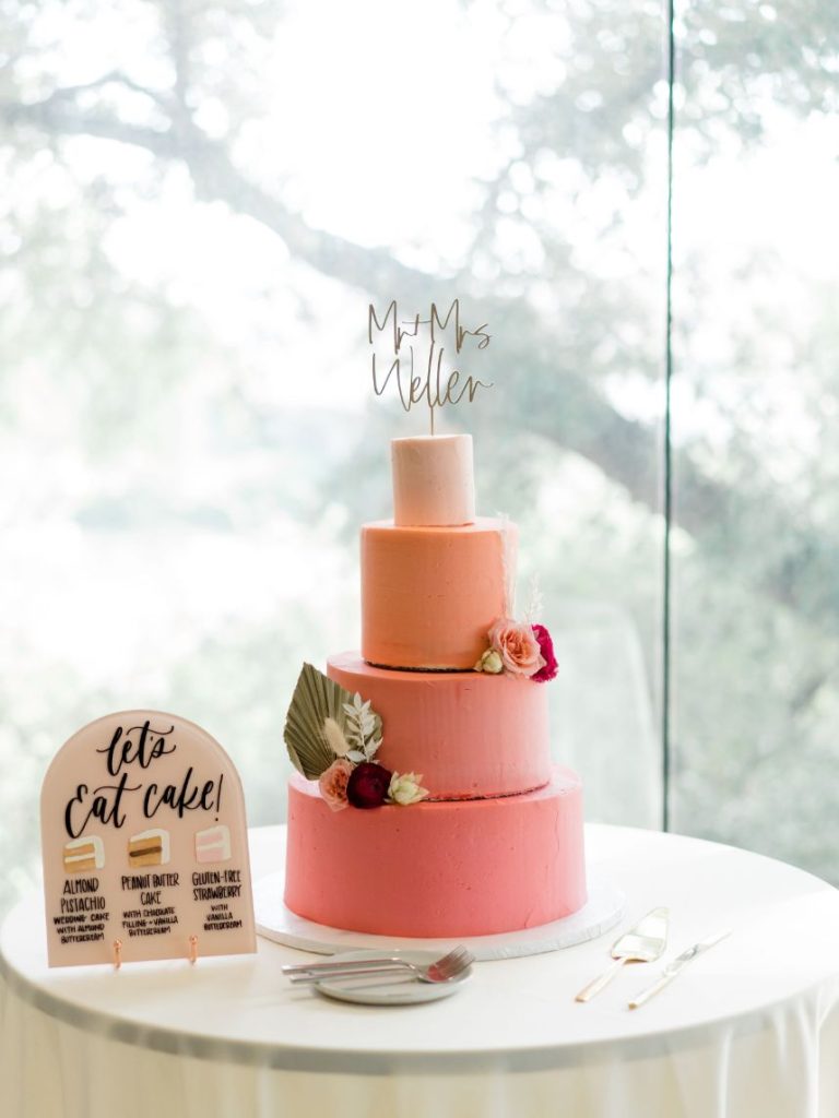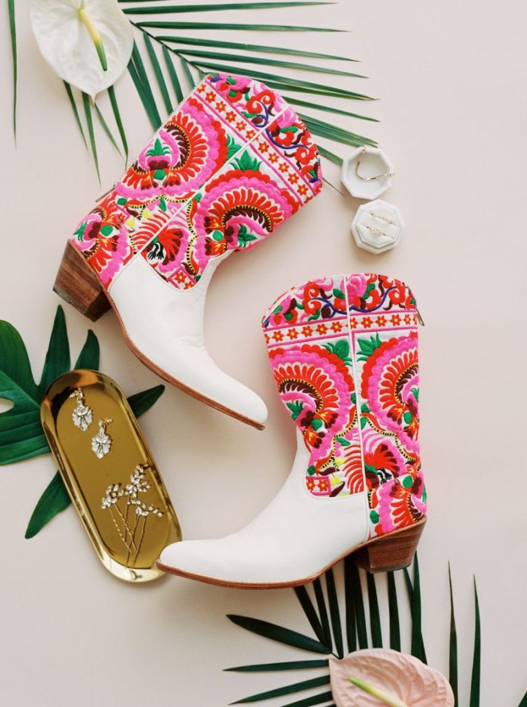 After months of preparation, the time finally came for Kayla to meet her man at the altar. Kayla looked gorgeous with a gown that simply embodied her style and personality, a lace pattern gown. However, our favorite part of Kayla’s whole bridal look is her fabulous shoes. A twist on traditional cowboy boots that matched her entire wedding theme. After Kayla and Douglas said their “I dos,” they made their way into their tropical retro reception space to let the recessional finish. At this moment, Kayla and Douglas were able to take a second to look around and take in that they were finally husband and wife. Such a precious moment! The couple and guests celebrated the night with delicious food from the LINE Austin Hotel and entertainment from Royal Dukes Band. We adore the new Mr. & Mrs. Weller! Keep scrolling to see all the images from their tropical retro wedding. Cheers!