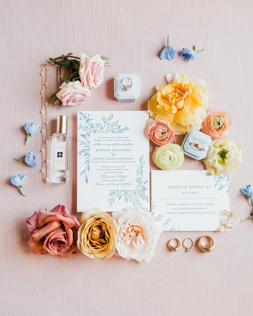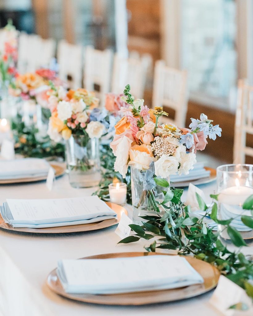 Kennedy & Austin had “something blue” scattered throughout their day. From the blue bridesmaid dresses, to the blue ribbon on the floral bouquets, and even blue linens, we loved the details! ?