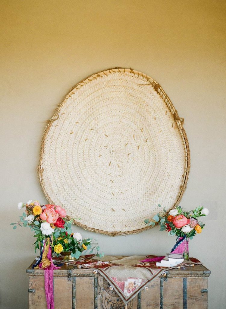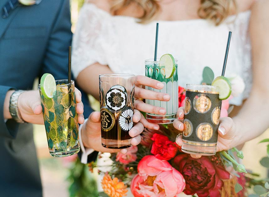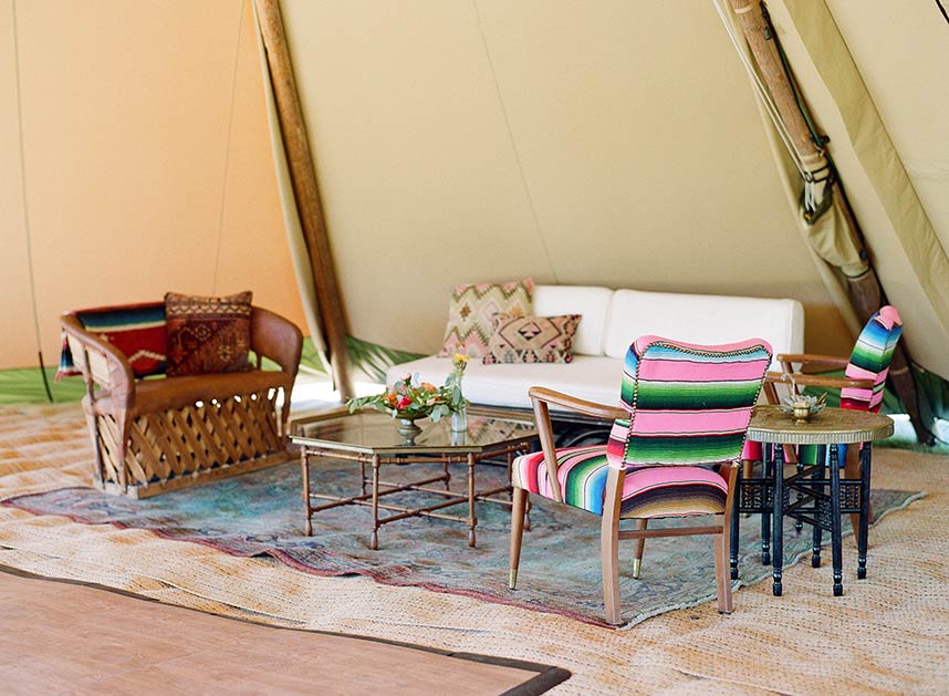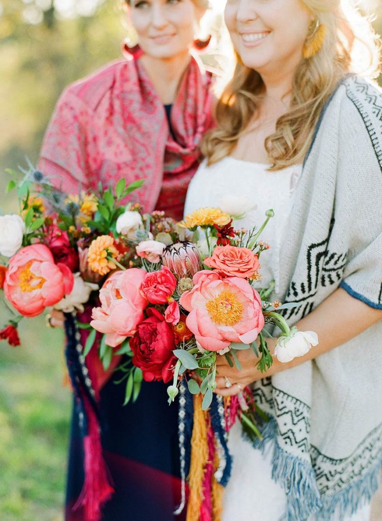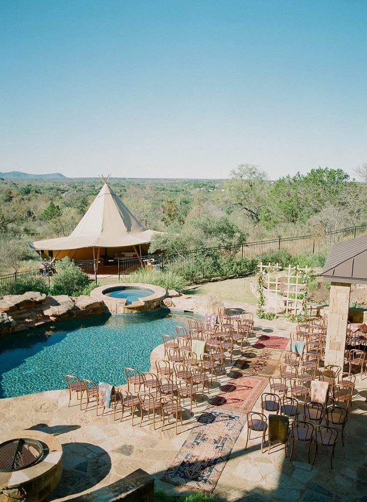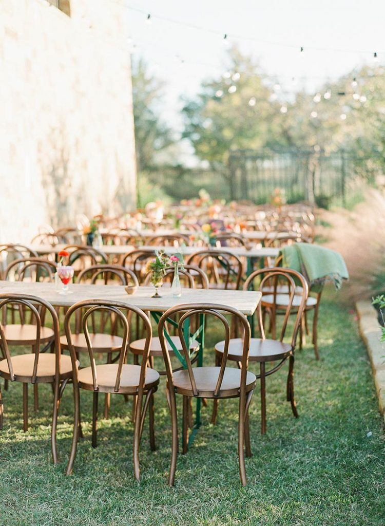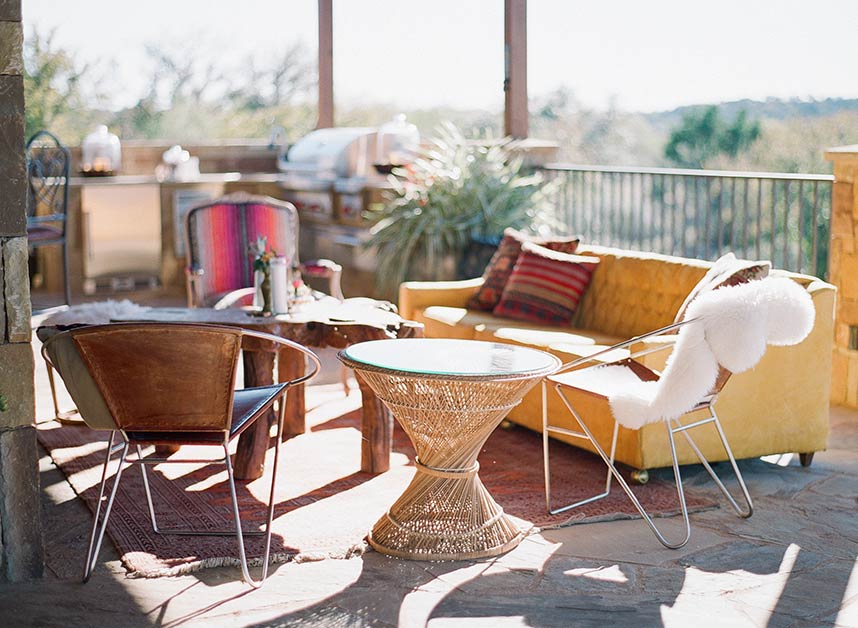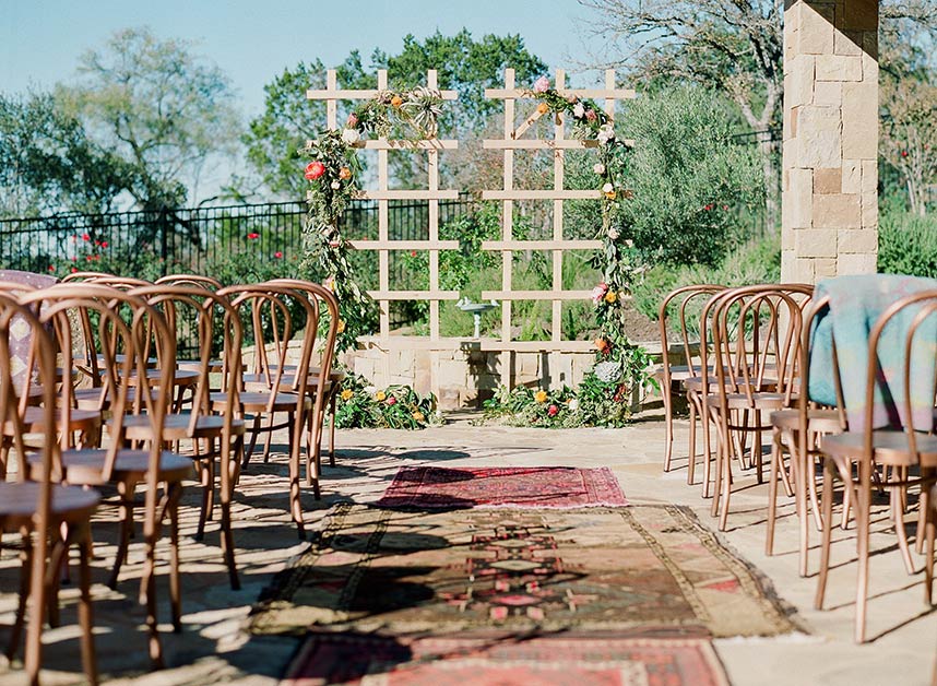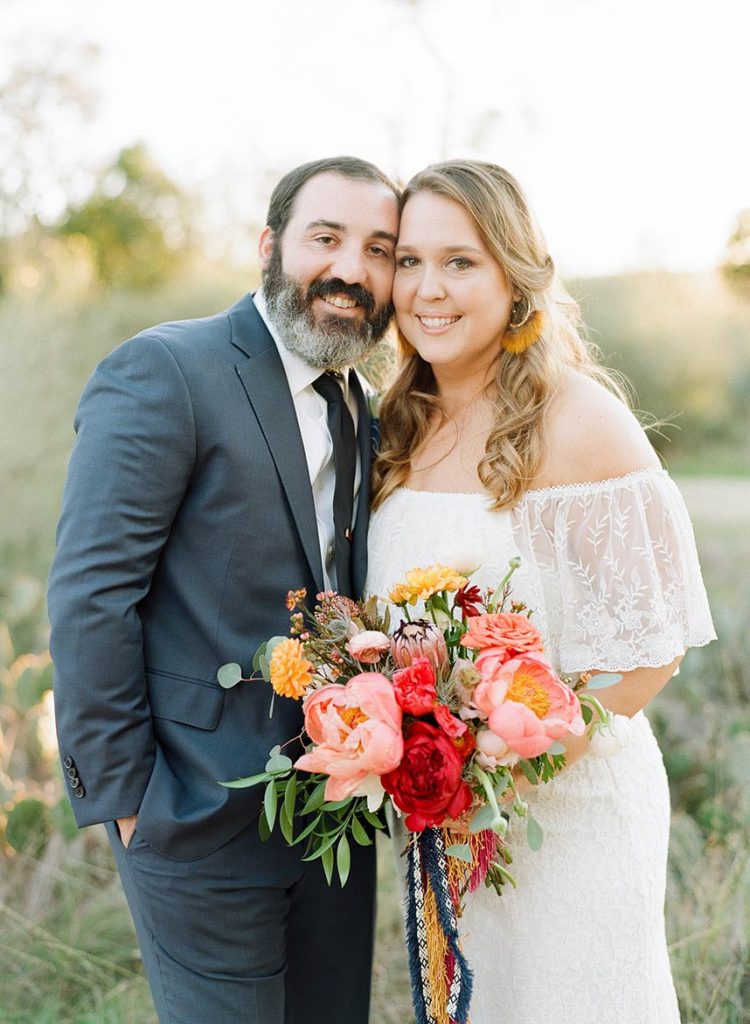 Kym Maxfield and Ben Martin’s outdoor boho Austin wedding features shades of fuchsia, navy and ocher with bursts of orange and yellow that make this unique backyard party so much fun! Decor and rentals from Birch and Brass and lighting by Altared Weddings and Events set the perfect scene for this festive celebration.