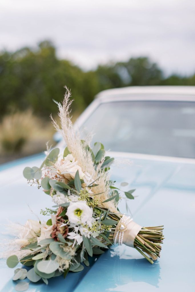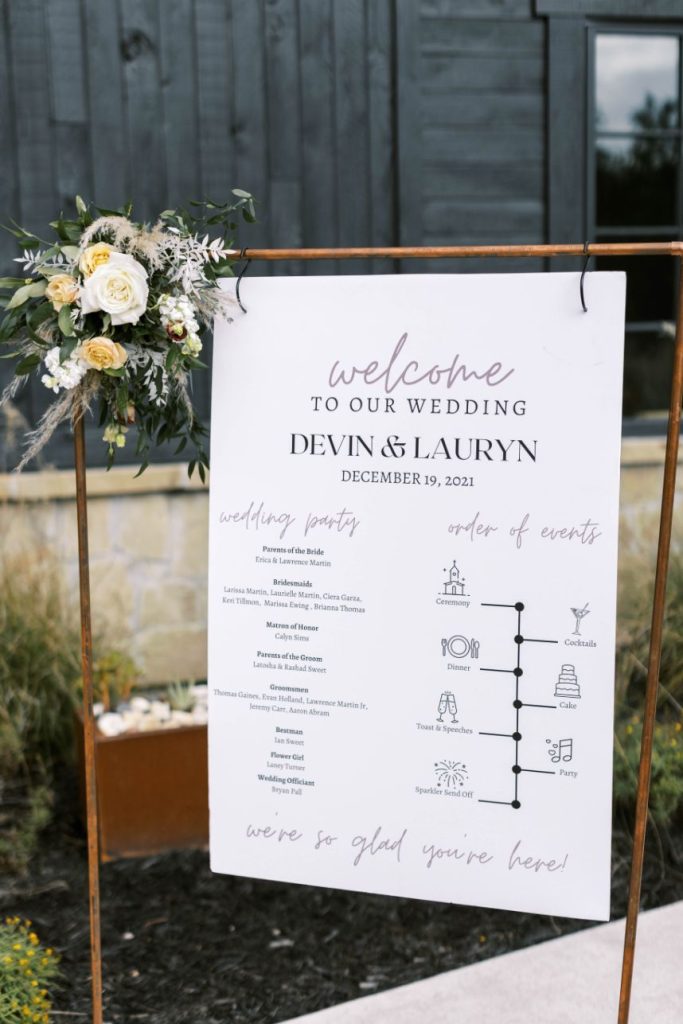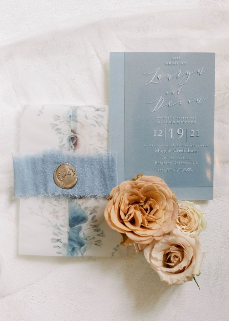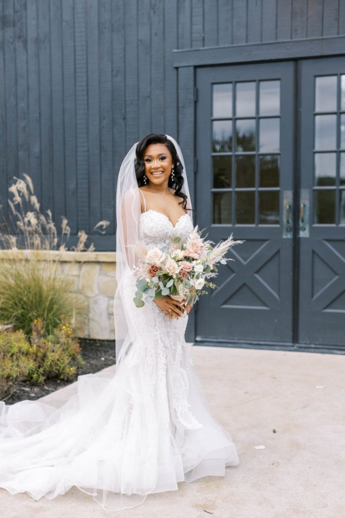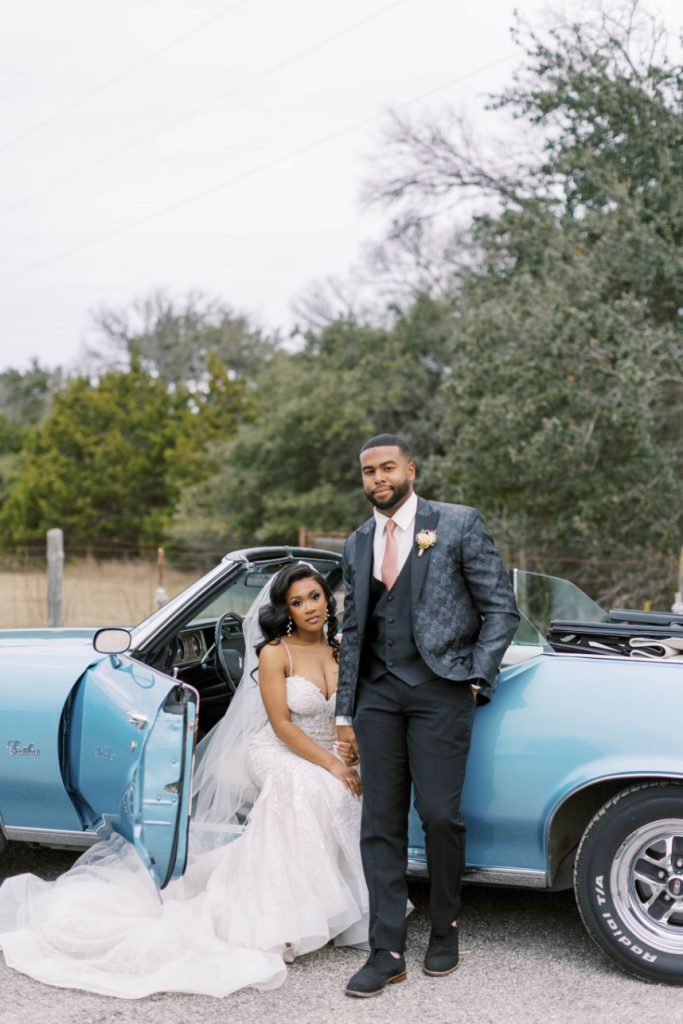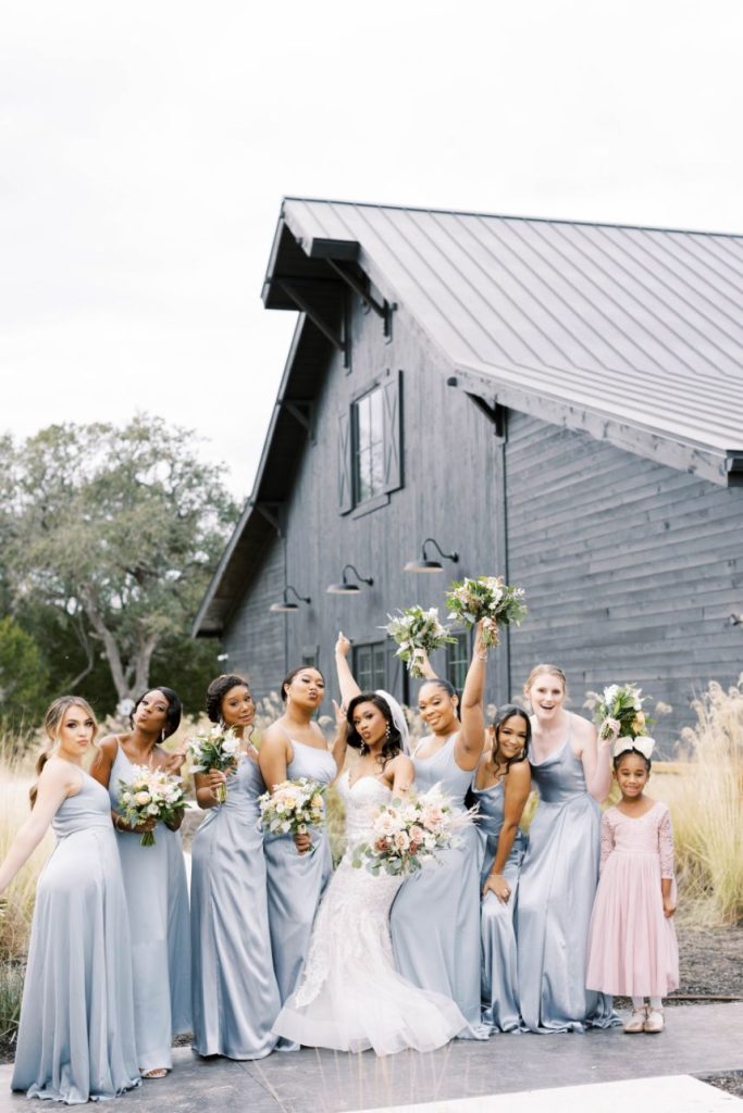 The dusty blue details in Lauryn and Devin’s wedding at Morgan Creek Barn Dripping Springs create a modern twist on a bohemian-style wedding. The couple met during their freshman year of college at North Carolina Central University. Since then, their life has entailed a whirlwind of long-distance as Lauryn finished grad school and Devin travels playing professional baseball. Therefore, Lauryn and Devin felt more than ready to get married and start their life together. Devin proposed to Lauryn while traveling to New Orleans with Lauryn’s family. Lauryn’s cousin suggested the couple take a gondola ride, which Lauryn thought nothing of. However, as the couple approached a bridge Lauryn turned around to Devin down on one knee, and a sign above them on the bridge read, “Will you marry me?”. Their families watched the proposal above on the bridge as Lauryn said “yes” to her best friend.