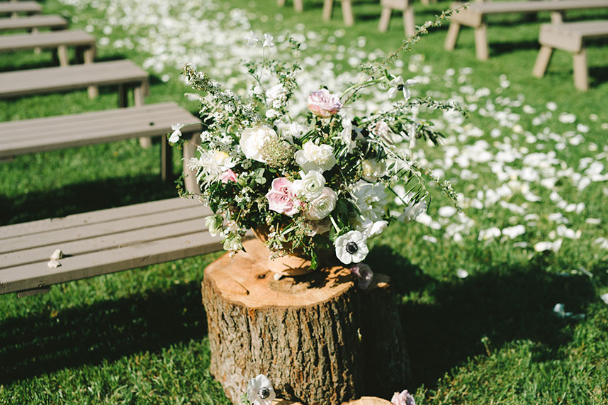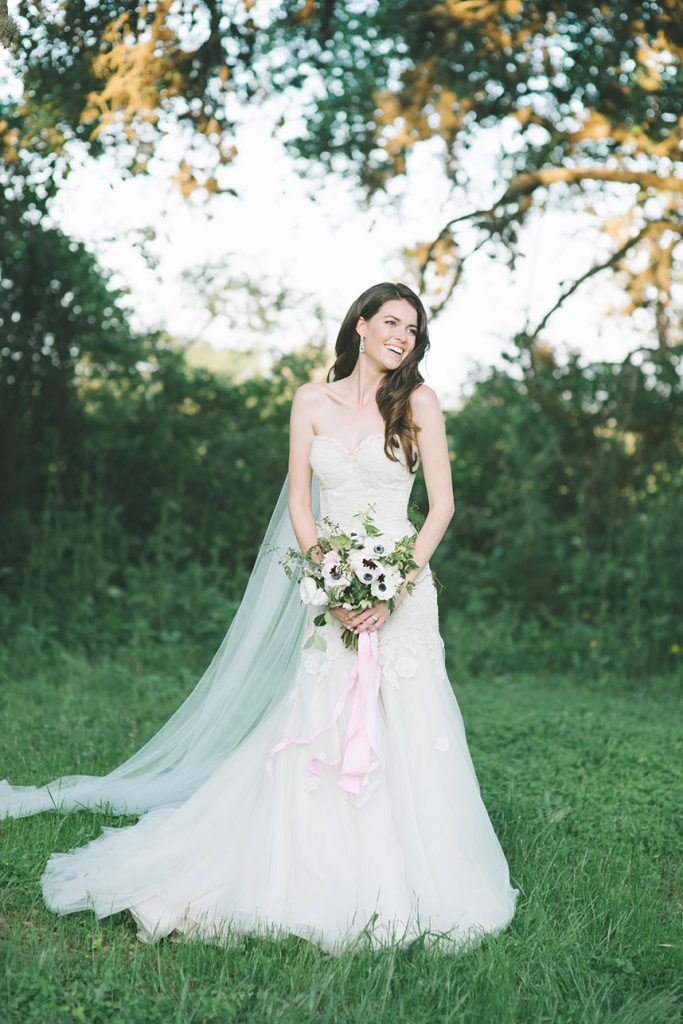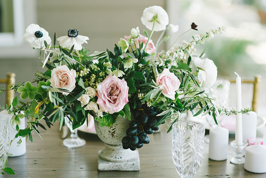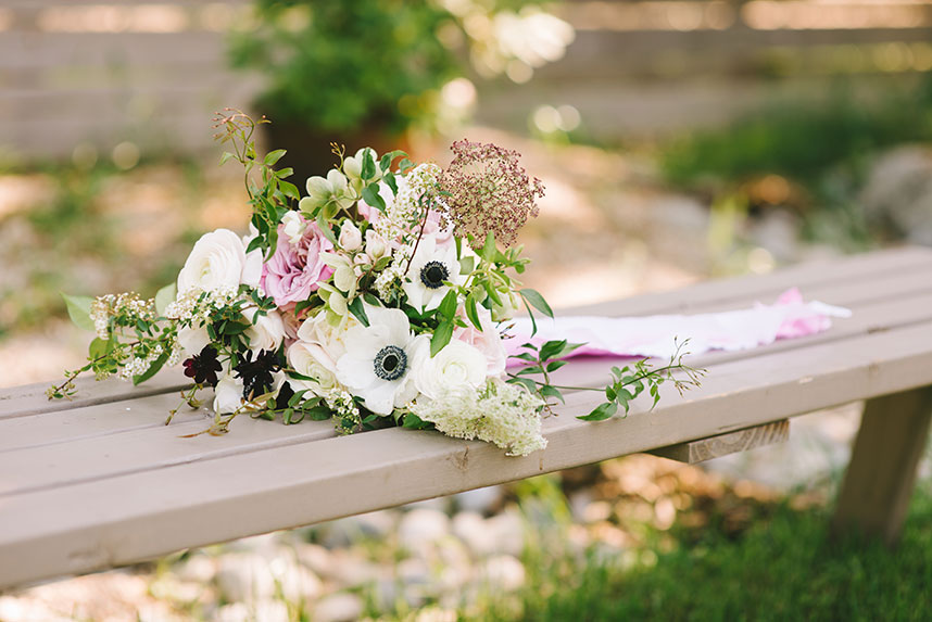 BEAUTIFUL BLOOMS: The bride carried a garden-style bouquet designed by Davy Gray with a neutral palette of ivories and soft pinks. The bouquet featured roses, ranunculus, anemone, sweet pea and astrantia flowers with pieris, astilbe, snowberry and flowering oregano as textural accent. Touches of chocolate cosmos were added for a hint of contrast and romance. Lindsay provided a dip-dyed ribbon in various shades of pink to be wrapped and dangling from the bouquet.