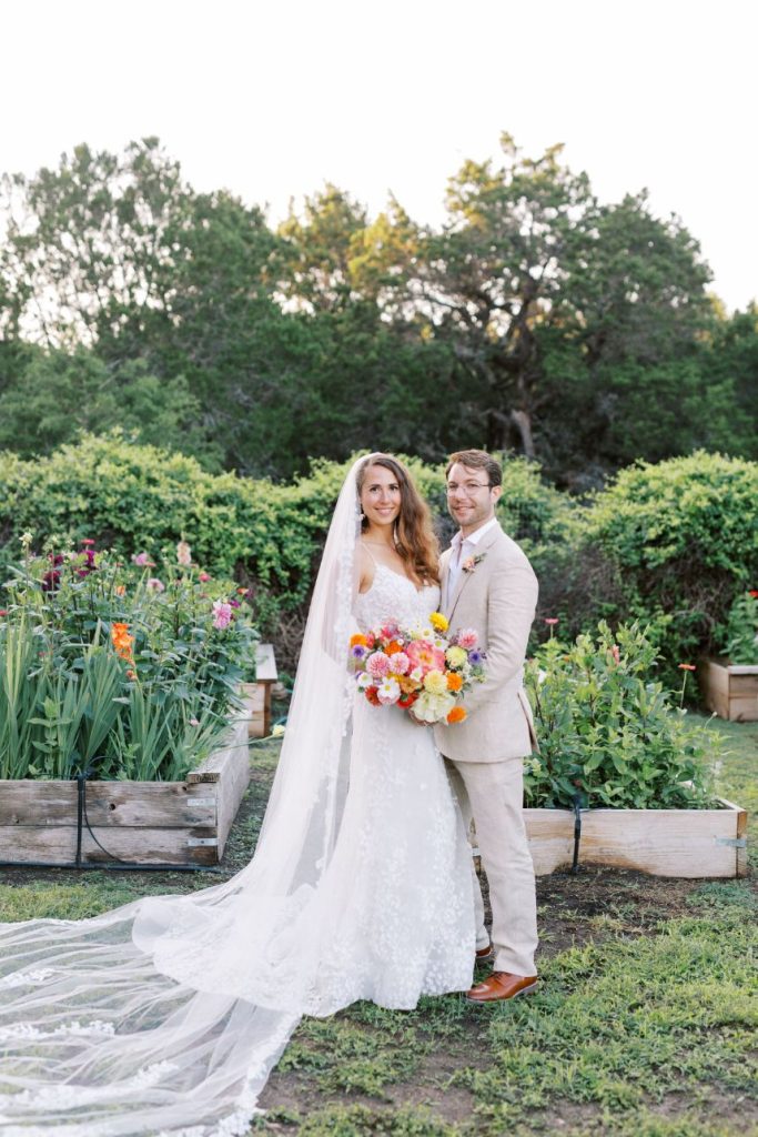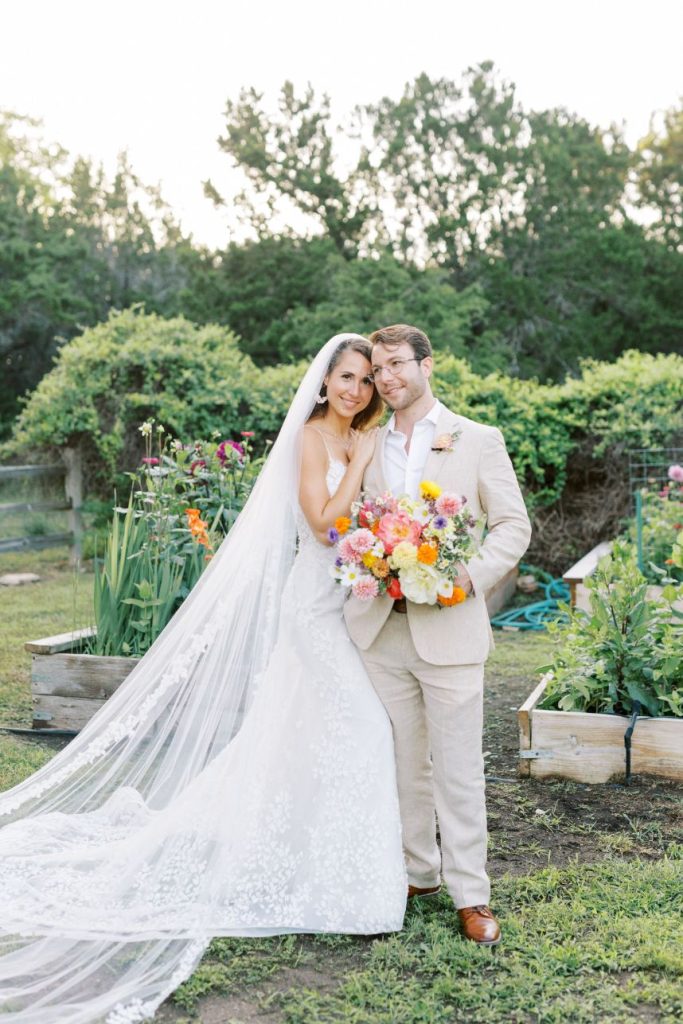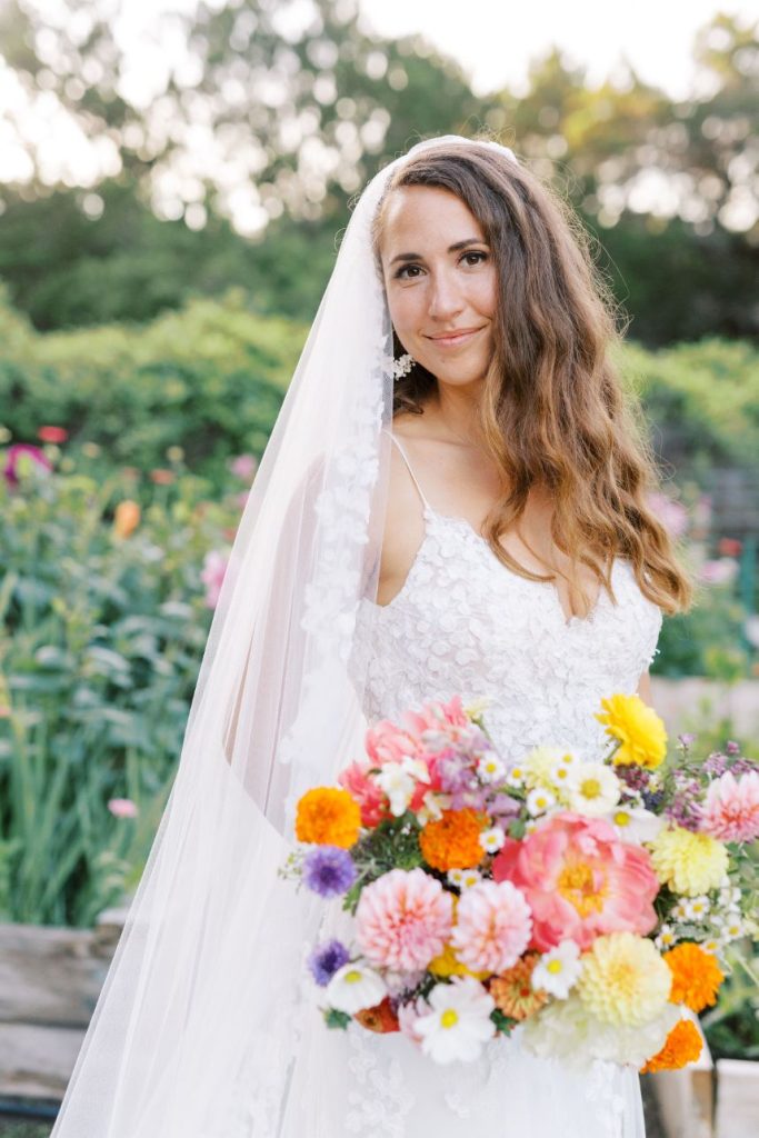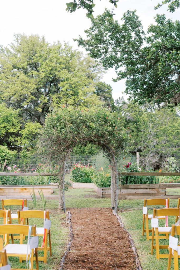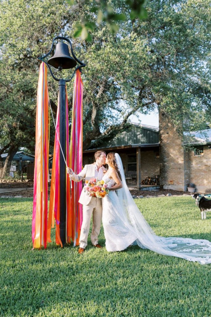 With constant thunderstorm warnings on the morning of their big day, Maggie and her bridesmaids got ready as they watched the storm roll in over the field. After watching the radar all day, the storm stopped an hour before the ceremony began. From a small window, Maggie watched as her bridesmaids and family walked down the beautiful mulch aisle to the garden. Reality set in as Maggie grabbed her father’s arm and proceeded through the garden to meet her groom. Maggie and Keaton stood under an arch of blooming honeysuckle, under a giant oak tree, with a backdrop of hundreds of brilliant summer zinnias and Dahlias. After becoming husband and wife, a bell in the front yard rang seven times to honor their marriage. The couple walked down the aisle to streaming ribbons and ringing bells, all the way to the bell in the front yard to ring it themselves.