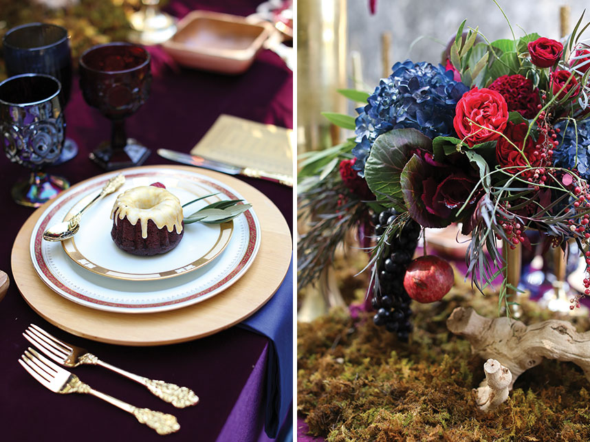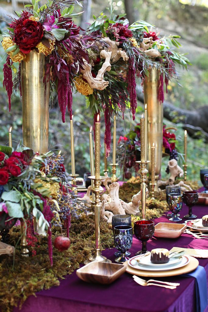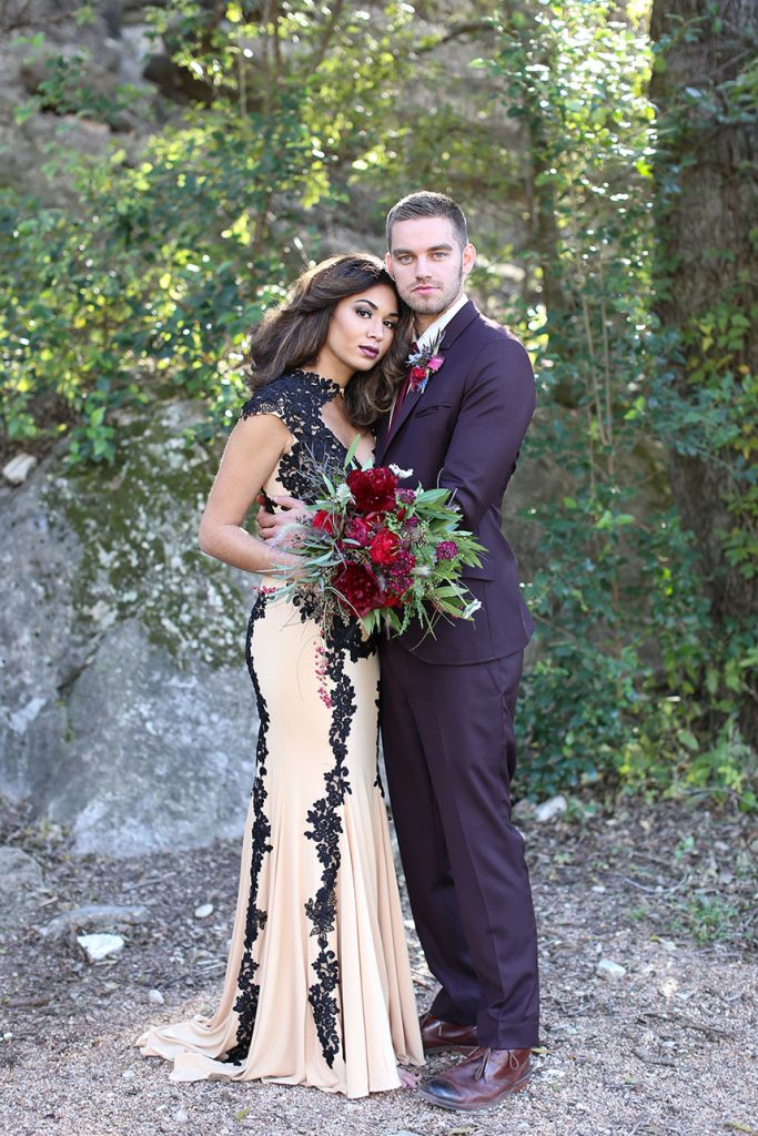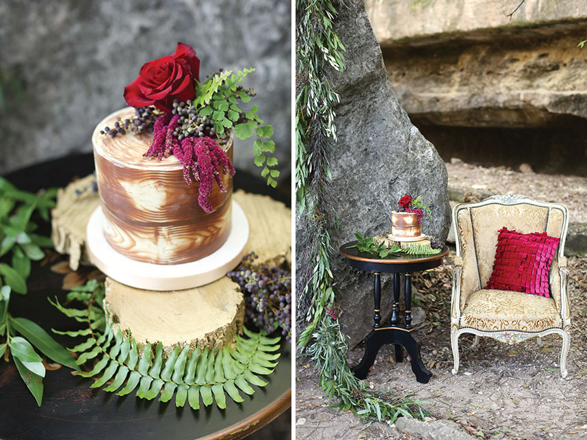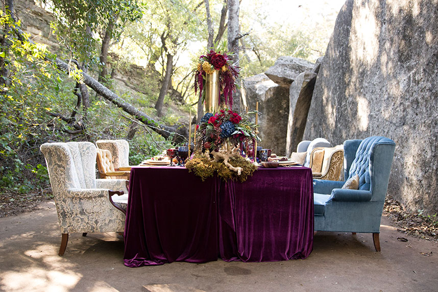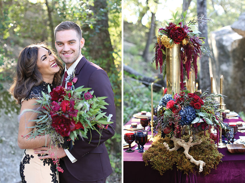 We can’t get enough of this gorgeous Marsala inspired styled shoot from Austin wedding photographer Sophie Epton Photography! Royal hues of eggplant purple, deep periwinkle blue, fuchsia and red send a seasonal jolt of color into the airy trees and rocky landscape. The richly hued, overflowing florals and the gilded details from Bee Lavish Vintage create a sense of romance and drama, perfect for the bride who wants to make a statement. How about that amazing painted cake from Simon Lee Bakery? A café au lait colored dress with an elegant black lace overlay for the bride and a handsome plum-colored suit for the groom are just the ticket to pull the whole scene together. Cheers!
