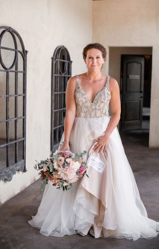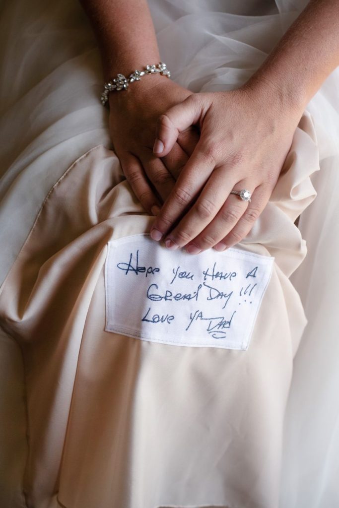 After a sentimental proposal on the beach in Kasey’s hometown, the meaningful details continued throughout their wedding day. Kasey’s dad passed away from cancer, and she was determined to honor him throughout the day. Some of the ways she achieved this was having her dad’s only brother walk her down the aisle. Her mom also walked down the aisle to an instrumental version of one of her dad’s favorite songs. But one of the sweetest details of all – she had a sample of her dad’s handwriting embroidered on the inside of her dress!