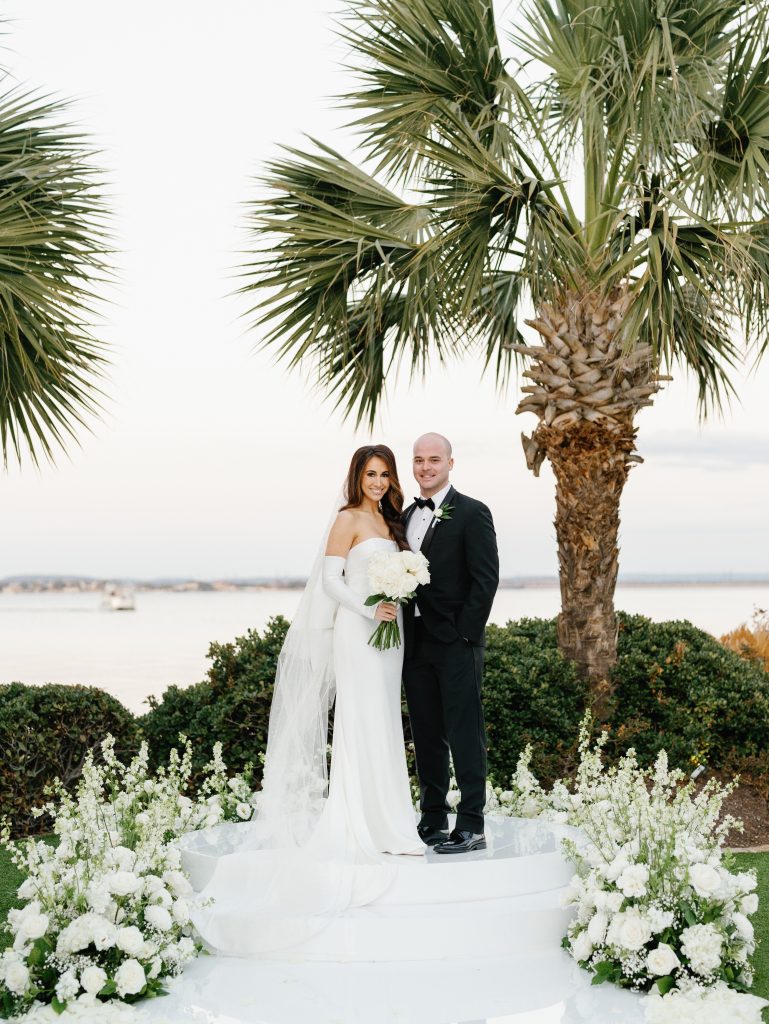 The ceremony took place beneath a canopy of trees, with vibrant floral pillars and lush greenery by Floral Designs by Randi framing the couple as they said “I do.” The blooms, in bold shades of coral, fuchsia, orange, and gold, carried through to the reception where tables came alive with tropical centerpieces, colorful taper candles, and patterned linens.