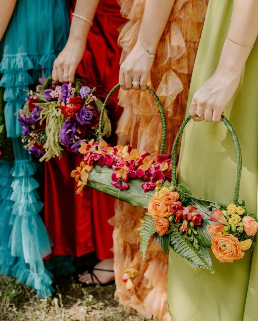 The wedding party carried the vibrant theme seamlessly, with bridesmaids in mix-and-match gowns ranging from ruffled turquoise to citrus green. Instead of traditional bouquets, they held floral handbags crafted from palm leaves and bursting with blooms — a fashion-forward twist we can’t get enough of.