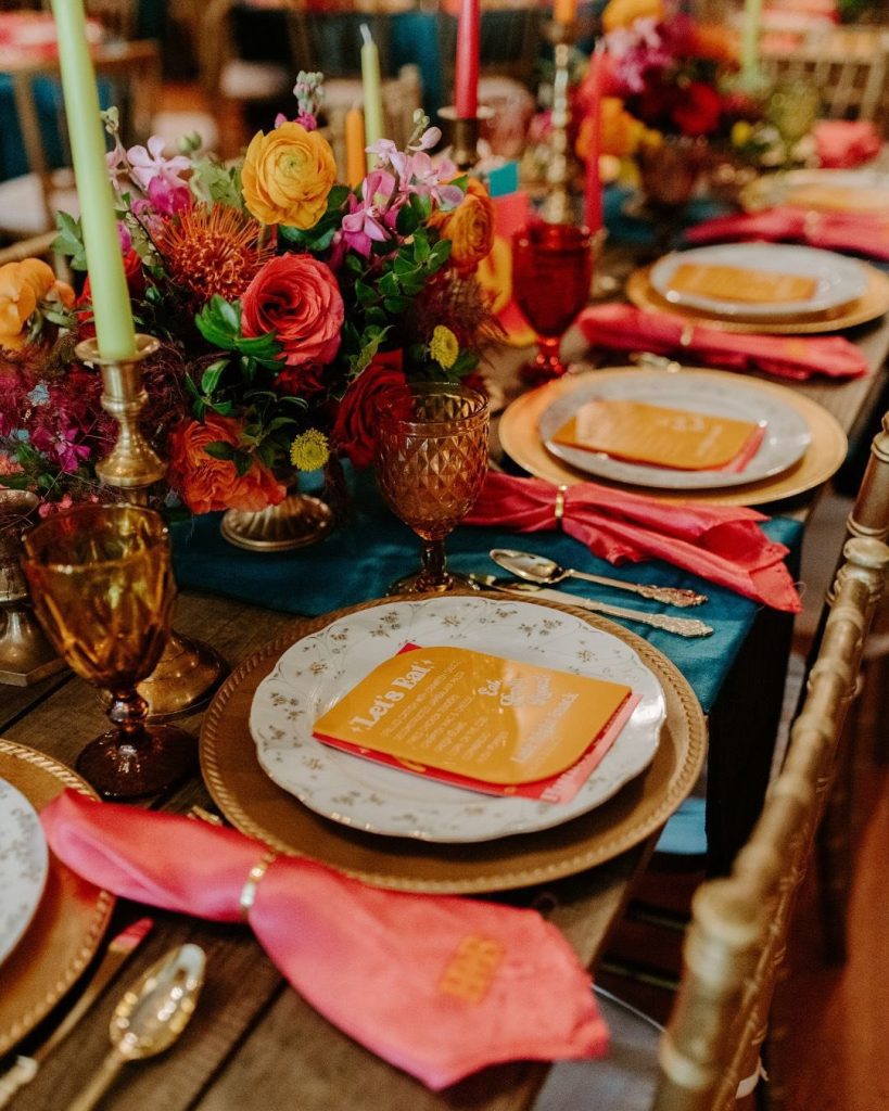 Inside the reception space, guests were treated to a stunning tablescape layered with texture and color — think teal runners, amber glassware, gold chargers, and coral napkins tied neatly at each setting. Every detail was thoughtfully designed to feel joyful, fresh, and unmistakably “Hunter and Blake.”