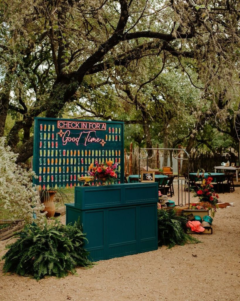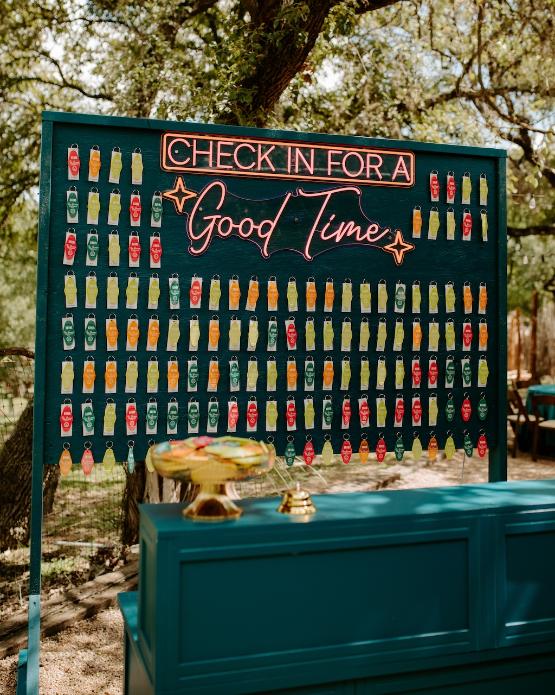 Guests were greeted with one of the most unique seating charts we’ve seen — a hotel-style “check-in” desk complete with colorful room keys and a glowing neon sign that read “Check in for a Good Time.” It set the tone for a weekend that was equal parts playful and polished.
