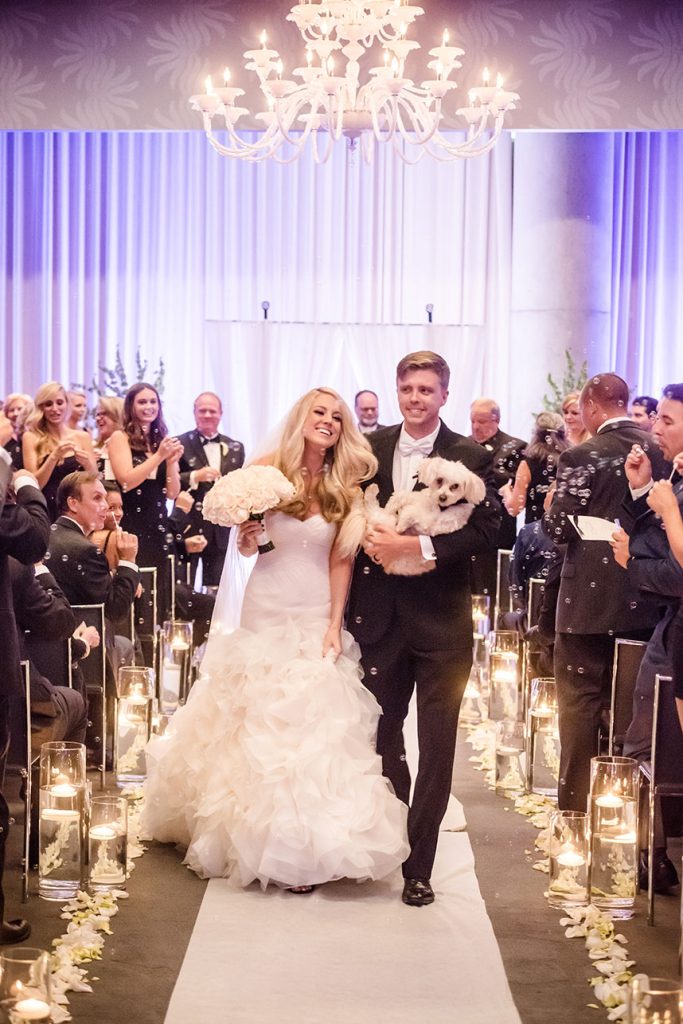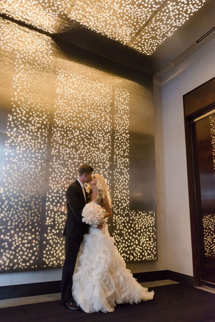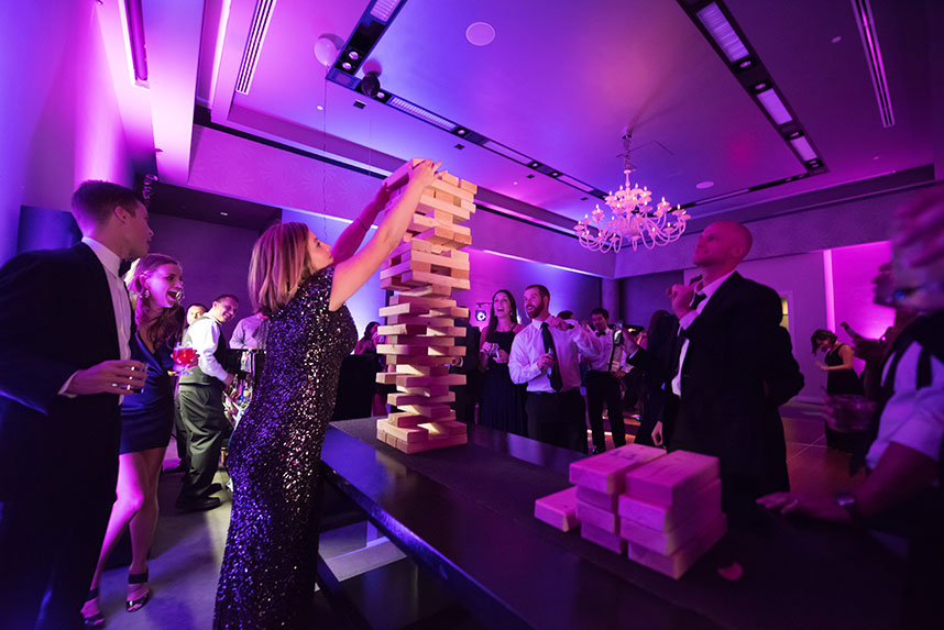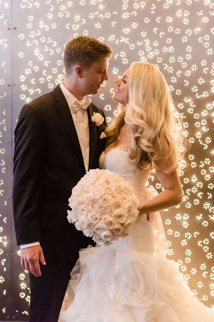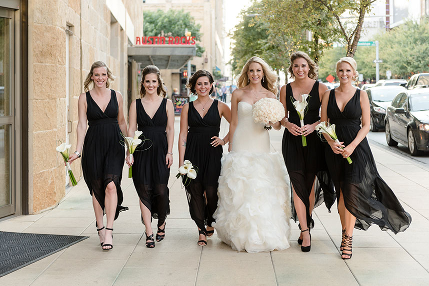 THE SETTING: Lauren and Dale had a non-traditional, modern black and white wedding at the W Austin. Black cocktail attire was required for their guests. They had giant black and white balloons that filled the room during the cocktail hour, and giant Jenga and cornhole were set up for entertainment during the reception!