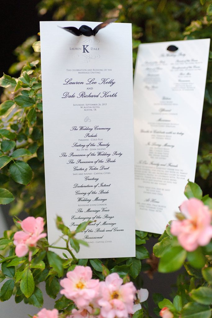 DELICIOUS DISHES: The food and drink was by far one of Lauren and Dale’s favorite parts of the wedding! They served a signature cocktail, the MosKorth Mule, a spin on the Moscow Mule with added cucumber. The appetizers included mini Maine lobster rolls, candied pork belly on smoked cheddar croquet, tuna tartar in a cone, parmesan gnocchi and a full out sushi and sashimi bar. During the reception a three-course meal was served. The W Austin prepared a mixed green salad with warm chevre goat cheese dressing and the guest’s choice between vanilla bourbon braised beef short rib, pan seared chicken breast or roasted vegetable lasagna roll. The wedding cake was vanilla-based with fresh cut strawberries and vanilla Bavarian cream. The groom’s cake was a Texans chocolate-based cake!