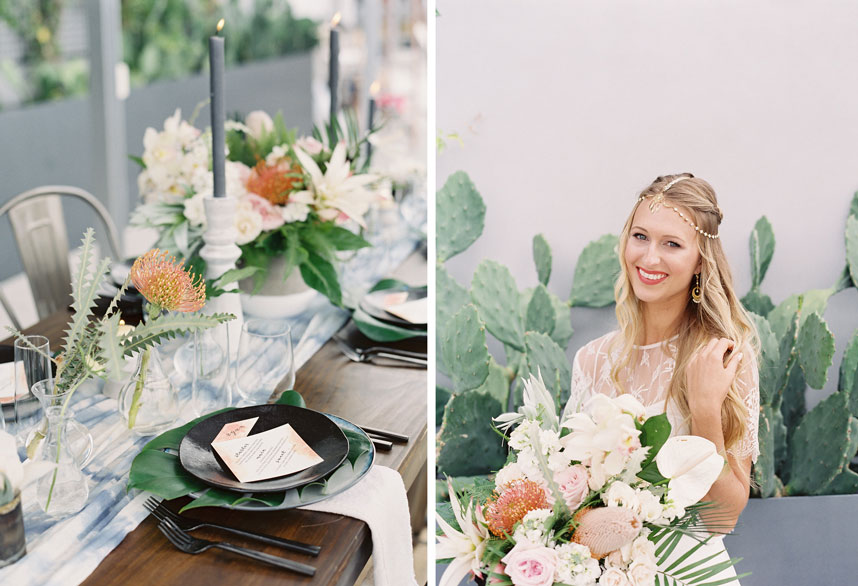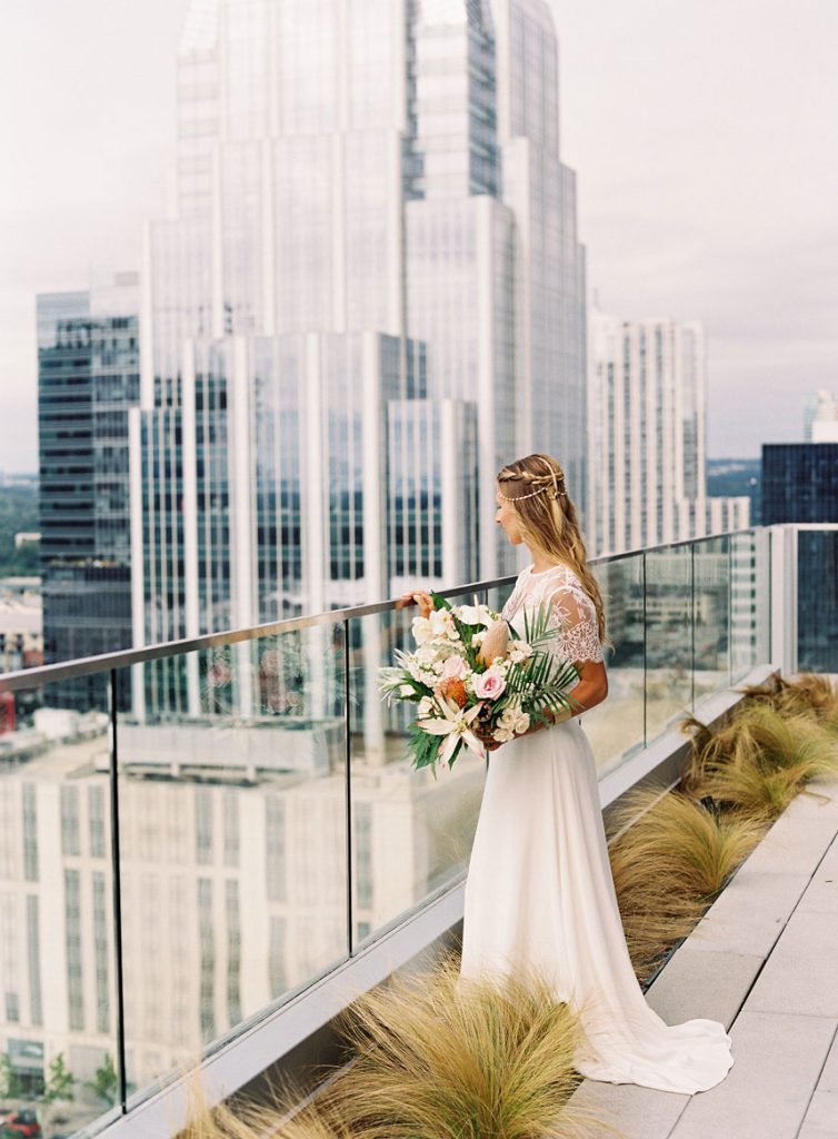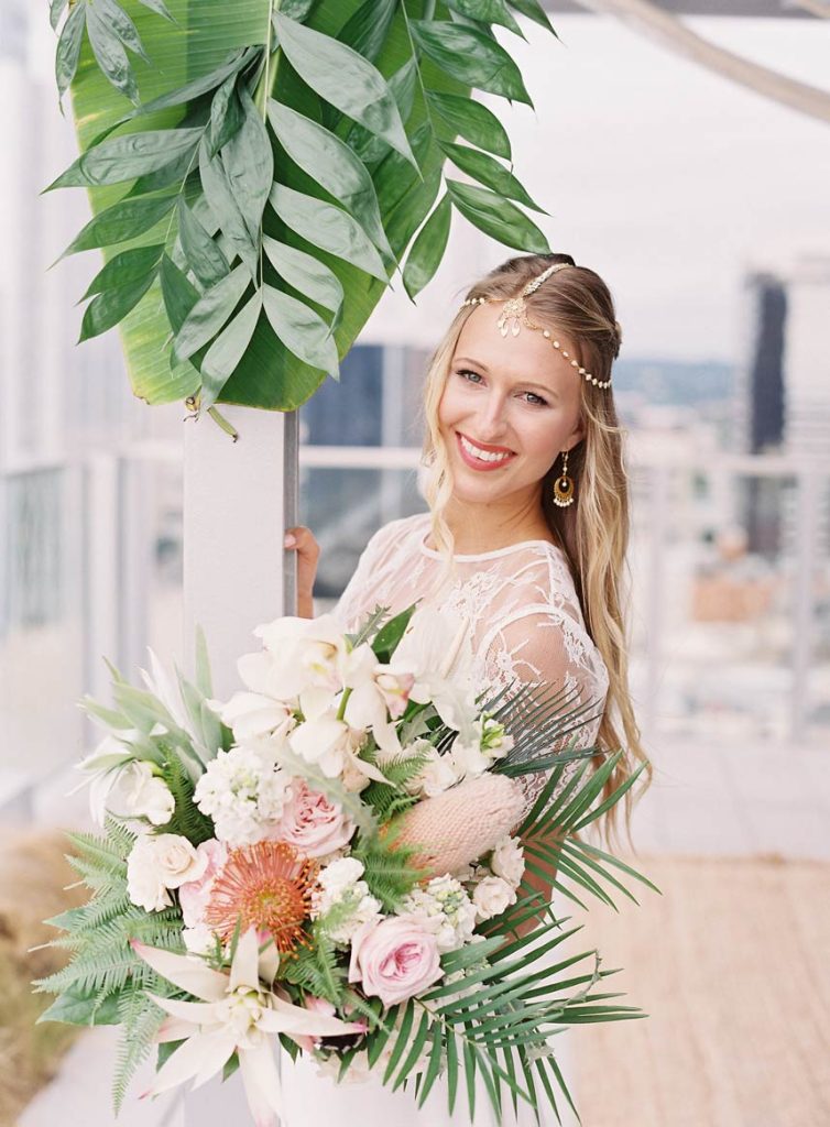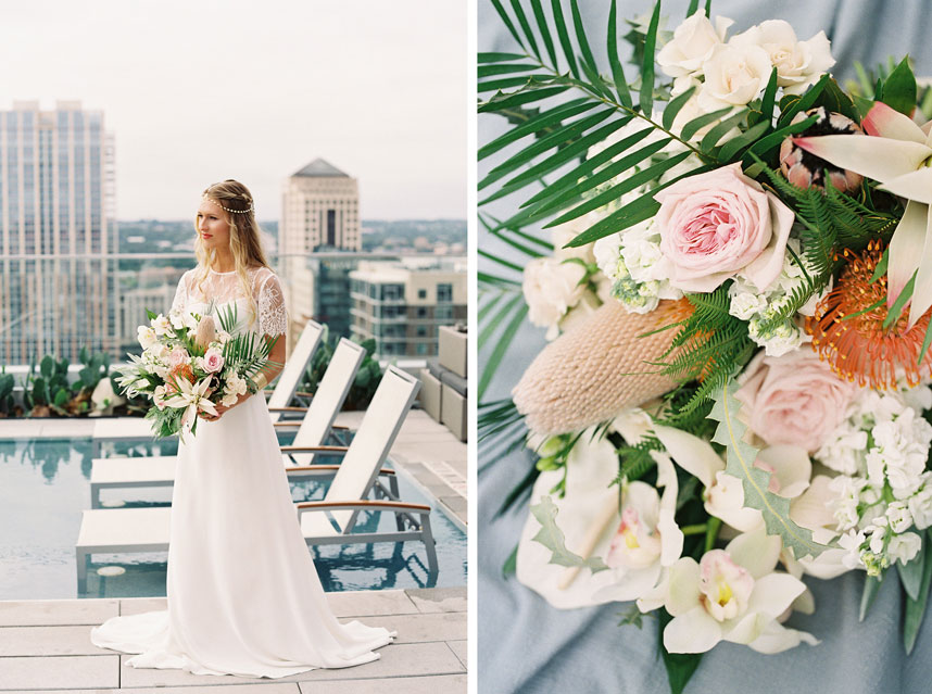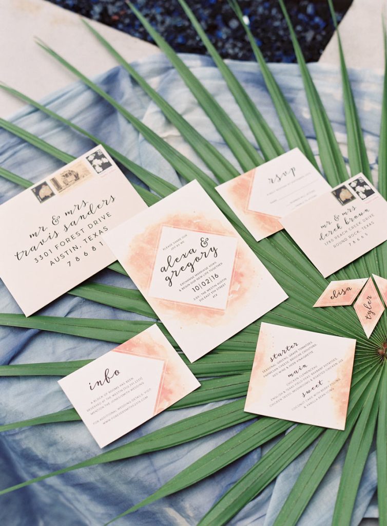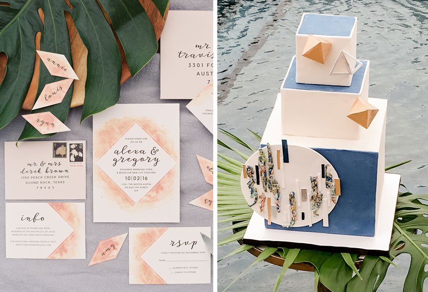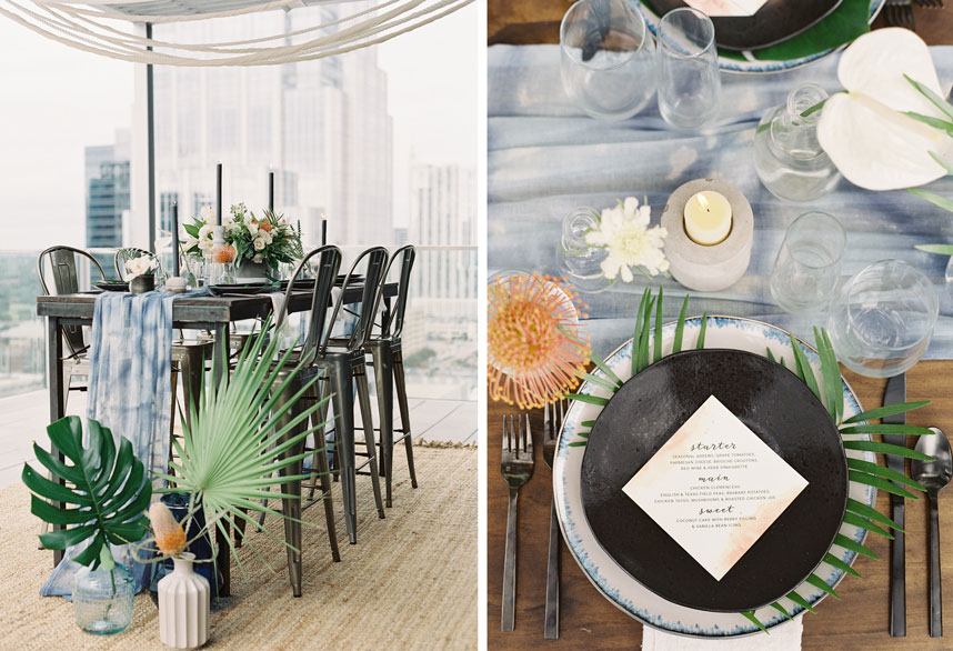 This botanical inspiration shoot by Wild Sky Events hosted at The Westin Austin Downtown is packed full of tropical elements and modern charm. Kelly from Mint Photography captured every gorgeous detail from the tablescape to the beautiful model. The bride wore an elegant lace two piece gown and accessories from Unbridled. Lavish Beauty styled gorgeous loose curls with an added braid, designed around this beautiful headpiece from Unbridled. Bring your design to life with tropical florals and geometric shapes in everything from the modern cake by Blue Note Bakery to the invitations designed by Peach Paper and Design. We’re still crushing over this tablescape full of tapered candles and gorgeous tropical floral inspiration by Remi and Gold. Marquee Event Group transformed this space with their stylish modern chairs, flatware, and glassware while Loot Vintage Rentals finished off the the look with a custom dyed table runner, rug and farm table to match. We loved seeing the creativity behind each scene, as Loot Vintage Rentals designed a handmade rope installation that added so much character to this structured space. Which was also the perfect compliment to this eye-catching botanical installation from Remi and Gold. Your guest are sure to be impressed! Cheers to this incredibly talented team, we simply can’t get enough!